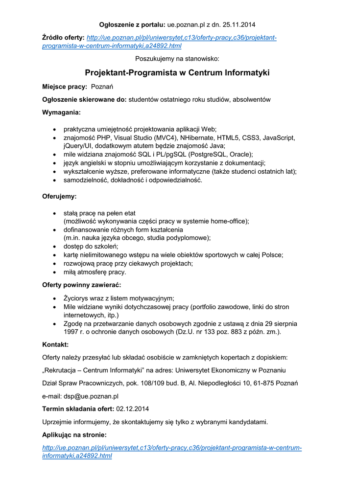 Ogłoszenie z portalu: ue.poznan.pl z dn. 25.11.2014 Źródło oferty: http://ue.poznan.pl/pl/uniwersytet,c13/oferty-pracy,c36/projektantprogramista-w-centrum-informatyki,a24892.html Poszukujemy na stanowisko: Projektant-Programista w Centrum Informatyki Miejsce pracy: Poznań Ogłoszenie skierowane do: studentów ostatniego roku studiów, absolwentów Wymagania: praktyczna umiejętność projektowania aplikacji Web; znajomość PHP, Visual Studio (MVC4), NHibernate, HTML5, CSS3, JavaScript, jQuery/UI, dodatkowym atutem będzie znajomość Java; mile widziana znajomość SQL i PL/pgSQL (PostgreSQL, Oracle); język angielski w stopniu umożliwiającym korzystanie z dokumentacji; wykształcenie wyższe, preferowane informatyczne (także studenci ostatnich lat); samodzielność, dokładność i odpowiedzialność. Oferujemy: stałą pracę na pełen etat (możliwość wykonywania części pracy w systemie home-office); dofinansowanie różnych form kształcenia (m.in. nauka języka obcego, studia podyplomowe); dostęp do szkoleń; kartę nielimitowanego wstępu na wiele obiektów sportowych w całej Polsce; rozwojową pracę przy ciekawych projektach; miłą atmosferę pracy. Oferty powinny zawierać: Życiorys wraz z listem motywacyjnym; Mile widziane wyniki dotychczasowej pracy (portfolio zawodowe, linki do stron internetowych, itp.) Zgodę na przetwarzanie danych osobowych zgodnie z ustawą z dnia 29 sierpnia 1997 r. o ochronie danych osobowych (Dz.U. nr 133 poz. 883 z późn. zm.). Kontakt: Oferty należy przesyłać lub składać osobiście w zamkniętych kopertach z dopiskiem: „Rekrutacja – Centrum Informatyki” na adres: Uniwersytet Ekonomiczny w Poznaniu Dział Spraw Pracowniczych, pok. 108/109 bud. B, Al. Niepodległości 10, 61-875 Poznań e-mail: [email protected] Termin składania ofert: 02.12.2014 Uprzejmie informujemy, że skontaktujemy się tylko z wybranymi kandydatami. Aplikując na stronie: http://ue.poznan.pl/pl/uniwersytet,c13/oferty-pracy,c36/projektant-programista-w-centruminformatyki,a24892.html