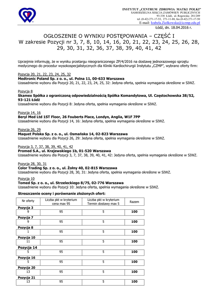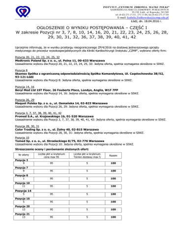 INSTYTUT „CENTRUM ZDROWIA MATKI POLKI” SAMODZIELNA SEKCJA ZAMÓWIEŃ PUBLICZNYCH 93-338 Łódź, ul. Rzgowska 281/289 tel. (0-42) 271-17-53, 271-11-88, fax (0-42) 271-17-50 E-mail: [email protected] Łódź, dn. 18.04.2016 r. OGŁOSZENIE O WYNIKU POSTĘPOWANIA – CZĘŚĆ I W zakresie Pozycji nr 3, 7, 8, 10, 14, 16, 20, 21, 22, 23, 24, 25, 26, 28, 29, 30, 31, 32, 36, 37, 38, 39, 40, 41, 42 Uprzejmie informuję, Ŝe w wyniku przetargu nieograniczonego ZP/4/2016 na dostawę jednorazowego sprzętu medycznego do procedur wysokospecjalistycznych dla Kliniki Kardiochirurgii Instytutu „CZMP”, wybrano oferty firm: Pozycja 20, 21, 22, 23, 24, 25, 32 Medtronic Poland Sp. z o. o., ul. Polna 11, 00-633 Warszawa Uzasadnienie wyboru dla Pozycji 20, 21, 22, 23, 24, 25, 32: Jedyna oferta, spełnia wymagania określone w SIWZ. Pozycja 8 Skamex Spółka z ograniczoną odpowiedzialnością Spółka Komandytowa, Ul. Częstochowska 38/52, 93-121 Łódź Uzasadnienie wyboru dla Pozycji 8: Jedyna oferta, spełnia wymagania określone w SIWZ. Pozycja 14, 16 Beryl Med Ltd 1ST Floor, 26 Fouberts Place, Londyn, Anglia, W1F 7PP Uzasadnienie wyboru dla Pozycji 14, 16: Jedyna oferta, spełnia wymagania określone w SIWZ. Pozycja 26, 29 Maquet Polska Sp. z o. o., ul. Osmańska 14, 02-823 Warszawa Uzasadnienie wyboru dla Pozycji 26, 29: Jedyna oferta, spełnia wymagania określone w SIWZ. Pozycja 3, 7, 37, 38, 39, 40, 41, 42 Promed S.A., ul. Krajewskiego 1b, 01-520 Warszawa Uzasadnienie wyboru dla Pozycji 3, 7, 37, 38, 39, 40, 41, 42: Jedyna oferta, spełnia wymagania określone w SIWZ. Pozycja 28, 30, 31 Color Trading Sp. z o. o., ul. śołny 40, 02-815 Warszawa Uzasadnienie wyboru dla Pozycji 28, 30, 31: Jedyna oferta, spełnia wymagania określone w SIWZ. Pozycja 10 Tomed Sp. z o. o., ul. Strzeleckiego 8/75, 02-776 Warszawa Uzasadnienie wyboru dla Pozycji 10: Jedyna oferta, spełnia wymagania określone w SIWZ. Streszczenie oceny i porównanie złoŜonych ofert: Liczba pkt w kryterium cena max 95 Liczba pkt w kryterium Termin dostawy max 5 Razem Pozycja 3 9 95 5 100 Pozycja 7 9 95 5 100 Pozycja 8 1 95 5 100 Pozycja 10 11 95 5 100 95 5 100 Pozycja 16 5 95 5 100 Pozycja 20 13 95 5 100 Pozycja 21 13 95 5 100 Nr oferty Pozycja 14 5 Pozycja 22 13 95 5 100 95 5 100 Pozycja 24 13 95 5 100 Pozycja 25 13 95 5 100 Pozycja 26 7 95 5 100 Pozycja 28 10 95 5 100 95 5 100 Pozycja 30 10 95 5 100 Pozycja 31 10 95 5 100 Pozycja 32 13 95 5 100 Pozycja 23 13 Pozycja 29 7 Pozycja 36 UniewaŜnienie na mocy art. 93 pkt 4 Pozycja 37 9 95 5 100 Pozycja 38 9 95 5 100 Pozycja 39 9 95 5 100 Pozycja 40 9 95 5 100 Pozycja 41 9 95 5 100 95 5 100 Pozycja 42 9 Oferty złoŜone w postępowaniu: Oferta 1: Skamex Spółka z ograniczoną odpowiedzialnością Spółka Komandytowa, Ul. Częstochowska 38/52, 93-121 Łódź Oferta 2: Vygon Polska Sp. z o. o., ul. Francuska 39/6, 03-905 Warszawa Oferta 3: Zarys International Group Sp. z o.o. sp. k., Ul. Pod Borem 18, 41-808 Zabrze Oferta 4: WERFEN Polska Sp. z o.o., Ul. Wolińska 4, 03-699 Warszawa Oferta 5: Beryl Med Ltd 1ST Floor, 26 Fouberts Place, Londyn, Anglia, W1F 7PP Oferta 6: Billmed Sp. z o. o., ul. Krypska 24, 04-082 Warszawa Oferta 7: Maquet Polska Sp. z o. o., ul. Osmańska 14, 02-823 Warszawa Oferta 8: MD Sp. z o.o., Ul. Niemcewicza 26 lok. 132, 02-022 Warszawa Oferta 9: Promed S.A., ul. Krajewskiego 1b, 01-520 Warszawa Oferta 10: Color Trading Sp. z o. o., ul. śołny 40, 02-815 Warszawa Oferta 11: Tomed Sp. z o. o., ul. Strzeleckiego 8/75, 02-776 Warszawa Oferta 12: Agencja Naukowo – Techniczna Symico Sp. z o. o., ul. Powstańców Śląskich 54a/2, 53-333 Wrocław Oferta 13: Medtronic Poland Sp. z o. o., ul. Polna 11, 00-633 Warszawa Wersja elektroniczna dokumentu. Dokument podpisany w oryginale przez Zastępcę Dyrektora ds. Administracji i Rozwoju dr Pawła Grockiego z upowaŜnienia Dyrektora Instytutu prof. dr hab. med. Macieja Banachaja