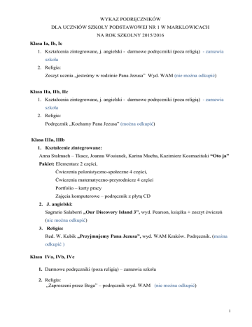 WYKAZ PODRĘCZNIKÓW DLA UCZNIÓW SZKOŁY PODSTAWOWEJ NR 1 W MARKLOWICACH NA ROK SZKOLNY 2015/2016 Klasa Ia, Ib, Ic 1. Kształcenia zintegrowane, j. angielski - darmowe podręczniki (poza religią) - zamawia szkoła 2. Religia: Zeszyt ucznia „jesteśmy w rodzinie Pana Jezusa” Wyd. WAM (nie można odkupić) Klasa IIa, IIb, IIc 1. Kształcenia zintegrowane, j. angielski - darmowe podręczniki (poza religią) - zamawia szkoła 2. Religia: Podręcznik „Kochamy Pana Jezusa” (można odkupić) Klasa IIIa, IIIb 1. Kształcenie zintegrowane: Anna Stalmach – Tkacz, Joanna Wosianek, Karina Mucha, Kazimierz Kosmaciński “Oto ja” Pakiet: Elementarz 2 części, Ćwiczenia polonistyczno-społeczne 4 części, Ćwiczenia matematyczno-przyrodnicze 4 części Portfolio – karty pracy Zajęcia komputerowe – podręcznik z płytą CD 2. J. angielski: Sagrario Salaberri „Our Discovery Island 3”, wyd. Pearson, książka + zeszyt ćwiczeń (nie można odkupić) 3. Religia: Red. W. Kubik „Przyjmujemy Pana Jezusa”, wyd. WAM Kraków. Podręcznik. (można odkupić ) Klasa IVa, IVb, IVc 1. Darmowe podręczniki (poza religią) – zamawia szkoła 2. Religia: „Zaproszeni przez Boga” – podręcznik wyd. WAM (nie można odkupić) 1 Klasa Va, Vb, Vc 1. J. polski: Marlena Derlukiewicz „Słowa na start” Podręcznik do kształcenia literackiego i kulturowego do nowej podstawy programowej (można odkupić), Anna Wojciechowska, Agnieszka Marcinkiewicz, „Słowa na start” – podręcznik do kształcenia językowego dla klasy V – część I i II, wyd. Nowa Era (nie można odkupić ). 2. Matematyka: Małgorzata Dobrowolska, M. Karpiński , podręcznik „Matematyka z plusem”. Nowa wersja – podręcznik + 3 zeszyty ćwiczeń (można odkupić podręcznik). Gdańskie Wydawnictwo Oświatowe. 3. Przyroda: Janina Ślósarczyk, Ryszard Kozik, Feliks Szlajfer „Tajemnice przyrody ” – nowa podstawa programowa ( podręcznik można odkupić); zeszyt ćwiczeń: Jolanta Golanko, Dominik Marszał, Urszula Moździerz „Tajemnice przyrody” wyd. Nowa . (nie można odkupić) 4. Historia: W. Kalwat, M. Lis “Klucz do historii”, Podręcznik do historii i społeczeństwa dla szkoły podstawowej Klasa V. WSiP + 1 zeszyt ćwiczeń ( podręcznik można odkupić, ćwiczenia nowe). 5. J. angielski: Discover English 1, wyd. Pearson, książka ucznia + ćwiczenia ( można odkupić tylko podręcznik (ale nie wieloletni) jeżeli nie są w nim uzupełnione zadania) 6. Muzyka: Monika Gromek, Grażyna Klibach „ I gra muzyka 4-6” wyd. Nowa Era (obowiązuje podręcznik od klasy IV – ten sam na 3 lata). 7. Plastyka: Barbara Neubart, „Plastyka 5” WSiP – tylko zeszyt ćwiczeń (nie można odkupić) 8. Religia: „Obdarowani przez Boga”, red. Z. Marek, wyd. WAM Kraków, podręcznik wersja 2013 ( można odkupić podręcznik) 9. Zajęcia komputerowe: Jarosław Dulin, Zajęcia komputerowe, Podręcznik dla klasy IV-VI szkoły podstawowej seria „Ciekawi świata”. wyd. pedagogiczne Operon ( kontynuacja podręcznika – ten sam na 3 lata). Klasa VIa, VIb, VIc 1. J. polski: 2 Marlena Derlukiewicz „Słowa na start” Podręcznik do kształcenia literackiego i kulturowego dla klasy VI (do nowej podstawy programowej) wyd. Nowa Era. (można odkupić) „Słowa na start” – podręcznik do kształcenia językowego dla klasy VI – część I i II, wyd. Nowa Era – wszystkie książki trzeba kupić nowe! (Nie można ich odkupić!). 2. Matematyka: M. Dobrowolska, M. Karpiński, M. Jucewicz, P. Zarzycki Matematyka z plusem 6 – nowa wersja - podręcznik dla klasy szóstej szkoły podstawowej + 3 zeszyty ćwiczeń. Gdańskie Wydawnictw Oświatowe (można odkupić). 3. Przyroda: Podręcznik: Autorzy: Joanna Stawarz, Feliks Szlajfer, Hanna Kowalczyk Nazwa serii: „Tajemnice przyrody” (można odkupić) Zeszyt ćwiczeń: cz. 1 i cz. 2 Autorzy: Dominik Marszał, Monika Mochnacz, Joanna Stawarz, Maria MarkoWorłowska, Małgorzata Mańska Nazwa serii: „Tajemnice przyrody” (ćwiczeń nie można odkupić) 4. Historia: W. Kalwat, M. Lis “Klucz do historii”, Podręcznik do historii i społeczeństwa dla szkoły podstawowej Klasa VI. WSiP + 1 zeszyt ćwiczeń (podręcznik można odkupić, zeszyt ćwiczeń –nowy) 5. J. angielski: Jayne Wildman, Izabela Hearn Discover English 2 wyd. Pearson podręcznik i ćwiczenia (nie można odkupić) 6. Muzyka: Monika Gromek, Grażyna Klibach „ I gra muzyka 4-6” wyd. Nowa Era (obowiązuje podręcznik z klasy V). 7. Plastyka: Barbara Neubart, „Plastyka 6” WSiP – tylko zeszyt ćwiczeń (nie można odkupić). 8. Religia: „Przemienieni przez Boga”, red. Z. Marek, wyd. WAM Kraków – podręcznik wersja 2014 ( można odkupić podręcznik). 9. Zajęcia komputerowe: Jarosław Dulin, Zajęcia komputerowe, Podręcznik dla klasy IV-VI szkoły podstawowej seria „Ciekawi świata”. wyd. pedagogiczne Operon ( kontynuacja podręcznika z kl. V – ten sam na 3 lata) 3