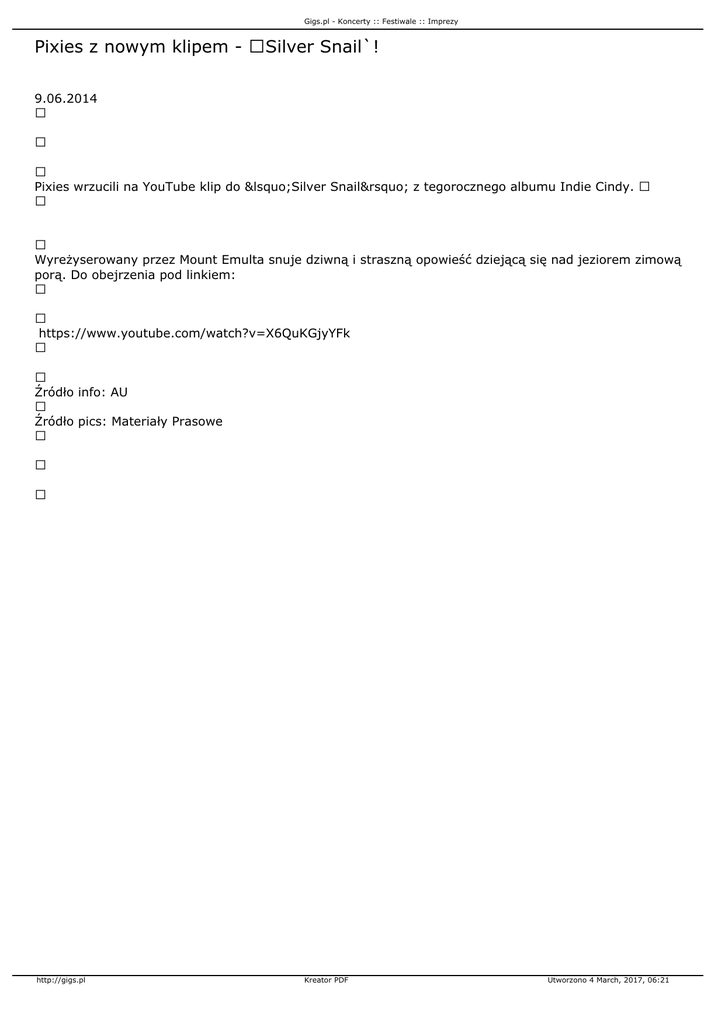 Gigs.pl - Koncerty :: Festiwale :: Imprezy Pixies z nowym klipem - Silver Snail`! 9.06.2014 Pixies wrzucili na YouTube klip do ‘Silver Snail’ z tegorocznego albumu Indie Cindy. Wyreżyserowany przez Mount Emulta snuje dziwną i straszną opowieść dziejącą się nad jeziorem zimową porą. Do obejrzenia pod linkiem: https://www.youtube.com/watch?v=X6QuKGjyYFk Źródło info: AU Źródło pics: Materiały Prasowe http://gigs.pl Kreator PDF Utworzono 4 March, 2017, 06:21