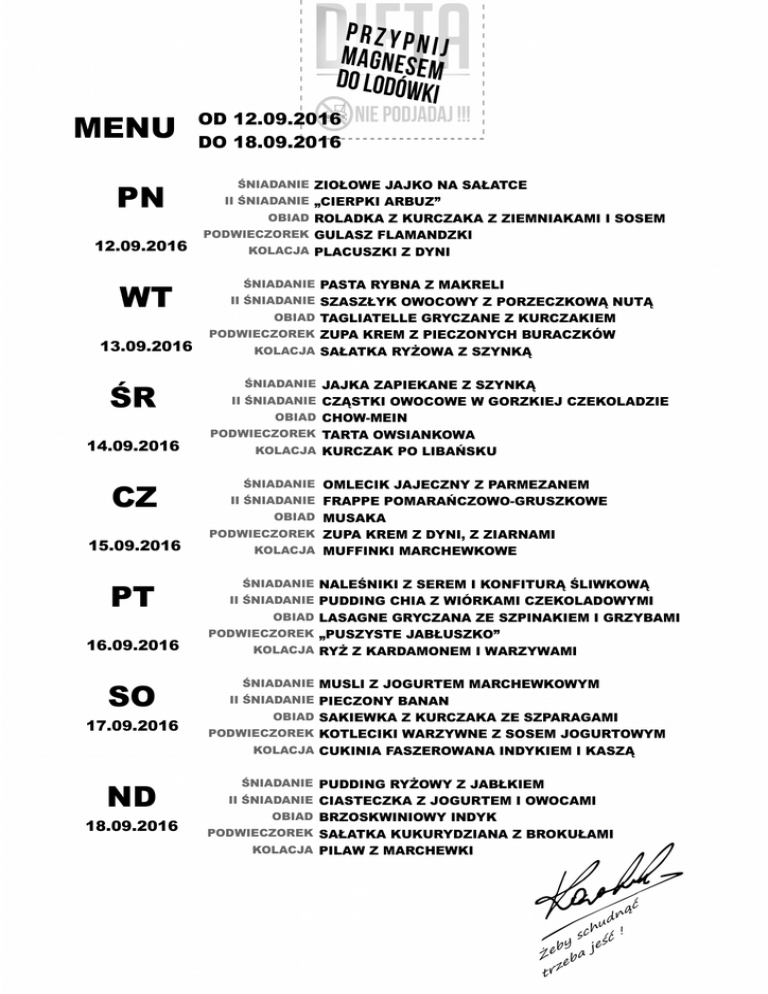 MENU PN 12.09.2016 WT 13.09.2016 ŚR 14.09.2016 CZ 15.09.2016 PT 16.09.2016 SO 17.09.2016 OD 12.09.2016 DO 18.09.2016 ŚNIADANIE ZIOŁOWE JAJKO NA SAŁATCE II ŚNIADANIE „CIERPKI ARBUZ” OBIAD ROLADKA Z KURCZAKA Z ZIEMNIAKAMI I SOSEM PODWIECZOREK GULASZ FLAMANDZKI KOLACJA PLACUSZKI Z DYNI ŚNIADANIE PASTA RYBNA Z MAKRELI II ŚNIADANIE SZASZŁYK OWOCOWY Z PORZECZKOWĄ NUTĄ OBIAD TAGLIATELLE GRYCZANE Z KURCZAKIEM PODWIECZOREK ZUPA KREM Z PIECZONYCH BURACZKÓW KOLACJA SAŁATKA RYŻOWA Z SZYNKĄ ŚNIADANIE JAJKA ZAPIEKANE Z SZYNKĄ II ŚNIADANIE CZĄSTKI OWOCOWE W GORZKIEJ CZEKOLADZIE OBIAD CHOW-MEIN PODWIECZOREK TARTA OWSIANKOWA KOLACJA KURCZAK PO LIBAŃSKU ŚNIADANIE OMLECIK JAJECZNY Z PARMEZANEM II ŚNIADANIE FRAPPE POMARAŃCZOWO-GRUSZKOWE OBIAD MUSAKA PODWIECZOREK ZUPA KREM Z DYNI, Z ZIARNAMI KOLACJA MUFFINKI MARCHEWKOWE ŚNIADANIE NALEŚNIKI Z SEREM I KONFITURĄ ŚLIWKOWĄ II ŚNIADANIE PUDDING CHIA Z WIÓRKAMI CZEKOLADOWYMI OBIAD LASAGNE GRYCZANA ZE SZPINAKIEM I GRZYBAMI PODWIECZOREK „PUSZYSTE JABŁUSZKO” KOLACJA RYŻ Z KARDAMONEM I WARZYWAMI ŚNIADANIE MUSLI Z JOGURTEM MARCHEWKOWYM II ŚNIADANIE PIECZONY BANAN OBIAD SAKIEWKA Z KURCZAKA ZE SZPARAGAMI PODWIECZOREK KOTLECIKI WARZYWNE Z SOSEM JOGURTOWYM KOLACJA CUKINIA FASZEROWANA INDYKIEM I KASZĄ ND 18.09.2016 ŚNIADANIE PUDDING RYŻOWY Z JABŁKIEM II ŚNIADANIE CIASTECZKA Z JOGURTEM I OWOCAMI OBIAD BRZOSKWINIOWY INDYK PODWIECZOREK SAŁATKA KUKURYDZIANA Z BROKUŁAMI KOLACJA PILAW Z MARCHEWKI