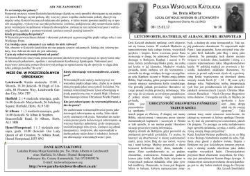ABY NIE ZAPOMNIEĆ! Po co istnieją dni pokuty? Ponieważ wszyscy wierni Kościoła katolickiego (każdy na swój sposób) obowiązani są na podstawie prawa Bożego czynić pokutę, aby wszyscy przez wspólne zachowanie pokuty złączyli się między sobą, Kościół wyznaczył nakazane dni pokuty, w które wierni powinni modlić się w sposób szczególny, wykonywać uczynki pobożności i miłości, podejmować akty umartwienia siebie przez wierniejsze wypełnianie własnych obowiązków, zwłaszcza zaś zachowywać post i wstrzemięźliwość, zgodnie z postanowieniami zamieszczonych poniżej kanonów. Kiedy przypadają dni pokuty? W Kościele powszechnym dniami i okresami pokutnymi są poszczególne piątki całego roku i czas Wielkiego Postu. Czy istnieją czasy zakazane i czy należy do nich Adwent? Nie, obecnie w Kościele katolickim nie ma pojęcia czasów zakazanych. Istnieją dni i okresy pokuty, lecz Adwent do nich nie jest zaliczany. Czym się różni wstrzemięźliwość od postu? Wstrzemięźliwość (nazywana potocznie postem jakościowym) to rezygnacja ze spożywania mięsa lub innych pokarmów, zgodnie z zarządzeniem Konferencji Episkopatu. Natomiast post (nazywany potocznie postem ilościowym) polega na ograniczeniu się do spożycia w ciągu dnia tylko jednego posiłku "do syta". MSZE ŚW. W POSZCZEGÓLNYCH Kiedy obowiązuje wstrzemięźliwość, a kiedy post? OŚRODKACH: Letchworth: Każda niedziela- 13.00. i Wtorek- 18.30 (kościół- St Hugh of Lincoln, 84 Pixmore Way, Letchworth Garden City, SG6 3TP Hatfield: 2 i 4 niedziela miesiąca, godz. 16.00 (kościół- Marychurch, 26 Salisbury Square, Hatfield, Herts, AL9 5JD St Albans: 1 i 3 niedziela miesiąca, godz. 16.00 (kościół- Ss Alban & Stephen, Beaconsfield Road, St Albans, Herts, AL1 3RB Hemel Hempstead: 1 i 3 niedziela miesiąca, godz. 18.00 (kościół- Our Lady Queen of all Creation, St Albans Road, Hemel Hempstead, HP3 8PG Wstrzemięźliwość należy zachowywać we wszystkie piątki całego roku, chyba że w danym dniu przypada jakaś uroczystość kościelna. Natomiast wstrzemięźliwość i post obowiązują w środę popielcową oraz w piątek Męki i Śmierci Pana naszego Jezusa Chrystusa (Wielki Piątek). Kto jest zobowiązany do wstrzemięźliwości, a kto do postu? Do zachowania wstrzemięźliwości (postu jakościowego) zobowiązane są osoby, które ukończyły czternasty rok życia. Natomiast do zachowania postu (postu ilościowego) zobowiązani są wszyscy katolicy pełnoletni, aż do rozpoczęcia sześćdziesiątego roku życia. Zachęca się jednak duszpasterzy i rodziców, aby wprowadzali w ducha pokuty także dzieci i młodzież, których nie obowiązuje wstrzemięźliwość i post. DANE KONTAKTOWE Lokalna Polska Misja Katolicka pw. Św. Brata Alberta w Letchworth oraz: Hatfield, St Albans i Hemel Hempstead Proboszcz: Ks. Cezary Komosiński, Tel: 07519059276 E-mail: [email protected] http://www.parafia-letchworth-albert.co.uk/ POLSKA WSPÓLNOTA KATOLICKA św. Brata Alberta LOCAL CATHOLIC MISSION IN LETCHWORTH Registered Charity No 1119423 08 i 15.01.17 Nr 38 LETCHWORTH, HATFIELD, ST ALBANS, HEMEL HEMPSTEAD Dziś Kościół obchodzi epifanię, czyli objawie- łych, a dodany do wina wzmacniał je. Taki nanie się Jezusa światu. W osobach Mędrców są pój podawano skazańcom. To zapowiedź męki reprezentowane ludy całego świata, wszystkich Pana i Jego pogrzebu. Jezus otrzymał więc złojęzyków i krajów, które wezwane przez Pana to jako król, kadzidło jako Bóg i mirrę jako wyruszają w drogę, by adorować Nowo Naro- człowiek. Na pamiątkę tych darów zaczęto dzonego w Betlejem. Kapłani i uczeni w Pi- święcić w kościele złoto, kadzidło i mirrę, a z śmie, którzy przebywają blisko groty, nie robią czasem wprowadzono także błogosławieństwo ani kroku w jej kierunku. Mędrców wiedzie kredy. W polskiej tradycji po powrocie z kogwiazda, która zachęca ich do wyruszenia i ścioła, kadzidłem okadzano domostwa, by oświetla im drogę wiodącą do tego szczególne- ustrzec je przed wpływami złych sił, a poświęgo celu. Kapłani i uczeni w Piśmie znają dobrze coną kredą wypisywano na drzwiach domu Biblię. Stąd wiedzą, gdzie przepowiednie wska- inicjały trzech Króli [C + M + B] oraz cyfry zywały miejsce narodzenia króla izraelskiego. danego roku. Najbardziej trafną interpretacją Nie potrafią jednak powiedzieć Herodowi ni- tych liter jest potraktowanie ich jako chrześciczego ponad zwykłą prorocką informację. Ma- jańskich noworocznych życzeń: Christus Manmy więc do czynienia ze swoistym paradoksem. sionem Benedicat – Niech Chrystus błogosławi Z jednej strony widzimy więc tajemniczą temu domowi. Ewangelia uściśla, że Mędrcy po gwiazdę, spotkaniu z JezuUROCZYSTOŚĆ OBJAWIENIA PAŃSKIEGO sem „Inną drogą która jest przewodniczudali się do swojej TRZECH KRÓLI ką spotkania ojczyzny”. Taka trzech pogan ze Zbawcą. Z drugiej zaś mamy zmiana trasy może oznaczać nawrócenie, do Biblię, odczytywaną i nauczaną przez starote- jakiego są wezwani ci, którzy spotkają Chrystustamentalnych kapłanów i uczonych w Piśmie sa, by stać się prawdziwymi czcicielami, jakich w taki sposób, iż nie można podać Herodowi On pragnie. To pociąga za sobą naśladowanie niczego poza niewyraźną informacją. Jego sposobu działania, czyniąc z siebie „ofiarę Mędrcy dotarli do Betlejem, gdyż pozwolili się żywą, świętą, Bogu przyjemną”. posłusznie prowadzić gwieździe. To ważne, by Kard. Joachim Meisner podkreśla, że to, co Bóg nauczyć się obserwować w naszej codzienności w noc Bożego Narodzenia szeptał do ucha, Epiznaki, przez które Bóg do nas mówi, wzywa fania chce głosić z dachów świata. Stajnia z nas i nami kieruje. Mędrcy przynieśli w darze Betlejem nie jest kościelnym terenem prywatJezusowi królewskie dary: złoto, kadzidło i nym i dzisiaj została określona jako dobro mirrę. Złoto symbolizow