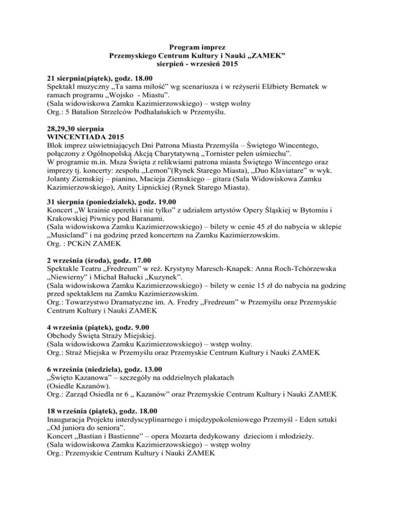 Program imprez Przemyskiego Centrum Kultury i Nauki „ZAMEK” sierpień - wrzesień 2015 21 sierpnia(piątek), godz. 18.00 Spektakl muzyczny „Ta sama miłość” wg scenariusza i w reżyserii Elżbiety Bernatek w ramach programu „Wojsko - Miastu”. (Sala widowiskowa Zamku Kazimierzowskiego) – wstęp wolny Org.: 5 Batalion Strzelców Podhalańskich w Przemyślu. 28,29,30 sierpnia WINCENTIADA 2015 Blok imprez uświetniających Dni Patrona Miasta Przemyśla – Świętego Wincentego, połączony z Ogólnopolską Akcją Charytatywną „Tornister pełen uśmiechu”. W programie m.in. Msza Święta z relikwiami patrona miasta Świętego Wincentego oraz imprezy tj. koncerty: zespołu „Lemon”(Rynek Starego Miasta), „Duo Klaviatare” w wyk. Jolanty Ziemskiej – pianino, Macieja Ziemskiego – gitara (Sala Widowiskowa Zamku Kazimierzowskiego), Anity Lipnickiej (Rynek Starego Miasta). 31 sierpnia (poniedziałek), godz. 19.00 Koncert „W krainie operetki i nie tylko” z udziałem artystów Opery Śląskiej w Bytomiu i Krakowskiej Piwnicy pod Baranami. (Sala widowiskowa Zamku Kazimierzowskiego) – bilety w cenie 45 zł do nabycia w sklepie „Musicland” i na godzinę przed koncertem na Zamku Kazimierzowskim. Org. : PCKiN ZAMEK 2 września (środa), godz. 17.00 Spektakle Teatru „Fredreum” w reż. Krystyny Maresch-Knapek: Anna Roch-Tchórzewska „Niewierny” i Michał Bałucki „Kuzynek”. (Sala widowiskowa Zamku Kazimierzowskiego) – bilety w cenie 15 zł do nabycia na godzinę przed spektaklem na Zamku Kazimierzowskim. Org.: Towarzystwo Dramatyczne im. A. Fredry „Fredreum” w Przemyślu oraz Przemyskie Centrum Kultury i Nauki ZAMEK 4 września (piątek), godz. 9.00 Obchody Święta Straży Miejskiej. (Sala widowiskowa Zamku Kazimierzowskiego) – wstęp wolny. Org.: Straż Miejska w Przemyślu oraz Przemyskie Centrum Kultury i Nauki ZAMEK 6 września (niedziela), godz. 13.00 „Święto Kazanowa” – szczegóły na oddzielnych plakatach (Osiedle Kazanów). Org.: Zarząd Osiedla nr 6 „ Kazanów” oraz Przemyskie Centrum Kultury i Nauki ZAMEK 18 września (piątek), godz. 18.00 Inauguracja Projektu interdyscyplinarnego i międzypokoleniowego Przemyśl - Eden sztuki „Od juniora do seniora”. Koncert „Bastian i Bastienne” – opera Mozarta dedykowany dzieciom i młodzieży. (Sala widowiskowa Zamku Kazimierzowskiego) – wstęp wolny Org.: Przemyskie Centrum Kultury i Nauki ZAMEK 19 września (sobota), godz. 18.00 Eden sztuki „Od juniora do seniora” Koncert „Jej pierwszy bal” dedykowany seniorom (Sala widowiskowa Zamku Kazimierzowskiego) – wstęp wolny Org.: Przemyskie Centrum Kultury i Nauki ZAMEK 20 września (niedziela), godz.19.00 Ray Wilson – GENESIS CLASSIC - koncert (Sala widowiskowa Zamku Kazimierzowskiego) bilety w cenie 65 zł do nabycia w sklepie „Musicland” i na godzinę przed koncertem na Zamku Kazimierzowskim. Org.: Przemyskie Centrum Kultury i Nauki ZAMEK. 25 września (piątek), godz. 10.00 „Biesiada wierszowana” i promocja książki Mateusza Pieniążka „Złote jaja i inne wiersze dla dzieci”. (Sala widowiskowa Zamku Kazimierzowskiego) – wstęp wolny Org.: Mateusz Pieniążek oraz Przemyskie Centrum Kultury i Nauki ZAMEK 29 września (wtorek), godz. 10.00 Malowanie słowa - warsztaty literackie (dzieci szkolne klasy IV-VI). (Sala widowiskowa Zamku Kazimierzowskiego) – wstęp wolny Org.: Mateusz Pieniążek oraz Przemyskie Centrum Kultury i Nauki ZAMEK. Wystawy czasowe: - wystawa Ewy Wolak, malarstwo (Galeria Debiuty - czynna do 13.09.2015 r.) - wystawa pokonkursowa Dorocznej Nagrody im. M. Strońskiego (Galeria Zamek – czynna do 14.09.2015 r.), - wystawa Piotra Kisiela, grafika (Galeria Debiuty – czynna od 15.09.2015 r.) Wystawy stałe: - Kazimierz Wielki Wczoraj i Dziś, - Lapidarium, - Kazimierz w Historii i Tradycji, - 145 lat Towarzystwa Dramatycznego im. A. Fredry „Fredreum” w Przemyślu, - Dorobek sceniczny Kazimierza Opalińskiego – najwybitniejszego aktora „Fredreum”, - „Fredreum” w karykaturze, - Widoki przemyskie z lat 50 XX wieku. Przemyskie Centrum Kultury i Nauki ZAMEK 37-700 Przemyśl, Aleje XXV Polskiej Drużyny Strzeleckiej 1 Tel. 16 678 50 61, e-mail: [email protected] Dyrektor – Renata Nowakowska