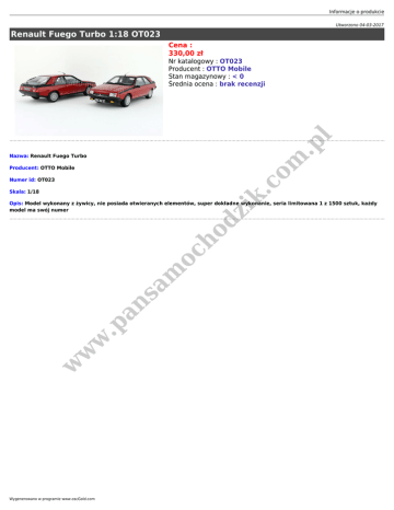 Informacje o produkcie Utworzono 04-03-2017 Renault Fuego Turbo 1:18 OT023 Cena : 330,00 zł .p l Nr katalogowy : OT023 Producent : OTTO Mobile Stan magazynowy : < 0 Średnia ocena : brak recenzji om Nazwa: Renault Fuego Turbo Producent: OTTO Mobile .c Numer id: OT023 dz ik Skala: 1/18 w w w .p an sa m oc ho Opis: Model wykonany z żywicy, nie posiada otwieranych elementów, super dokładne wykonanie, seria limitowana 1 z 1500 sztuk, każdy model ma swój numer Wygenerowano w programie www.oscGold.com