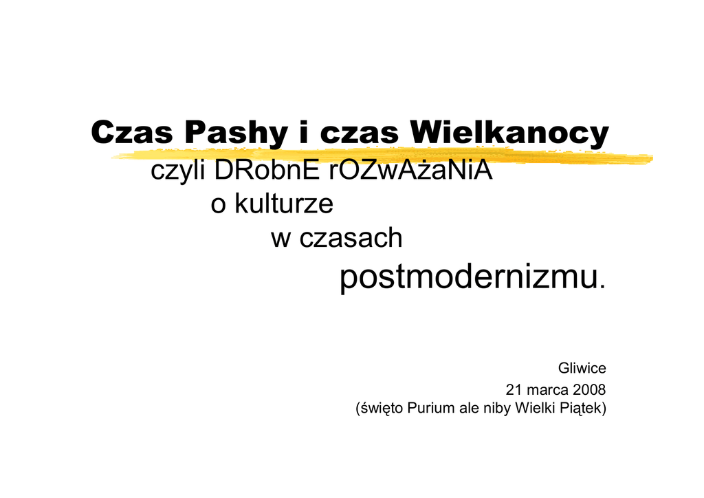 Czas Pashy i czas Wielkanocy czyli DRobnE rOZwAŜaNiA o kulturze w czasach postmodernizmu. Gliwice 21 marca 2008 (święto Purium ale niby Wielki Piątek) Obserwacje Ludzie nie wiedzą co to jest czas ale dość sprawnie nauczyli się go mierzyć. Sposób liczenia czasu (kalendarz) jest bardzo waŜnym elementem kaŜdej kultury. Globalizacja próbuje w sposobie liczenia czasu spustoszenie a podstmodernizm do dzieła zniszczenia dokłada swoje. Niezaprzeczalna okresowość czasu Dzień Tydzień Miesiąc Rok Dzień Jednoznaczny okres we wszystkich kulturach, wyznaczony połoŜeniem słońca. Początek dnia juŜ taki jednoznaczny nie jest: Czy dzień zaczyna się rano? Patrz: programy telewizyjne Czy dzień zaczyna się o 24.oo (0.oo) bo tak zrobione jest sterowanie elektrownią? A moŜe dzień zaczyna się o zmierzchu dnia poprzedniego? Tak ma kultura biblijna. Tydzień Ustalony od stworzenia świata choć czasem atakowany dekadą (Wielka Rewolucja Francuska i inne tego typu zabawy) Problem pierwszego dnia tygodnia: niedziela czy poniedziałek? Miesiąc Pomysł pierwszy: miesiąc księŜycowy: około 29 dni Kalendarz hebrajski Kalendarz arabski… … i wiele innych kalendarzy, których praktycznie juŜ nie ma. Pomysł drugi: 30 dni, 31 dni ..... ale tak aby rok miał 12 miesięcy. Obserwacja kalendarza arabskiego 12 * 29,48 = 341,76 a to prawie rok ale nie rok! Rok Jednoznaczny okres we wszystkich kulturach, wyznaczony połoŜeniem słońca, podobnie jak dzień. Zawsze jest problem z wyznaczeniem roku zerowego bo: albo Chrystus urodził się 4 roku przed Chrystusem (4 p.ch.) albo urodził się w 4 roku przed naszą erą (4 p.n.e.) albo urodził się -601 A.H. 3760 po Adamie i wtedy sprawa jest prosta. Kalendarz gregoriański Wprowadzony przez Grzegorza XIII obowiązuje od 1582r. i wyparł uŜywany gdzieniegdzie do dziś, podobny kalendarz juliański wprowadzony w 46 p. ch. przez Juliusza Cezara. Kalendarz słoneczny, zakładający 365 lub 366 dni w roku. Lata przestępne to te, których numer kolejny jest liczbą podzielną przez 4, z wyjątkiem lat wyraŜających się pełnymi setkami, wśród których tylko podzielne przez 400 są latami przestępnymi. Np. 2000 był przestępny a 1900 nie Zakłada więc długość roku jako 365,2425 dnia (bo 0,2425 to 97 dni przestępnych na kaŜde 400 lat); PoniewaŜ rok zwrotnikowy trwa 365,242199 to błąd (26 s na rok) jednego dnia pojawia się co około 3360 lat. Pory roku w Polsce 12 1 11 2 Zima 3 10 Jesień Wiosna 9 4 Lato 5 8 7 6 Pory roku w Izraelu 10 11 9 12 8 Pora mokra 13 (?) 7 wiosna Pora sucha 1 6 2 5 4 3 Kalendarz Ŝydowski (biblijny) Kalendarz słoneczno-księŜycowy: Słońce wyznacza rok KsięŜyc miesiące Dlatego: miesiąc ma 28 lub 29 dni rok ma 12 lub 13 miesięcy Pierwszy dzień miesiąca to pierwszy dzień nowiu księŜyca. (sposób wyznaczania wg. Talmudu: 3 obserwatorów) Pierwszy dzień roku to pierwszy dzień pierwszego miesiąca a więc pierwszy dzień po przesileniu wiosennym – pierwszy Nisan. Problem 13 miesiąca Przesilenie wiosenne pełnia marzec Nów przed samym przesileniem Adar 1 kwiecień maj nów 14 dni Adar 2 Pierwszy dzień miesiąca ale nie pierwszego Nisan Pierwszy dzień pierwszego miesiąca Iyar Pesach Pascha przypada 14 dnia pierwszego miesiąca. Pierwszy miesiąc to ten, który zaczyna się po przesileniu wiosennym. Miesiąc zaczyna się w pierwszym dniu po nowiu. Przesilenie wiosenne 21 marca fazy słońca fazy księŜyca nów 14 dzień pierwszego miesiąca - Nisan 14 dni Adar Nisan Iyar Wielkanoc Wielkanoc (w kalendarzu gregoriańskim) przypada w pierwszą niedziele, po pierwszej pełni, po przesileniu wiosennym. Przesilenie wiosenne 21 marca fazy słońca fazy księŜyca niedziela pełnia marzec Niedziela po wiosennej pełni kwiecień maj Pascha a Wielkanoc: przypadek bliski Przesilenie wiosenne niedziela pełnia marzec kwiecień N maj P nów 14 dzień pierwszego miesiąca 14 dni Adar Niedziela po wiosennej pełni Nisan Iyar Pascha a Wielkanoc: przypadek daleki Przesilenie wiosenne niedziela pełnia marzec Niedziela po wiosennej pełni kwiecień P maj N nów 14 dzień pierwszego miesiąca 14 dni Adar Nisan Iyar Inne kultury „okołobiblijne” Świadkowie Jehowy: Pamiątkę obchodzi się wtedy, gdy Ciało Kierownicze, na podstawie obliczeń i obserwacji określi, kiedy naleŜy ją obchodzić. Nie szkodzi, Ŝe Nowy Jork leŜy gdzie indziej niŜ Jerozolima. W końcu to w Nowym Jorku jest kwatera główna SJ. Prawosławie: Pierwsza niedziela po pierwszej pełni przypadającej po 21 marca. To nic, Ŝe 21 marca przypada w tej chwili wg. kalendarza juliańskiego 14 dni po przesileniu wiosennym. To Prawosławie zachowuje tradycje a nie ciągle coś zmienia jak heretycki Rzym! Historia wszechświata (sposób opisu) Stan stabilny Woda krzepnięcie Lód Proces przejścia Metahistoria wszechświata stworzenie Ogród Eden upadek Świat zbawienie Nowa ziemia i nowe niebo Metahistoria wszechświata Jezus Mesjasz stworzenie Ogród Eden upadek Świat zbawienie zn isz cz en ie Nowa ziemia i nowe niebo Czas Wielkanocy – dokonało się śyczenia Niech Chrystus zamieszka przez wiarę w waszych sercach; abyście w miłości wkorzenieni i ugruntowani, wraz ze wszystkimi świętymi zdołali ogarnąć duchem, czym jest Szerokość, Długość, Wysokość i Głębokość, i poznać miłość Chrystusa, przewyŜszającą wszelką wiedzę, abyście zostali napełnieni całą Pełnią BoŜą. (List apostoła Pawła do Efezjan rozdział 3, wersety od 17) Nowa ziemia i nowe niebo Jakie dziś mamy święta? Purim! Purim Purim Błogosławione niech będzie imię Mordechaja. Śmierć Hamanowi! Niech Twoja córka będzie jak Estera! Lektura dodatkowa: Księga Estery, gdzieś w połowie Biblii. http://yhst.blogspot.com/2007/03/purim-at-yhst.html Czy Wielki Piątek jest aŜ taki wielki? Trzeciego dnia zmartwychwstał... 1, 2, 3...? Zmartwychwstanie Wjazd do Jerozolimy UkrzyŜowanie Ostatnia wieczerza śr cz pi so Szabat sobotni nd pn wt