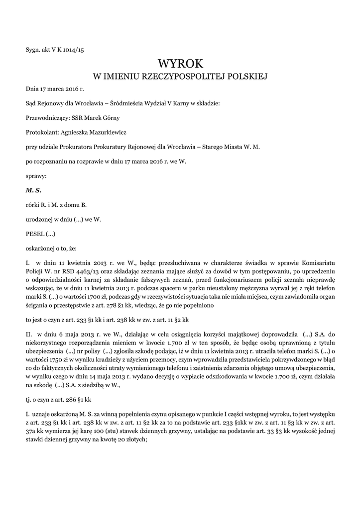Sygn. akt V K 1014/15 WYROK W IMIENIU RZECZYPOSPOLITEJ POLSKIEJ Dnia 17 marca 2016 r. Sąd Rejonowy dla Wrocławia – Śródmieścia Wydział V Karny w składzie: Przewodniczący: SSR Marek Górny Protokolant: Agnieszka Mazurkiewicz przy udziale Prokuratora Prokuratury Rejonowej dla Wrocławia – Starego Miasta W. M. po rozpoznaniu na rozprawie w dniu 17 marca 2016 r. we W. sprawy: M. S. córki R. i M. z domu B. urodzonej w dniu (...) we W. PESEL (...) oskarżonej o to, że: I. w dniu 11 kwietnia 2013 r. we W., będąc przesłuchiwana w charakterze świadka w sprawie Komisariatu Policji W. nr RSD 4463/13 oraz składając zeznania mające służyć za dowód w tym postępowaniu, po uprzedzeniu o odpowiedzialności karnej za składanie fałszywych zeznań, przed funkcjonariuszem policji zeznała nieprawdę wskazując, że w dniu 11 kwietnia 2013 r. podczas spaceru w parku nieustalony mężczyzna wyrwał jej z ręki telefon marki S. (...) o wartości 1700 zł, podczas gdy w rzeczywistości sytuacja taka nie miała miejsca, czym zawiadomiła organ ścigania o przestępstwie z art. 278 §1 kk, wiedząc, że go nie popełniono to jest o czyn z art. 233 §1 kk i art. 238 kk w zw. z art. 11 §2 kk II. w dniu 6 maja 2013 r. we W., działając w celu osiągnięcia korzyści majątkowej doprowadziła (...) S.A. do niekorzystnego rozporządzenia mieniem w kwocie 1.700 zł w ten sposób, że będąc osobą uprawnioną z tytułu ubezpieczenia (...) nr polisy (...) zgłosiła szkodę podając, iż w dniu 11 kwietnia 2013 r. utraciła telefon marki S. (...) o wartości 1750 zł w wyniku kradzieży z użyciem przemocy, czym wprowadziła przedstawiciela pokrzywdzonego w błąd co do faktycznych okoliczności utraty wymienionego telefonu i zaistnienia zdarzenia objętego umową ubezpieczenia, w wyniku czego w dniu 14 maja 2013 r. wydano decyzję o wypłacie odszkodowania w kwocie 1.700 zł, czym działała na szkodę (...) S.A. z siedzibą w W., tj. o czyn z art. 286 §1 kk I. uznaje oskarżoną M. S. za winną popełnienia czynu opisanego w punkcie I części wstępnej wyroku, to jest występku z art. 233 §1 kk i art. 238 kk w zw. z art. 11 §2 kk za to na podstawie art. 233 §1kk w zw. z art. 11 §3 kk w zw. z art. 37a kk wymierza jej karę 100 (stu) stawek dziennych grzywny, ustalając na podstawie art. 33 §3 kk wysokość jednej stawki dziennej grzywny na kwotę 20 złotych; II. uznaje oskarżoną M. S. za winną popełnienia czynu opisanego w punkcie II części wstępnej wyroku, to jest występku z art. 286 §1 kk i za to na podstawie art. 286 §1 kk w zw. z art. 37a kk wymierza jej karę 200 (dwustu) stawek dziennych grzywny, ustalając na podstawie art. 33 §3 kk wysokość jednej stawki dziennej grzywny na kwotę 20 złotych; III. na podstawie art. 85 §1 i 2 kk i art. 86 §1 i 2 kk łączy kary grzywny orzeczone wobec oskarżonej w punktach I i II części dyspozytywnej wyroku i wymierza jej karę łączną 250 (dwustu pięćdziesięciu) stawek dziennych grzywny ustalając na podstawie art. 33 §3 kk wysokość jednej stawki dziennej grzywny na kwotę 20 złotych; IV. na podstawie art. 627 k.p.k. zasądza od oskarżonej na rzecz Skarbu Państwa zwrot kosztów sądowych w całości w tym na podstawie art. 3 ust 1 ustawy z dnia 23 czerwca 1973 roku o opłatach w sprawach karnych wymierza jej opłatę w kwocie 500 złotych. UZASADNIENIE Na podstawie przeprowadzonego przewodu sądowego, Sąd Rejonowy ustalił następujący stan faktyczny: W dniu 1 marca 2013 r. M. S. nabyła telefon komórkowy Samsung G. (...) za kwotę 1750 złotych. M. S. powierzyła telefon swojej córce K. S.. Dowód: faktura VAT k. 33 W dniu 14 września 2012 r. M. S. zawarła z (...) S.A. umowę ubezpieczenia (...), Polisa (...) nr (...) na okres od 15 września 2012 r. do 14 września 2013 r. Ubezpieczeniem były objęte także zdarzenia polegające na utracie ruchomości w następstwie „rabunku poza miejscem ubezpieczenia”. Zgodnie z Ogólnymi warunkami ubezpieczenia (...), za „rabunek poza miejscem ubezpieczenia” uznawano „zabór ubezpieczonych ruchomości domowych poza miejscem ubezpieczenia dokonany na terenie Rzeczypospolitej Polskiej z zastosowaniem przemocy fizycznej wobec Ubezpieczonego lub osoby bliskiej Ubezpieczonego, o której mowa w §12 albo groźby natychmiastowego jej użycia lub z doprowadzeniem Ubezpieczonego lub osoby bliskiej Ubezpieczonego, o której mowa w §12 do nieprzytomności lub bezbronności”. Przedmiotem ubezpieczenia nie były objęte zdarzenia polegające na kradzieży czy też zgubieniu przedmiotu. Dowód: polisa k. 82 – 85; ogólne warunki ubezpieczenia k. 86 – 99; pismo k. 81; K. S. w 2013 r. uczęszczała do V klasy Szkoły Podstawowej nr (...) w Zespole Szkolno – Podstawowym nr (...) z siedzibą we W. przy ul (...). Dowód: wyjaśnienia oskarżonej k. 129 - 131; zeznania świadka E. K. (1) k. 5 -8, 66 – 67, 174 - 176; zeznania świadka E. K. (2) k. 68 – 69, 150 – 151, 188 - 189; zeznania świadka R. S. k. 31 – 32, 135 – 136, 189 – 191. W dniu 11 kwietnia 2013 r. K. S., będąc w szkole, zgubiła powierzony jej telefon komórkowy. W tym samym dniu K. S. zgłosiła się z ojcem R. S. do dyrekcji szkoły. R. S. powiedział, że córka pozostawiła telefon na terenie szkoły i następnie wraz z H. C. (1), zatrudnioną jako osoba sprzątająca, wspólnie przeszukiwali szatnię w poszukiwaniu telefonu, lecz bez efektu. Dowód: zeznania świadka E. K. (1) k. 5 -8, 66 – 67, 174 - 176; zeznania świadka E. K. (2) k. 68 – 69, 150 – 151, 188 - 189; zeznania H. C. (1) k. 34 – 35, 178-179; zeznania H. C. (2) k. 42 – 43; zeznania M. C. k. 44 – 45; częściowo zeznania świadka R. S. k. 31 – 32, 135 – 136, 189 – 191. W dniu 11 kwietnia 2013 r. M. S. złożyła ustne zawiadomienie o popełnieniu przestępstwa oraz zeznania w charakterze świadka przed komisariatem Policji W.. Zeznała, że w dniu 11 kwietnia 2013 r. około godziny 12:00 wyszła z dzieckie
