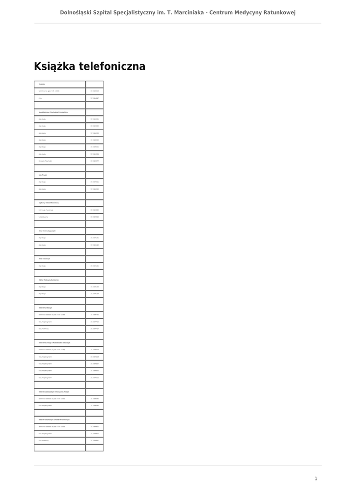 Dolnośląski Szpital Specjalistyczny im. T. Marciniaka - Centrum Medycyny Ratunkowej Książka telefoniczna Dyrekcja Sekretariat (w godz. 7:25 - 15:00) 71 306 44 19 Faks 71 306 48 67 Specjalistyczna Przychodnia Przyszpitalna Rejestracja 71 306 42 31 Rejestracja 71 306 42 32 Rejestracja 71 306 42 33 Rejestracja 71 306 42 34 Rejestracja 71 306 42 35 Rejestracja 71 306 42 36 Kierownik Przychodni 71 306 42 77 Izba Przyjęć Rejestracja 71 306 42 21 Rejestracja 71 306 42 22 Szpitalny Oddział Ratunkowy Informacja / Rejestracja 71 306 43 04 Lekarz dyżurny 71 306 43 20 Dział Elektrodiagnostyki Rejestracja 71 306 41 61 Rejestracja 71 306 41 62 Dział Endoskopii Rejestracja 71 306 41 61 Zakład Medycyny Nuklearnej Rejestracja 71 306 41 53 Rejestracja 71 306 41 54 Oddział Kardiologii Sekretariat Oddziału (w godz. 7:00 - 15:00) 71 306 47 02 Dyżurka pielęgniarek 71 306 47 22 Dyżurka lekarzy 71 306 47 27 Oddział Neurologii z Pododdziałem Udarowym Sekretariat Oddziału (w godz. 7:00 - 15:00) 71 306 46 34 Dyżurka pielęgniarek 71 306 46 18 Dyżurka pielęgniarek 71 306 46 37 Dyżurka pielęgniarek 71 306 46 35 Dyżurka pielęgniarek 71 306 46 16 Oddział Anestezjologii i Intensywnej Terapii Sekretariat Oddziału (w godz. 7:00 - 14:35) 71 306 43 40 Dyżurka pielęgniarek 71 306 43 46 Oddział Toksykologii i Chorób Wewnętrznych Sekretariat Oddziału (w godz. 7:00 - 14:35) 71 306 48 31 Dyżurka pielęgniarek 71 306 48 37 Dyżurka lekarzy 71 306 48 41 1 Dolnośląski Szpital Specjalistyczny im. T. Marciniaka - Centrum Medycyny Ratunkowej Oddział Chirurgii Dziecięcej Sekretariat Oddziału (w godz. 7:00 - 15:00) 71 306 43 89 Dyżurka pielęgniarek 71 306 43 94 Dyżurka lekarzy 71 306 44 08 Oddział Neurologii Dziecięcej Sekretariat Oddziału (w godz. 7:00 - 14:35) 71 306 44 86 Dyżurka pielęgniarek 71 306 44 90 Dyżurka lekarzy 71 306 44 95 Dyżurka lekarzy 71 306 44 94 Oddział Chirurgii Ogólnej i Naczyniowej Sekretariat Oddziału (w godz. 7:00 - 14:35) 71 306 45 32 Dyżurka pielęgniarek 71 306 45 33 Dyżurka lekarzy 71 306 45 41 Oddział Chirurgii Urazowo - Ortopedycznej Sekretariat Oddziału (w godz. 7:00 - 14:35) 71 306 45 55 71 306 45 75 Ordynator 71 306 45 85 Z-ca Ordynatora 71 306 45 67 Oddziałowa 71 306 45 84 Dyżurka pielęgniarek 71 306 45 76 II odc. pielęgniarski 71 306 45 57 Dyżurka lekarzy 71 306 45 62 71 306 45 88 Oddział Rehabilitacji Sekretariat Oddziału (w godz. 7:00 - 14:35) 71 306 48 11 Dyżurka pielęgniarek 71 306 48 17 Dyżurka pielęgniarek 71 306 48 19 Dyżurka lekarzy 71 306 48 12 Oddział Neurochirurgii Sekretariat Oddziału (w godz. 7:00 - 14:35) 71 306 45 96 Dyżurka pielęgniarek 71 306 45 99 Dyżurka lekarzy 71 306 46 02 Oddział Chorób Wewnętrznych Sekretariat Oddziału (w godz. 7:00 - 14:35) 71 306 46 54 Dyżurka pielęgniarek 71 306 46 57 Dyżurka lekarzy 71 306 46 62 Oddział Reumatologii i Chorób Wewnętrznych Sekretariat Oddziału (w godz. 7:00 - 14:35) 71 306 47 65 Dyżurka pielęgniarek 71 306 47 68 Dyżurka lekarzy 71 306 47 71 Oddział Endokrynologii, Diabetologii i Chorób Wewnętrznych Sekretariat Oddziału (w godz. 7:00 - 14:35) 71 306 47 85 Dyżurka pielęgniarek 71 306 47 87 Dyżurka lekarzy 71 306 47 83 Oddział Urologii i Onkologii Urologicznej Sekretariat Oddziału (w godz. 7:00 - 14:35) 71 306 45 11 2 Dolnośląski Szpital Specjalistyczny im. T. Marciniaka - Centrum Medycyny Ratunkowej Dyżurka pielęgniarek 71 306 45 19 Dyżurka lekarzy 71 306 45 16 Oddział Chirurgii Plastycznej Sekretariat Oddziału (w godz. 7:00 - 14:35) 71 306 46 83 Dyżurka pielęgniarek 71 306 46 79 Dyżurka lekarzy 71 306 46 81 3