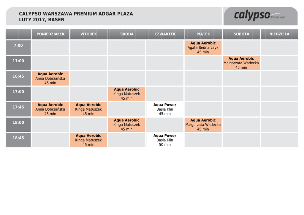 CALYPSO WARSZAWA PREMIUM ADGAR PLAZA LUTY 2017, BASEN PONIEDZIAŁEK WTOREK ŚRODA CZWARTEK PIĄTEK Aqua Aerobic Agata Bednarczyk 45 min 7:00 Aqua Aerobic Małgorzata Wadecka 45 min 11:00 16:45 Aqua Aerobic Anna Dobrzańska 45 min Aqua Aerobic Kinga Matuszek 45 min 17:00 17:45 Aqua Aerobic Anna Dobrzańska 45 min Aqua Aerobic Kinga Matuszek 45 min Aqua Power Basia Klin 45 min Aqua Aerobic Kinga Matuszek 45 min 18:00 18:45 SOBOTA Aqua Aerobic Kinga Matuszek 45 min Aqua Aerobic Małgorzata Wadecka 45 min Aqua Power Basia Klin 50 min NIEDZIELA