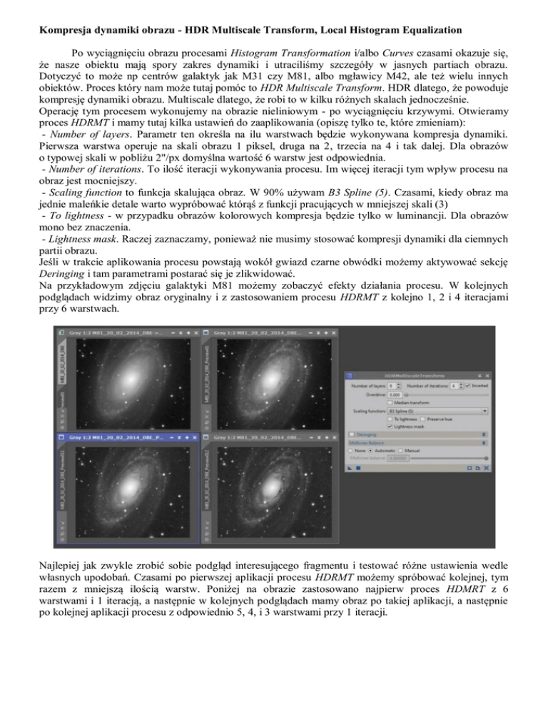 Kompresja dynamiki obrazu - HDR Multiscale Transform, Local Histogram Equalization Po wyciągnięciu obrazu procesami Histogram Transformation i/albo Curves czasami okazuje się, że nasze obiektu mają spory zakres dynamiki i utraciliśmy szczegóły w jasnych partiach obrazu. Dotyczyć to może np centrów galaktyk jak M31 czy M81, albo mgławicy M42, ale też wielu innych obiektów. Proces który nam może tutaj pomóc to HDR Multiscale Transform. HDR dlatego, że powoduje kompresję dynamiki obrazu. Multiscale dlatego, że robi to w kilku różnych skalach jednocześnie. Operację tym procesem wykonujemy na obrazie nieliniowym - po wyciągnięciu krzywymi. Otwieramy proces HDRMT i mamy tutaj kilka ustawień do zaaplikowania (opiszę tylko te, które zmieniam): - Number of layers. Parametr ten określa na ilu warstwach będzie wykonywana kompresja dynamiki. Pierwsza warstwa operuje na skali obrazu 1 piksel, druga na 2, trzecia na 4 i tak dalej. Dla obrazów o typowej skali w pobliżu 2"/px domyślna wartość 6 warstw jest odpowiednia. - Number of iterations. To ilość iteracji wykonywania procesu. Im więcej iteracji tym wpływ procesu na obraz jest mocniejszy. - Scaling function to funkcja skalująca obraz. W 90% używam B3 Spline (5). Czasami, kiedy obraz ma jednie maleńkie detale warto wypróbować którąś z funkcji pracujących w mniejszej skali (3) - To lightness - w przypadku obrazów kolorowych kompresja będzie tylko w luminancji. Dla obrazów mono bez znaczenia. - Lightness mask. Raczej zaznaczamy, ponieważ nie musimy stosować kompresji dynamiki dla ciemnych partii obrazu. Jeśli w trakcie aplikowania procesu powstają wokół gwiazd czarne obwódki możemy aktywować sekcję Deringing i tam parametrami postarać się je zlikwidować. Na przykładowym zdjęciu galaktyki M81 możemy zobaczyć efekty działania procesu. W kolejnych podglądach widzimy obraz oryginalny i z zastosowaniem procesu HDRMT z kolejno 1, 2 i 4 iteracjami przy 6 warstwach. Najlepiej jak zwykle zrobić sobie podgląd interesującego fragmentu i testować różne ustawienia wedle własnych upodobań. Czasami po pierwszej aplikacji procesu HDRMT możemy spróbować kolejnej, tym razem z mniejszą ilością warstw. Poniżej na obrazie zastosowano najpierw proces HDMRT z 6 warstwami i 1 iteracją, a następnie w kolejnych podglądach mamy obraz po takiej aplikacji, a następnie po kolejnej aplikacji procesu z odpowiednio 5, 4, i 3 warstwami przy 1 iteracji. Proces HDMRT daje dobre rezultaty na dobrej jakości materiale o dobrym stosunku sygnału do szumu. Jeśli materiał nie jest najlepszy, podczas kompresji dynamiki najprawdopodobniej wyjdzie nam w obrazie szum. No i łatwo jest przesadzić z kompresją dynamiki Obraz po procesie HDMRT jest czasami dość płaski i warto spróbować zastosować na nim proces Local Histogram Equalization. W procesie LHE zazwyczaj operuję tylko dwoma parametrami: - Contrast limit ustawiam w zakresie 1.5 - 2.5 - Amount wedle uznania - to siła działania procesu Poniżej przykładowy wynik działania procesu LHE wraz z ustawieniami (po prawej) i dla porównania oryginalny obraz sprzed wszystkich operacji opisanych w tym tutorialu (po lewej) Podczas aplikacji procesu LHE warto zwrócić uwagę na gwiazdy - jeśli LHE psuje nam obraz gwiazd trzeba je ochronić na obrazie maską (Star Mask) - oczywiście negatywową (Mask -> Invert mask), ponieważ chcemy ochronić gwiazdy. Zamiast LHE możemy do podniesienia ogólnego kontrastu użyć krzywych (Curves). Więcej na te tematy (po angielsku niestety): http://pixinsight.co...les/HDRWT/M101/ http://pixinsight.co...ls/NGC7023-HDR/ http://pixinsight.co...nlinear_Stretch jolo http://astrojolo.blogspot.com