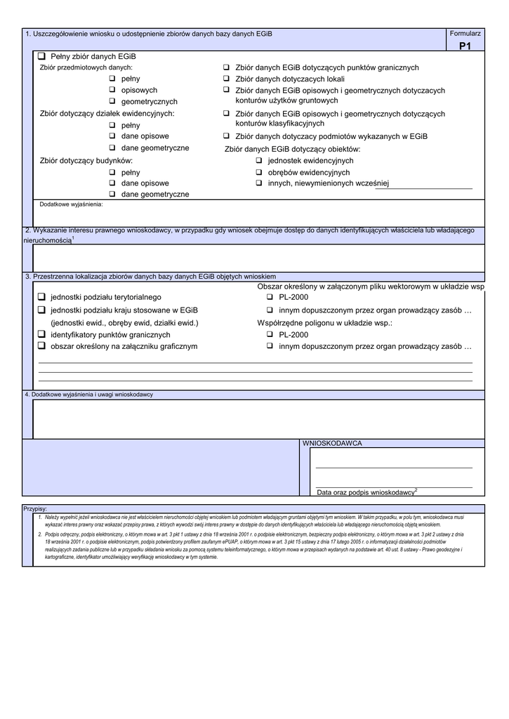1. Uszczegółowienie wniosku o udostępnienie zbiorów danych bazy danych EGiB q Formularz P1 Pełny zbiór danych EGiB Zbiór przedmiotowych danych: q pełny q opisowych q geometrycznych Zbiór dotyczący działek ewidencyjnych: q pełny q dane opisowe q dane geometryczne Zbiór dotyczący budynków: q pełny q dane opisowe q dane geometryczne q Zbiór danych EGiB dotyczących punktów granicznych q Zbiór danych dotyczacych lokali q Zbiór danych EGiB opisowych i geometrycznych dotyczacych konturów użytków gruntowych q Zbiór danych EGiB opisowych i geometrycznych dotyczących konturów klasyfikacyjnych q Zbiór danych dotyczacy podmiotów wykazanych w EGiB Zbiór danych EGiB dotyczący obiektów: q jednostek ewidencyjnych q obrębów ewidencyjnych q innych, niewymienionych wcześniej Dodatkowe wyjaśnienia: 2. Wykazanie interesu prawnego wnioskodawcy, w przypadku gdy wniosek obejmuje dostęp do danych identyfikujących właściciela lub władającego nieruchomością1 3. Przestrzenna lokalizacja zbiorów danych bazy danych EGiB objętych wnioskiem q q jednostki podziału terytorialnego jednostki podziału kraju stosowane w EGiB (jednostki ewid., obręby ewid, działki ewid.) q q identyfikatory punktów granicznych obszar określony na załączniku graficznym Obszar określony w załączonym pliku wektorowym w układzie wsp.: q PL-2000 q innym dopuszczonym przez organ prowadzący zasób … Współrzędne poligonu w układzie wsp.: q PL-2000 q innym dopuszczonym przez organ prowadzący zasób … 4. Dodatkowe wyjaśnienia i uwagi wnioskodawcy WNIOSKODAWCA Data oraz podpis wnioskodawcy2 Przypisy: 1. Należy wypełnić jeżeli wnioskodawca nie jest właścicielem nieruchomości objętej wnioskiem lub podmiotem władającym gruntami objętymi tym wnioskiem. W takim przypadku, w polu tym, wnioskodawca musi wykazać interes prawny oraz wskazać przepisy prawa, z których wywodzi swój interes prawny w dostępie do danych identyfikujących właściciela lub władającego nieruchomością objętą wnioskiem. 2. Podpis odręczny, podpis elektroniczny, o którym mowa w art. 3 pkt 1 ustawy z dnia 18 września 2001 r. o podpisie elektronicznym, bezpieczny podpis elektroniczny, o którym mowa w art. 3 pkt 2 ustawy z dnia 18 września 2001 r. o podpisie elektronicznym, podpis potwierdzony profilem zaufanym ePUAP, o którym mowa w art. 3 pkt 15 ustawy z dnia 17 lutego 2005 r. o informatyzacji działalności podmiotów realizujących zadania publiczne lub w przypadku składania wniosku za pomocą systemu teleinformatycznego, o którym mowa w przepisach wydanych na podstawie art. 40 ust. 8 ustawy - Prawo geodezyjne i kartograficzne, identyfikator umożliwiający weryfikację wnioskodawcy w tym systemie.