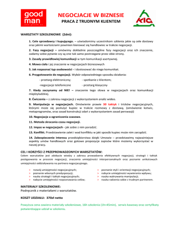 NEGOCJACJE W BIZNESIE PRACA Z TRUDNYM KLIENTEM WARSZTATY SZKOLENIOWE (2dni): 1. Cele sprzedawcy i kupującego. – uświadomimy uczestnikom szklenia jakie są cele dostawy oraz jakimi wartościami powinien kierować się handlowiec w trakcie negocjacji. 2. Fazy negocjacji – omówimy dokładnie poszczególne fazy negocjacji oraz ich znaczenie, zadamy sobie pytanie czy są one tak samo postrzegane przez obie strony. 3. Zasady prawidłowiej komunikacji w tym komunikacji asertywnej. 4. Mowa ciała i jej znaczenie w negocjacjach biznesowych 5. Jak rozpoznać typ osobowości - i dostosować do niego komunikat. 6. Przygotowanie do negocjacji. Wybór odpowiedniego sposobu działania: - przetarg elektroniczny; - spotkanie z klientem; -negocjacje telefoniczne - przetarg klasyczny 7. Kiedy zaczynamy od NIE! – znaczenie tego słowa w negocjacjach oraz komunikacji międzyludzkiej. 8. Ćwiczenia – z zakresu negocjacji z wykorzystaniem analiz wideo. 9. Manipulacja w negocjacjach. Omówienie prawie 30 taktyk i tricków negocjacyjnych, którymi może się posłużyć kupiec w trakcie rozmowy z dostawą. (omówienie kotwic, metaprogramów, oraz zasad konstrukcji zdań z wykorzystaniem zasad perswazji) 10. Negocjacje a ograniczenia czasowe. 11. Metoda skracania czasu negocjacji. 12. Impas w negocjacjach - jak sobie z nim poradzić. 13. Konflikt. Przedstawienie zalet i wad konfliktu w jaki sposób kupiec może nim zarządzić. 14. Zabezpieczenie interesu przedsiębiorstwa dzięki Umowie – przedstawimy najważniejsze aspekty umów handlowych oraz gotowe propozycje zapisów które możemy wykorzystać w naszej pracy. CEL I KORZYŚCI Z PRZEPROWADZONYCH WARSZTATÓW: Celem warsztatów jest zdobycie wiedzy z zakresu prowadzenia efektywnych negocjacji, strategii i taktyk postępowania w procesie negocjacji, znaczenia umiejętności interpersonalnych oraz poznanie unikatowych umiejętności oddziaływania na partnera negocjacyjnego. > > > > rozwój umiejętności negocjacyjnych; poznanie własnych predyspozycji; nauka strategii i taktyk negocjacyjnych; nabycie umiejętności rozpoznawania celów; > > > > poznanie styli i orientacji negocjacyjnych; nabycie umiejętności wywierania wpływu; nauka wykrywania manipulacji; nauka radzenia sobie z trudnym partnerem. MATERIAŁY SZKOLENIOWE: Podręcznik z materiałami z warsztatów. KOSZT UDZIAŁU: 370zł netto Powyższa cena zawiera materiały szkoleniowe, 16h szkolenia (1h=45min), serwis kawowy oraz certyfikaty potwierdzające udział w szkoleniu. Trener: GRZEGORZ OLECHNIEWICZ Współtworzył strategie zakupowe oraz realizował zakupy między innymi dla takich firm jak Alma S.A., Ariba Inc., Aliente Ltd., Lucent Technologies, Klienci Carrywater Group SA, TP SA, Klienci 4Results Sp. z o.o., itd. Były Procurement Manager w firmie Ariba Inc. Od 2004 roku prowadzi szkolenia oraz projekty doradcze w obszarze optymalizacji i zarządzania zakupami, negocjacji, zarządzania projektami oraz zarządzania zespołem. Od 2010 do 2012 roku Senior Konsultant w 4 Results Sp. z o.o. Od 2004 do 2012 roku Konsultant Zarządzający oraz Trener w GO-CTR Consulting, Od 2012 roku Dyrektor Zarządzający oraz główny ekspert w obszarze zakupów w firmie GOODMAN. Prowadził wykłady w ramach Studiów Podyplomowych Zakupy w Biznesie organizowanych przez WSB we Wrocławiu. Wykładowca oraz promotor na kierunku studiów podyplomowych Zakupy w Biznesie na WSB Poznań prowadzi zajęcia również z następujących przedmiotów Zarządzanie Projektami, Mediacje i Negocjacje, Zarządzanie Konfliktem, Budżetowanie i źródła finansowania, Logistyka Marketingowa. Współzałożyciel oraz członek Stowarzyszenia Managerów i Specjalistów ds. Zakupów, oraz Stowarzyszenia Profesji Zakupowej. PODSUMOWANIE ZAWODOWE Ponad 14 letnie doświadczenie kupieckie w tym ponad 8 lat doświadczenia w kierowaniu zespołem oraz zarządzaniu zakupami i projektami; Ponad 8 letnie doświadczenie w konsultingu zarządczym w branży przemysłowej i usługach oraz w prowadzeniu szkoleń biznesowych; Doświadczenie w pracy w zespole oraz na samodzielnym stanowisku; Wieloletnie doświadczenie w budowaniu i realizacji budżetów handlowych oraz zakupowych, budowie prawidłowych relacji z dostawcami w tym negocjacjach z dostawcami, funduszami i bankami, sporządzaniu umów i monitorowaniu procesu zmian; Wieloletnie doświadczenie w realizacji projektów z obszaru redukcji kosztów, restrukturyzacji, usprawniania procesów biznesowych i budowie trwałej wartości firmy; Doświadczony Trener i Coach w swojej pracy trenerskiej skupia się na skutecznym przekazaniu wiedzy, oraz budowie jak najlepszej atmosfery w trakcie prowadzonego szkolenia. REALIZACJA SZKOLEŃ I PROJEKTÓW Ariba Inc., ALMA S.A., Lucent Technologies, Emperia Holding, LPP SA, Klienci OpenNexus Sp. z o.o., Klienci LaraCo Consulting, Klienci GOODMAN, Lufthansa, Schumaher Packaging, ZRE Katowice, Wyższa Szkoła Bankowa Wrocław (Wykładowca na kierunku studiów podyplomowych Zakupy w Bznesie), , KIEL Polska, Federal-Mogul Bimet S.A., Grupa Lotos, Puls Biznesu, EURO-net właściciel marki RTV EURO AGD, TAURON, Beewatec, Hunter Douglas, Volksvagen Bank, Novartis Poland Sp. z o.o., Sandoz Polska Sp. z o.o., Amica Wronki S.A., Grupa UniCredit, Faser, NFM Production, Abakusbaby , Zespół Elektrownia Pątnów Adamów Konin itd.
