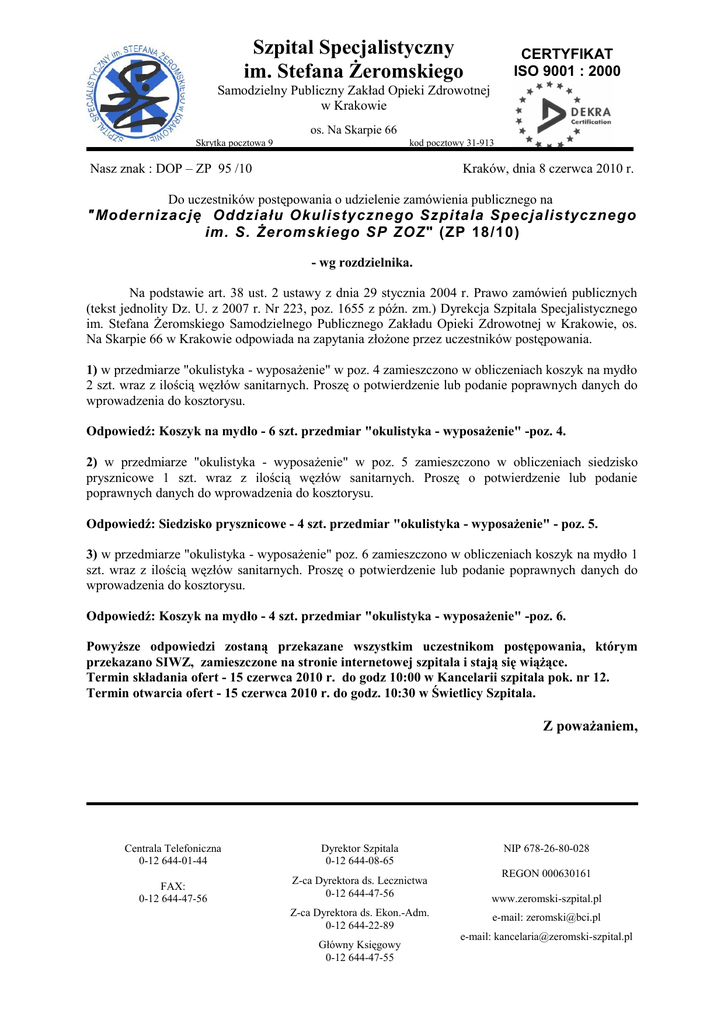 Szpital Specjalistyczny im. Stefana Żeromskiego CERTYFIKAT ISO 9001 : 2000 Samodzielny Publiczny Zakład Opieki Zdrowotnej w Krakowie os. Na Skarpie 66 Skrytka pocztowa 9 kod pocztowy 31-913 Nasz znak : DOP – ZP 95 /10 Kraków, dnia 8 czerwca 2010 r. Do uczestników postępowania o udzielenie zamówienia publicznego na "Modernizację Oddziału Okulistycznego Szpitala Specjalistycznego im. S. Żeromskiego SP ZOZ" (ZP 18/10) - wg rozdzielnika. Na podstawie art. 38 ust. 2 ustawy z dnia 29 stycznia 2004 r. Prawo zamówień publicznych (tekst jednolity Dz. U. z 2007 r. Nr 223, poz. 1655 z późn. zm.) Dyrekcja Szpitala Specjalistycznego im. Stefana Żeromskiego Samodzielnego Publicznego Zakładu Opieki Zdrowotnej w Krakowie, os. Na Skarpie 66 w Krakowie odpowiada na zapytania złożone przez uczestników postępowania. 1) w przedmiarze "okulistyka - wyposażenie" w poz. 4 zamieszczono w obliczeniach koszyk na mydło 2 szt. wraz z ilością węzłów sanitarnych. Proszę o potwierdzenie lub podanie poprawnych danych do wprowadzenia do kosztorysu. Odpowiedź: Koszyk na mydło - 6 szt. przedmiar "okulistyka - wyposażenie" -poz. 4. 2) w przedmiarze "okulistyka - wyposażenie" w poz. 5 zamieszczono w obliczeniach siedzisko prysznicowe 1 szt. wraz z ilością węzłów sanitarnych. Proszę o potwierdzenie lub podanie poprawnych danych do wprowadzenia do kosztorysu. Odpowiedź: Siedzisko prysznicowe - 4 szt. przedmiar "okulistyka - wyposażenie" - poz. 5. 3) w przedmiarze "okulistyka - wyposażenie" poz. 6 zamieszczono w obliczeniach koszyk na mydło 1 szt. wraz z ilością węzłów sanitarnych. Proszę o potwierdzenie lub podanie poprawnych danych do wprowadzenia do kosztorysu. Odpowiedź: Koszyk na mydło - 4 szt. przedmiar "okulistyka - wyposażenie" -poz. 6. Powyższe odpowiedzi zostaną przekazane wszystkim uczestnikom postępowania, którym przekazano SIWZ, zamieszczone na stronie internetowej szpitala i stają się wiążące. Termin składania ofert - 15 czerwca 2010 r. do godz 10:00 w Kancelarii szpitala pok. nr 12. Termin otwarcia ofert - 15 czerwca 2010 r. do godz. 10:30 w Świetlicy Szpitala. Z poważaniem, Centrala Telefoniczna 0-12 644-01-44 FAX: 0-12 644-47-56 Dyrektor Szpitala 0-12 644-08-65 Z-ca Dyrektora ds. Lecznictwa 0-12 644-47-56 Z-ca Dyrektora ds. Ekon.-Adm. 0-12 644-22-89 Główny Księgowy 0-12 644-47-55 NIP 678-26-80-028 REGON 000630161 www.zeromski-szpital.pl e-mail: [email protected] e-mail: [email protected]