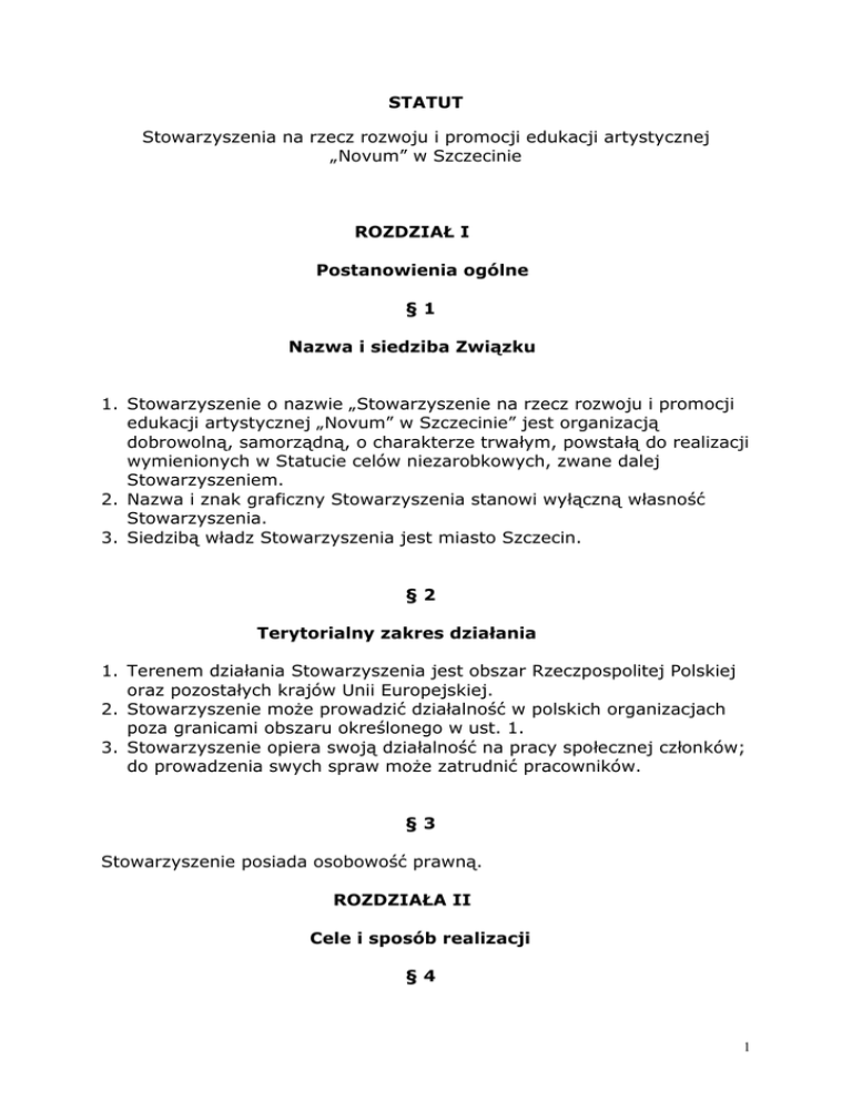STATUT Stowarzyszenia na rzecz rozwoju i promocji edukacji artystycznej „Novum” w Szczecinie ROZDZIAŁ I Postanowienia ogólne §1 Nazwa i siedziba Związku 1. Stowarzyszenie o nazwie „Stowarzyszenie na rzecz rozwoju i promocji edukacji artystycznej „Novum” w Szczecinie” jest organizacją dobrowolną, samorządną, o charakterze trwałym, powstałą do realizacji wymienionych w Statucie celów niezarobkowych, zwane dalej Stowarzyszeniem. 2. Nazwa i znak graficzny Stowarzyszenia stanowi wyłączną własność Stowarzyszenia. 3. Siedzibą władz Stowarzyszenia jest miasto Szczecin. §2 Terytorialny zakres działania 1. Terenem działania Stowarzyszenia jest obszar Rzeczpospolitej Polskiej oraz pozostałych krajów Unii Europejskiej. 2. Stowarzyszenie może prowadzić działalność w polskich organizacjach poza granicami obszaru określonego w ust. 1. 3. Stowarzyszenie opiera swoją działalność na pracy społecznej członków; do prowadzenia swych spraw może zatrudnić pracowników. §3 Stowarzyszenie posiada osobowość prawną. ROZDZIAŁA II Cele i sposób realizacji §4 1 Celem Stowarzyszenia jest: a) rozwój i promocja szkolnictwa artystycznego, b) wspieranie rozwoju talentów artystycznych, c) wymiana doświadczeń z instytucjami kultury w kraju i za granicą, d) organizacja interdyscyplinarnych projektów artystycznych i edukacyjnych, e) popularyzacja różnych form kultury polskiej i światowej, f) kształcenie aktywnych, świadomych, wymagających odbiorców sztuki. §5 Związek realizuje swoje cele przez: a) organizowanie różnorodnych projektów artystycznych, edukacyjnych i wydawniczych, b) współpracę , wymianę z instytucjami kultury w kraju i za granicą. ROZDZIAŁ III Zasady organizacji Stowarzyszenia §6 1. Stowarzyszenie jest zorganizowane na zasadach demokratycznych. 2. Decyzje organów władz Stowarzyszenia podejmowane są w formie uchwał i zapadają zwykłą większością głosów, przy obecności co najmniej połowy uprawnionych do głosowania. 3. W wypadku braku wymaganej ilości członków uprawnionych do podjęcia uchwały na zasadach jak w ust. 2, wyznacza się drugi termin. Uchwała podjęta zwykłą większością głosów w drugim terminie jest ważna bez względu na ilość obecnych uprawnionych do głosowania, chyba, że Statut stanowi inaczej. §7 1. 2. 1) 2) 3) 4) 5) Władze Stowarzyszenia pochodzą z wyboru. Wybory odbywają się na następujących zasadach: kandydatem może być wyłącznie osoba uprawniona do głosowania, nie ogranicza się liczby kandydatów, głosuje się na poszczególnych kandydatów, głosowanie jest tajne, wybory są ważne, gdy bierze w nich udział co najmniej połowa uprawnionych do głosowania, 6) wygrywa ten kandydat, który uzyskał największą liczbę głosów, 2 7) w składzie Zarządu Stowarzyszenia większość muszą stanowić osoby o pełnej zdolności do czynności prawnych. 3. W wypadku odwołania osób wybranych w skład organów władzy Stowarzyszenia przed upływem kadencji postanowienia ust. 2 stosuje się odpowiednio. ROZDZIAŁ IV Zasady nabywania członkostwa §8 Członkowie Stowarzyszenia dzielą się na: 1. zwyczajnych, 2. wspierających, 3. honorowych. §9 1. Członkiem zwyczajnym może być każda osoba pełnoletnia, która zadeklarowała na piśmie chęć przystąpienia do Stowarzyszenia, przyjęła jego Statut i daje temu wyraz w swej działalności, jak również osoba niepełnoletnia od 16 roku życia, która ponadto złożyła pisemną zgodę rodziców lub opiekunów na działalność w Stowarzyszeniu. 2. Członkostwo w Stowarzyszeniu jest nabywane na podstawie uchwały Zarządu podjętej w oparciu o pisemną deklarację członka. 3. Członkostwo ustaje z chwilą podjęcia uchwały Zarządu o wykreślenie na podstawie pisemnego oświadczenia o rezygnacji lub wykluczeniu z powodu niewywiązywania się członka z obowiązków, na zasadach określonych w Statucie. 4. Członkom zwyczajnym Stowarzyszenia przysługują następujące prawa: a) czynne i bierne prawo wyborcze do władz Stowarzyszenia, b) podejmowania inicjatyw, zgłaszania wniosków dotyczących działalności Stowarzyszenia i głosowania uchwał na zebraniach Stowarzyszenia zgodnie z postanowieniem Statutu, c) korzystania z urządzeń i udziału we wszystkich imprezach organizowanych przez Stowarzyszenie. 5 Obowiązki członków zwyczajnych Stowarzyszenia są następujące: a) branie czynnego udziału w pracach Stowarzyszenia i realizacji jego celów, 3 b) przestrzeganie postanowień statutu, regulaminów i uchwał władz Stowarzyszenia, c) regularne płacenie składek członkowskich. § 10 1. Członkiem wspierającym może być zarówno osoba fizyczna jak i prawna, która przyjęła statut i zadeklarowała na piśmie systematyczne wspieranie finansowe lub rzeczowe Stowarzyszenia. 2. Członkostwo w Stowarzyszeniu jest nabywane na podstawie uchwały Zarządu podjętej w oparciu o pisemną deklarację członka. 3. Członkostwo członka wspierającego ustaje z chwilą podjęcia uchwały Zarządu w związku z niewywiązywaniem się z deklaracji wspierania finansowego lub rzeczowego Stowarzyszenia. 4. Członek wspierający lub jego przedstawiciel ma prawo do: a) zgłaszania wniosków dotyczących działalności Stowarzyszenia, b) korzystania z urządzeń i udziału we wszystkich imprezach organizowanych przez Stowarzyszenie. § 11 1. Członkiem honorowym może być każda osoba, której kandydaturę zgłoszono na piśmie. 2. Członkostwo honorowe jest nabywane na podstawie uchwały Walnego Zebrania Członków. 3. Uprawnienia członków honorowych są analogiczne do uprawnień członków wspierających. § 12 1. W wypadku naruszenia przez członka w działalności Stowarzyszenia postanowień Statutu lub obowiązującego Stowarzyszenia prawa, Zarząd może zastosować następujące kary: 1) upomnienia, 2) nagany, 3) wykluczenia ze Stowarzyszenia. 2. Od decyzji Zarządu o zastosowaniu kar wymienionych w ust. 1 przysługuje odwoła