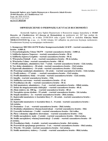 Rzeszów, dnia 2014-07-21 Komornik Sądowy przy Sądzie Rejonowym w Rzeszowie Jakub Kwater 35-045 Rzeszów, ul. Chodkiewicza 6/3 Sygn. akt KM 1614/14 W odpowiedzi podać: sygn. akt KM tel. 0-/17/ 8525140 OBWIESZCZENIE O PIERWSZEJ LICYTACJI RUCHOMOŚCI Komornik Sądowy przy Sądzie Rejonowym w Rzeszowie mający kancelarię w 35-045 Rzeszów, ul. Chodkiewicza 6/3 (boczna ul. Hetmańskiej) na podstawie art. 867 kpc podaje do publicznej wiadomości, że w dniu 25/08/2014 roku o godz 10.00 w siedzibie Fabryka Mebli MEBLO-SYSTEM Sp. z o.o. z/s. 36-060 Zabajka 365 odbędzie się pierwsza licytacja ruchomości. Przedmiotem licytacji są następujące ruchomości: 1. Kompresor HD 520-3.0/270 Walter Kompressortechnik 3.0 KW - wartość szacunkowa brutto - 4.000 zł. 2. Frezarkokopiarka Tekna TK579 - wartość szacunkowa brutto - 3.000 zł. 3. Szlifierka kątowa Nupower - wartość szacunkowa brutto - 50 zł. 4. Szlifierka kątowa Graphite - wartość szacunkowa brutto - 50 zł. 5. Wkrętarka Einhall - 2 szt. - wartość szacunkowa brutto - 50 zł./sztuka. 6. Wiertarka Celma - wartość szacunkowa brutto - 100 zł. 7. Profil zamknięty, aluminiowy 6x6 - 7 sztuk - wartość szacunkowa brutto - 12zł./sztuka. 8. Tor dolny aluminiowy - 20 sztuk - wartość szacunkowa brutto - 12zł./sztuka. 9. Kątownik aluminiowy - 14 sztuk - wartość szacunkowa brutto - 12zł./sztuka. 10. Prostokąt zamknięty aluminiowy - 26 sztuk - wartość szacunkowa brutto - 12zł./sztuka. 11. Profil stalowy - 17 sztuk - - wartość szacunkowa brutto - 12zł./sztuka. 12. Profil aluminiowy biały - 14 sztuk - wartość szacunkowa brutto - 12zł./sztuka. 13. Imadło - wartość szacunkowa brutto - 15zł. 14. Szlifierka czerwona - wartość szacunkowa brutto - 15 zł. 15. Przedłużacz do siły - wartość szacunkowa brutto - 30 zł. 16. Stół montażowy aluminiowy - 2 szt. - wartość szacunkowa brutto - 100zł./sztuka. 17. Stelaż do magazynowania szkła/płyt - wartość szacunkowa brutto - 40 zł. 18. Złom stalowy ok. 100 kg. - wartość szacunkowa brutto - 80 zł. 19. Narzędzia ręczne drobne - 53 sztuki - wartość szacunkowa brutto - 2zł./sztuka. 20. Stojak metalowy - 2x - wartość szacunkowa brutto - 20zł./sztuka. 21. Kątowniki montażowe w kształcie litery T - 26 sztuk - wartość szacunkowa brutto 2zł./sztuka. 22. Kątowniki montażowe w kształcie litery L - 8 sztuk - wartość szacunkowa brutto 2zł./sztuka. 23. Poziomica - 2 szt. - wartość szacunkowa brutto - 20zł./sztuka. 24. Drabinka aluminiowa własnej konstrukcji - wartość szacunkowa brutto - 10zł. 25. Uszczelki techniczne - 3 rolki - wartość szacunkowa brutto - 5zł./rolka. 26. Płyty i elementy odpadowe drewniane - wartość szacunkowa brutto - 15zł. 27. Stolik narzędziowy mały - 2 sztuki - wartość szacunkowa brutto - 10zł./sztuka. 28. Stolik narzędziowy własnej konstrukcji - 2 sztuki - wartość szacunkowa brutto - 10 zł./sztuka. 29. Przedłużacz biały - 4 sztuki - wartość szacunkowa brutto - 8zł./sztuka. 30. Przewód do sprężonego powietrza - 3 szt. - wartość szacunkowa brutto - 10zł./sztuka. 31. Wiertło - 54 sztuki - wartość szacunkowa brutto - 1zł./sztuka. 32. Stolik montażowy stalowy - 3 sztuki - wartość szacunkowa brutto - 80zł./sztuka. Ceną wywoławczą każdej ruchomości w powyższej licytacji jest 3/4 wartości szacunkowej podanej w obwieszczeniu. Powyższe ruchomości można oglądać w dniu licytacji w godz. 9.30 - 10.00. Przystępujący do przetargu obowiązany jest złożyć rękojmię w wysokości jednej dziesiątej sumy oszacowania. Rękojmię złożoną przez licytanta, któremu udzielono przybicia, zatrzymuje się; pozostałym licytantom rękojmię zwraca się niezwłocznie. Jeżeli nabywca nie wykonał w terminie warunków licytacji co do zapłaty ceny, traci rękojmię, a skutki przybicia wygasają. Z utraconej rękojmi pokrywa się koszty egzekucji związanej ze sprzedażą, a reszta wchodzi w skład sumy uzyskanej w egzekucji albo jeżeli egzekucja została umorzona jest przelewana na dochód Skarbu Państwa. Komornik zastrzega sobie prawo do odwołania licytacji w całości lub wycofania dowolnych ruchomości bez podania przyczyny. Nabywcy nie przysługują roszczenia z tytułu rękojmi za wady rzeczy; przeciwko nabywcy nie można podnosić zarzutów co do ważności nabycia. Nabywca staje się właścicielem rzeczy bez żadnych obciążeń. Nabywca obowiązany jest zapłacić cenę nabycia natychmiast po udzieleniu mu przybcia. Gdy jednak cena przewyższa pięćset złotych, obowiązek nabywcy ogranicza się do zlożenia natychmiast jednej piątej ceny, nie mniej jednak niż pięćset złotych, przy czym reszta powinna być uiszczona do godziny dwunastej dnia następnego. Licytacja prowadzona jest na podstawie przepisów kodeksu postępowania cywilnego. Komornik Sądowy Jakub Kwater Otrzymują: - wierzyciel; - dłużnik; - Sąd Rejonowy - tablica ogłoszeń;