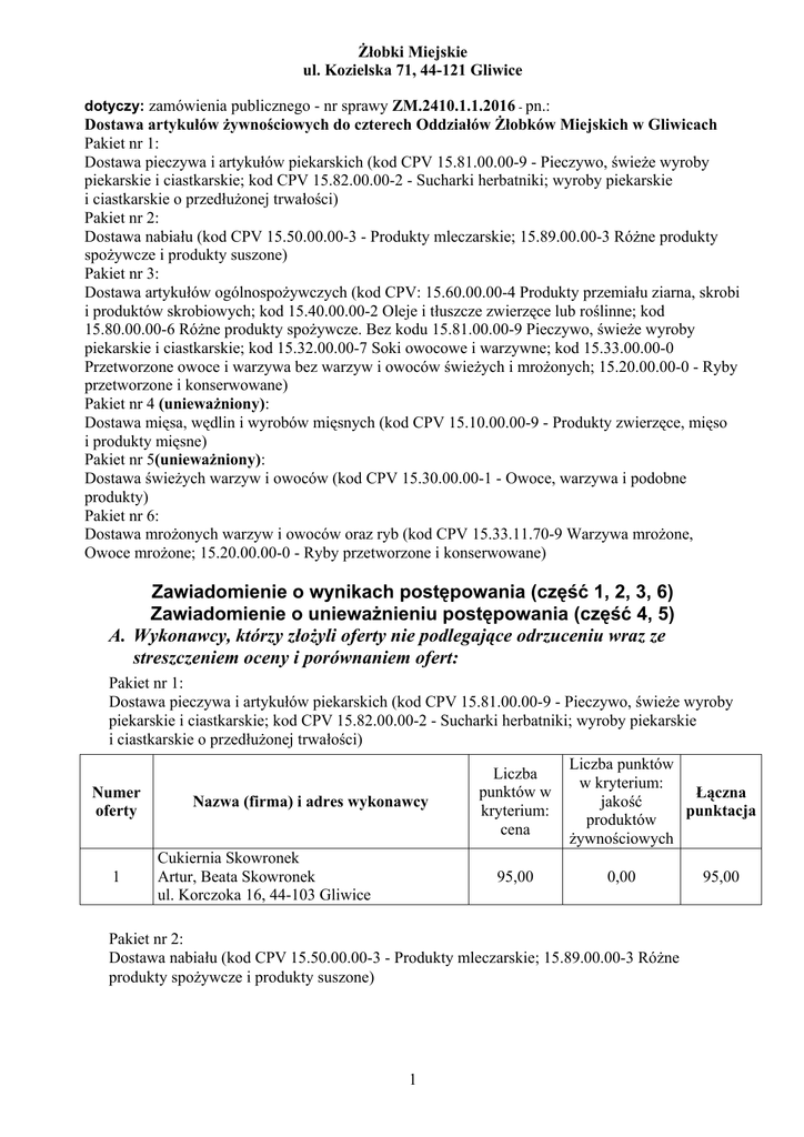 Żłobki Miejskie ul. Kozielska 71, 44-121 Gliwice dotyczy: zamówienia publicznego - nr sprawy ZM.2410.1.1.2016 - pn.: Dostawa artykułów żywnościowych do czterech Oddziałów Żłobków Miejskich w Gliwicach Pakiet nr 1: Dostawa pieczywa i artykułów piekarskich (kod CPV 15.81.00.00-9 - Pieczywo, świeże wyroby piekarskie i ciastkarskie; kod CPV 15.82.00.00-2 - Sucharki herbatniki; wyroby piekarskie i ciastkarskie o przedłużonej trwałości) Pakiet nr 2: Dostawa nabiału (kod CPV 15.50.00.00-3 - Produkty mleczarskie; 15.89.00.00-3 Różne produkty spożywcze i produkty suszone) Pakiet nr 3: Dostawa artykułów ogólnospożywczych (kod CPV: 15.60.00.00-4 Produkty przemiału ziarna, skrobi i produktów skrobiowych; kod 15.40.00.00-2 Oleje i tłuszcze zwierzęce lub roślinne; kod 15.80.00.00-6 Różne produkty spożywcze. Bez kodu 15.81.00.00-9 Pieczywo, świeże wyroby piekarskie i ciastkarskie; kod 15.32.00.00-7 Soki owocowe i warzywne; kod 15.33.00.00-0 Przetworzone owoce i warzywa bez warzyw i owoców świeżych i mrożonych; 15.20.00.00-0 - Ryby przetworzone i konserwowane) Pakiet nr 4 (unieważniony): Dostawa mięsa, wędlin i wyrobów mięsnych (kod CPV 15.10.00.00-9 - Produkty zwierzęce, mięso i produkty mięsne) Pakiet nr 5(unieważniony): Dostawa świeżych warzyw i owoców (kod CPV 15.30.00.00-1 - Owoce, warzywa i podobne produkty) Pakiet nr 6: Dostawa mrożonych warzyw i owoców oraz ryb (kod CPV 15.33.11.70-9 Warzywa mrożone, Owoce mrożone; 15.20.00.00-0 - Ryby przetworzone i konserwowane) Zawiadomienie o wynikach postępowania (część 1, 2, 3, 6) Zawiadomienie o unieważnieniu postępowania (część 4, 5) A. Wykonawcy, którzy złożyli oferty nie podlegające odrzuceniu wraz ze streszczeniem oceny i porównaniem ofert: Pakiet nr 1: Dostawa pieczywa i artykułów piekarskich (kod CPV 15.81.00.00-9 - Pieczywo, świeże wyroby piekarskie i ciastkarskie; kod CPV 15.82.00.00-2 - Sucharki herbatniki; wyroby piekarskie i ciastkarskie o przedłużonej trwałości) Numer oferty 1 Nazwa (firma) i adres wykonawcy Cukiernia Skowronek Artur, Beata Skowronek ul. Korczoka 16, 44-103 Gliwice Liczba punktów w kryterium: cena 95,00 Liczba punktów w kryterium: Łączna jakość punktacja produktów żywnościowych 0,00 Pakiet nr 2: Dostawa nabiału (kod CPV 15.50.00.00-3 - Produkty mleczarskie; 15.89.00.00-3 Różne produkty spożywcze i produkty suszone) 1 95,00 Numer oferty 6 Nazwa (firma) i adres wykonawcy SEMI sp. z o.o. ul. Moniuszki 13, 44-100 Gliwice Liczba punktów w kryterium: cena 95,00 Liczba punktów w kryterium: Łączna jakość punktacja produktów żywnościowych 0,00 95,00 Pakiet nr 3: Dostawa artykułów ogólnospożywczych (kod CPV: 15.60.00.00-4 Produkty przemiału ziarna, skrobi i produktów skrobiowych; kod 15.40.00.00-2 Oleje i tłuszcze zwierzęce lub roślinne; kod 15.80.00.00-6 Różne produkty spożywcze. Bez kodu 15.81.00.00-9 Pieczywo, świeże wyroby piekarskie i ciastkarskie; kod 15.32.00.00-7 Soki owocowe i warzywne; kod 15.33.00.00-0 Przetworzone owoce i warzywa bez warzyw i owoców świeżych i mrożonych; 15.20.00.00-0 Ryby przetworzone i konserwowane) Numer oferty 3 Nazwa (firma) i adres wykonawcy F.H.U. Jak-Just Paweł Janisio ul. Wolności 526c/7, 41-800 Zabrze Liczba punktów w kryterium: cena 95,00 Liczba punktów w kryterium: Łączna jakość punktacja produktów żywnościowych 0,00 95,00 Pakiet nr 6: Dostawa mrożonych warzyw i owoców oraz ryb (kod CPV 15.33.11.70-9 Warzywa mrożone, Owoce mrożone; 15.20.00.00-0 - Ryby przetworzone i konserwowane) Numer oferty Nazwa (firma) i adres wykonawcy Liczba punktów w kryterium: cena Liczba punktów w kryterium: Łączna jakość punktacja produktów żywnościowych 4 NORDIS S.A. ul. Głogowska 35, 45-315 Opole 95,00 0,00 95,00 5 Firma Handlowa MAR-TAD Maria, Tadeusz Jęrusik sp.j. ul. Struzika 10A/11, 41-800 Zabrze 94,88 0,00 94,88 B. Zawiadomienie o wyborze najkorzystniejszej oferty Na podstawie art. 92 ust. 1 pkt. 1 ustawy z dnia 29 stycznia 2004 r. Prawo zamówień publicznych (t. j. Dz. U. z 2013 r. poz. 907 z pózn. zm.) w imieniu zamawiającego informuję, że w niniejszym postępowaniu została wybrana oferta złożona przez firmę: a) pakiet nr 1 Cukiernia Skowronek Artur, Beata Skowronek ul. Korczoka 16, 44-103 Gliwice cena oferty: 6559,38 złotych brutto Uzasadnienie wniosku: oferta spełnia wymogi SIWZ i uzyskała najwyższą ilość punktów według kryterium ocen podanych w specyfikacji. b) pakiet nr 2 SEMI sp. z o.o. ul. Moniuszki 13, 44-100 Gliwice cena oferty: 27249,31 złotych brutto 2 Uzasadnienie wniosku: oferta spełnia wymogi SIWZ i uzyskała najwyższą ilość punktów według kryterium ocen podanych w specyfikacji. c) pakiet nr 3 F.H.U. Jak-Just Paweł Janisio ul. Wolności 526c/7, 41-800 Zabrze cena oferty: 20598,68 złotych brutto Uzasadnienie wniosku: oferta spełnia wymogi SIWZ i uzyskała najwyższą ilość punktów według kryterium ocen podanych w specyfikacji. d) pakiet nr 6 NORDIS S.A. ul. Głogowska 35, 45-315 Opole cena oferty: 13372,28 złotych brutto Uzasadnienie wniosku: oferta spełnia wymogi SIWZ i uzyskała najwyższą ilość punktów według kryterium ocen podanych w specyfikacji. C. Zawiadomienie o unieważnieniu postępowania w zakresie części i części 5 (pakiet nr 4, pakiet nr 5) Pakiet nr 4: Dostawa mięsa, wędlin i wyrobów mięsnych (kod CPV 15.10.00.00-9 - Produkty zwierzęce, mięso i produkty mięsne) Uzasadnienie: W prowadzonym postępowaniu przetargowym na ww. pakiet nie została złożona żadna oferta. Wobec powyższego na podstawie art. 93 ust. 1 pkt 1 ustawy z dnia 29 stycznia 2004 r. Prawo zamówień publicznych (t. j. Dz. U. z 2015 r. poz.2164) postępowanie o udzielenie zamówienia publicznego, w tym zakresie, zostaje unieważnione Pakiet nr 5: Dostawa świeżych warzyw i owoców (kod CPV 15.30.00.00-1 - Owoce, warzywa i podobne produkty) Uzasadnienie: Wartość oferty, która mogła by być uznana za najkorzystniejszą we