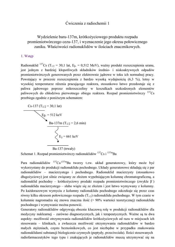 Ćwiczenia z radiochemii 1 Wydzielenie baru-137m, krótkożyciowego produktu rozpadu promieniotwórczego cezu-137, i wyznaczenie jego okresu połowicznego zaniku. Właściwości radionuklidów w ilościach znacznikowych. 1. Wstęp Radionuklid 137Cs (T1/2 = 30,1 lat, Eβ- = 0,512 MeV), ważny produkt rozszczepienia uranu, jest jednym z bardziej kłopotliwych składników średnio- i niskoaktywnych odpadów promieniotwórczych generowanych przez elektrownie jądrowe w toku ich normalnej pracy. Powstający w procesie rozszczepienia z bardzo wysoką wydajnością (6,3 %), lotny w wysokiej temperaturze rdzenia pracującego reaktora, stosunkowo łatwo przedostaje się z paliwa jądrowego poprzez mikroszczeliny w koszulkach uszkodzonych elementów paliwowych do chłodziwa pierwotnego obiegu reaktora. Rozpad promieniotwórczy 137Cs przebiega zgodnie z poniższym schematem: Cs-137 (T1/2 = 30,1 lat) Eβ- = 512 keV Ba-137m (T1/2 = 2,6 min) Eγ = 661 keV Ba-137 (trwały) Schemat 1. Rozpad promieniotwórczy radionuklidów 137Cs i 137mBa Para radionuklidów 137Cs/137mBa tworzy t.zw. układ generatorowy, który może być wykorzystany do produkcji radionuklidu pochodnego. Układy generatorowe składają się z par radionuklidów – macierzystego i pochodnego. Radionuklid macierzysty (stosunkowo długożyciowy) jest silnie związany ze złożem wypełniającym kolumnę chromatograficzną, a radionuklid pochodny – krótkożyciowy produkt rozpadu promieniotwórczego (zwykle β–) radionuklidu macierzystego – słabo wiąże się ze złożem i jest łatwo wymywany z kolumny. Po każdorazowym wymyciu z kolumny radionuklidu pochodnego odczekuje się przez czas równy kilku okresom połowicznego rozpadu (T1/2) radionuklidu pochodnego. W tym czasie w kolumnie nagromadza się znowu znaczna ilość (> 90% wartości teoretycznej) radionuklidu pochodnego i wymywanie można ponowić. Generatory radionuklidów odgrywają obecnie kluczową rolę w produkcji radionuklidów dla medycyny nuklearnej – zarówno diagnostycznych, jak i terapeutycznych. Ważne są tu dwa aspekty: możliwość otrzymywania radionuklidów krótkożyciowych od razu w miejscach ich stosowania – klinikach, a zwłaszcza możliwość otrzymywania radionuklidów w bardzo małych stężeniach, często beznośnikowych, co jest niezbędne w przypadku znakowania radionuklidami substancji biologicznie czynnych (peptydy, przeciwciała). Ilości stosowanych radiofarmaceutyków tego typu i znakujących je radionuklidów muszą utrzymywać się na poziomie znacznikowym, tj. poniżej 10–8 g substancji lub stężeń poniżej 10–10 mol/dm3. Są to ilości niewagowe. Generatory radionuklidów stosowane są również do otrzymywania radioznaczników do badań przemysłowych, środowiskowych itp. Układ generatorowy 137Cs/137mBa – ze względu na krótki okres połowicznego rozpadu radionuklidu pochodnego – ma niewielkie znaczenie praktyczne [1], ale stanowi wartościowy układ demonstracyjny. Jak wynika ze schematu 1, 137mBa wymywany z generatora nie jest formalnie radionuklidem beznośnikowym. Wraz z promieniotwórczym izotopem 137mBa z kolumny wymywa się produkt jego rozpadu (przejścia izomerycznego 137mBa → 137Ba) – trwały izotop 137Ba, który, stanowi nośnik izotopowy radionuklidu 137mBa, a rozdzielenie mieszaniny tych izotopów jest praktycznie niemożliwe. Ilość nośnika nie jest jednak w tym przypadku duża. Liczba atomów (masa) nośnika jest zazwyczaj większa od ilości radionuklidu w próbce (patrz niżej), ale jeżeli proces wymywania baru z kolumny generatora powtarzany jest bezpośrednio jeden po drugim, ilości te są porównywalne. Ilość nośnika szybko rośnie z upływem czasu dzielącego dwa kolejne procesy wymywania baru. Takie preparaty promieniotwórcze, które zawierają radionuklid razem z jego trwałym lub długożyciowym izotopem – produktem rozpadu (przejścia izomerycznego) tego radionuklidu, nazywamy radionuklidami bez dodanego nośnika (no-carrier-added), w skrócie n.c.a. Proces nagromadzania się promieniotwórczych produktów 2 (tu 137mBa) rozpadu radionuklidu macierzystego 1 (tu 137Cs) opisuje [1,2] równanie: N 2 λ1 λ 2 − λ1 0 N 1 (e −λ t 1 −e −λt 2 0 ) N 2e −λ t 2 (1) gdzie N2 – liczba atomów radionuklidu pochodnego po czasie t, N0 – początkowa (w czasie t=0) liczba atomów odpowiedniego radionuklidu, λ1 i λ2 – stałe rozpadu radionuklidu macierzystego i pochodnego (λ = ln2/T1/2). Stan równowagi procesu (kiedy szybkość nagromadzania radionuklidu pochodnego zrównuje się z szybkością jego zaniku) osiąga się praktycznie (99,9 %) po czasie równym od kilku do najwyżej 10 okresów T1/2(2), zależnie od wartości stosunku T1/2(1)/T1/2(2). Radionuklid macierzysty w generatorach radionuklidów jest zawsze bardziej długożyciowy niż radionuklid pochodny, a więc T1/2(1) > T1/2(2) i λ1 < λ2. Jeżeli stosunki tych wartości nie są zbyt duże (najwyżej kilka do kilkudziesięciu razy), to aktywność promieniotwórcza radionuklidu pochodnego po osiągnięciu stanu równowagi zaczyna spadać z szybkością określoną przez stałą rozpadu radionuklidu macierzystego. Stan taki nazywamy równowagą przejściową. Przypadek taki będzie rozważany w następnym ćwiczeniu. Jeśli natomiast radionuklid macierzysty jest bardzo długożyciowy, T1/2(1)>>T1/2(2) i λ1<<λ2, a taki przypadek ma miejsce w generatorze 137Cs/137mBa, to aktywność promieniotwórcza radionuklidu pochodnego po osiągnięciu stanu równowagi pozostaje praktycznie wartością stałą, a stan taki nazywamy równowagą trwałą. Równanie opisujące nagromadzanie się promieniotwórczych produktów rozpadu w przypadku równowagi trwałej upraszcza się (przy 0 dodatkowym założeniu N 2 = 0) do t λ1 N 1 (1− e−λ 2 ) λ2 Ponieważ aktywność promieniotwórcza radionuklidu i zdefiniowana jest jako: N2 (2) Ai = dNi/dt = λiNi (3) A2 A1 (1− e−λ 2t ) (4) to mamy: W warunkach równowagi trwałej, tj.