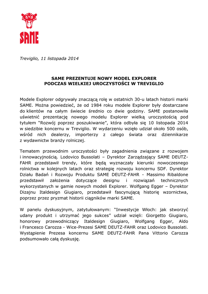 Treviglio, 11 listopada 2014 SAME PREZENTUJE NOWY MODEL EXPLORER PODCZAS WIELKIEJ UROCZYSTOŚCI W TREVIGLIO Modele Explorer odgrywały znaczącą rolę w ostatnich 30-u latach historii marki SAME. Można powiedzieć, że od 1984 roku modele Explorer były dostarczane do klientów na całym świecie średnio co dwie godziny. SAME postanowiła uświetnić prezentację nowego modelu Explorer wielką uroczystością pod tytułem “Rozwój poprzez poszukiwanie”, która odbyła się 10 listopada 2014 w siedzibie koncernu w Treviglio. W wydarzeniu wzięło udział około 500 osób, wśród nich dealerzy, importerzy z całego świata oraz dziennikarze z wydawnictw branży rolniczej. Tematem przewodnim uroczystości były zagadnienia związane z rozwojem i innowacyjnością. Lodovico Bussolati – Dyrektor Zarządzający SAME DEUTZFAHR przedstawił trendy, które będą wyznaczały kierunki nowoczesnego rolnictwa w kolejnych latach oraz strategię rozwoju koncernu SDF. Dyrektor Działu Badań i Rozwoju Produktu SAME DEUTZ-FAHR - Massimo Ribaldone przedstawił założenia dotyczące designu i rozwiązań technicznych wykorzystanych w gamie nowych modeli Explorer. Wolfgang Egger – Dyrektor Dizajnu Italdesign Giugiaro, przedstawił fascynującą historię wzornictwa, poprzez przez pryzmat historii ciągników marki SAME. W panelu dyskusyjnym, zatytułowanym: “Inwestycje Włoch: jak stworzyć udany produkt i utrzymać jego sukces” udział wzięli: Giorgetto Giugiaro, honorowy przewodniczący Italdesign Giugiaro, Wolfgang Egger, Aldo i Francesco Carozza - Wice-Prezesi SAME DEUTZ-FAHR oraz Lodovico Bussolati. Wystąpienie Prezesa koncernu SAME DEUTZ-FAHR Pana Vittorio Carozza podsumowało całą dyskusję. Wieczór uświetniła uroczysta kolacja, w trakcie której pięciu klientów wraz z rodzinami zostało nagrodzonych za wieloletnią lojalność i oddanie produktom marki SAME. Nowe modele Explorer będą także, jednym z głównych punktów ekspozycji marki SAME na stoisku w trakcie targów EIMA w Bolonii, które rozpoczynają się już 12 listopada 2014 roku. Trzy gamy, jedenaście modeli, silniki FARMotion, nowa kabina oraz układy napędowe sprawiają, że nowy Explorer ponownie staje się idealnym pomocnikiem w pracach nowoczesnego rolnika. SAME Towarzysz nowoczesnego rolnika oferujący wiele w otwartym polu, gospodarstwie, sadzie lub winnicy. www.same-tractors.com www.facebook.com/SAMEtractors www.youtube.com/user/sametractors uniwersalnych ciągników do pracy Informacje o SAME DEUTZ-FAHR SAME DEUTZ-FAHR, z siedzibą główną we Włoszech, w Treviglio w prowincji Bergamo, jest jednym z najważniejszych światowych producentów ciągników, kombajnów i silników diesla. Prowadzi dystrybucję swoich produktów pod markami DEUTZ-FAHR, SAME, Lamborghini Trattori, Hürlimann, Grégoire i Lamborghini Green Pro. Gama ciągników obejmuje moce od 23 do 270 KM, a gama kombajnów - od 100 do 395 KM. SAME DEUTZ-FAHR posiada 7 zakładów produkcyjnych, 13 oddziałów handlowych, 1 spółkę joint venture, 141 importerów i ponad 3 tysiące dealerów na całym świecie, zatrudniając łącznie ponad 3100 pracowników. W 2013 firma zanotowała obroty o wartości 1212 milionów Euro i EBIT na poziomie 6,9%. www.samedeutz-fahr.com Informacje dla prasy Communication Dept. [email protected] Tel. +39 0363 421 778