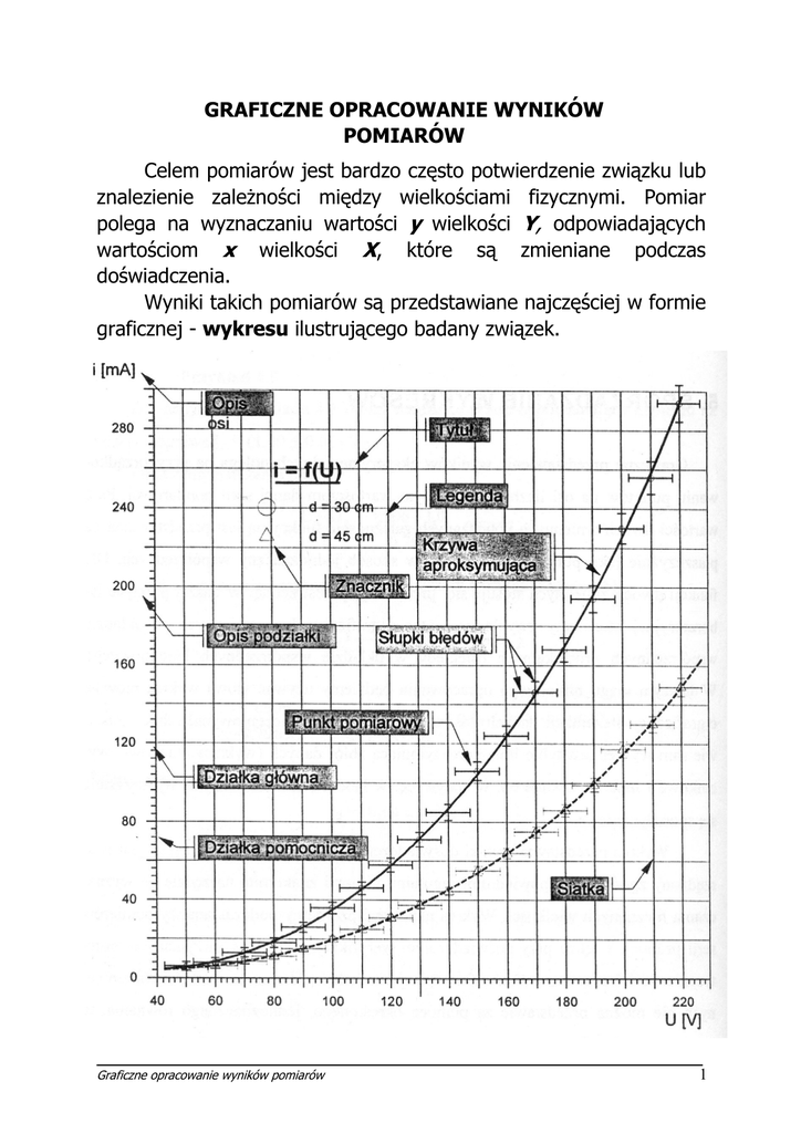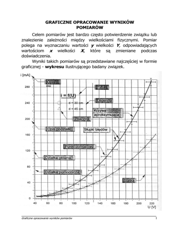 GRAFICZNE OPRACOWANIE WYNIKÓW POMIARÓW Celem pomiarów jest bardzo często potwierdzenie związku lub znalezienie zależności między wielkościami fizycznymi. Pomiar polega na wyznaczaniu wartości y wielkości Y, odpowiadających wartościom x wielkości X, które są zmieniane podczas doświadczenia. Wyniki takich pomiarów są przedstawiane najczęściej w formie graficznej - wykresu ilustrującego badany związek. Graficzne opracowanie wyników pomiarów 1 Rysowanie wykresów Wykresy najczęściej rysujemy we współrzędnych kartezjańskich. Wykonujemy je ręcznie lub za pomocą komputera. Wykresy sporządzane ręcznie rysujemy na papierze milimetrowym formatu A4 lub A5. Pierwszą czynnością, jaką musimy wykonać jest dobór odpowiednich skal na osiach y oraz x. Dobierając skale wykresu kierujemy się następującymi zasadami: 1. Wykres powinien obejmować wszystkie (lub prawie wszystkie) punkty pomiarowe. 2. Skale muszą być tak dobrane, aby format wykresu był zbliżony do kwadratu lub formatu papieru milimetrowego. 3. Działki skali wykresu wybieramy tak, aby można było łatwo znaleźć wartości współrzędnych punktu (wartości wielkości mierzonych) - działki powinny mieć „okrągłe" wartości (np. 5, 10, 20, 25 mm, nie zaś 5,5; 10,6; 12 mm) i odpowiadać również „okrągłym" wartościom wielkości mierzonych, np. 1, 2, 4, 5, 10 jednostek. Należy unikać liczb 3 i 7 oraz ich wielokrotności. Graficzne opracowanie wyników pomiarów 2 4. Początek układu współrzędnych wybieramy tak, aby wartości najmniejsze leżały w pobliżu osi układu (wykres nie musi zaczynać się od zera!). Natomiast długość osi dobieramy tak, aby wartości maksymalne leżały w pobliżu ich końców. 5. Osie układu muszą być opisane. Obok osi należy podać nazwę wielkości lub powszechnie stosowany skrót oraz jednostki, np. i [mA], U [k V], l [mm], t [ms], T [K], natężenie światła [jednostki względne]. Działki główne (odpowiadające okrągłym wartościom) powinny być również opisane. Po przygotowaniu osi na wykres nanosimy punkty pomiarowe, które nie mogą być oznaczane kropkami. Kropki służą tylko do oznaczania położenia punktów pomiarowych przed ich właściwym oznaczeniem. Punkty pomiarowe zaznaczamy kółkami, krzyżykami, trójkątami lub innymi figurami geometrycznymi tak, aby środek figury znalazł się w miejscu o współrzędnych odpowiadających danemu punktowi. Wynikiem eksperymentu są punkty pomiarowe, nie zaś krzywa, za pomocą której te punkty połączono! Graficzne opracowanie wyników pomiarów 3 Na wykres, oprócz punktów pomiarowych, nanosimy niepewności pomiarów. Niepewności zaznaczamy w postaci prostokąta niepewności, którego środek leży w punkcie pomiarowym, a boki są równe podwójnej wartości niepewności pomiaru. Zamiast prostokąta można nanieść krzyż, którego odcinki pionowy i poziomy mają długości odpowiadające wartościom niepewności pomiarów. Rysując krzywą odzwierciedlającą badaną zależność, należy pamiętać, że większość zjawisk obserwowanych w przyrodzie jest opisywana funkcjami gładkimi (różniczkowalnymi), dlatego łączenie punktów pomiarowych krzywą łamaną jest niedopuszczalne. Krzywą rysujemy tak, aby przechodziła w pobliżu możliwie największej liczby punktów i aby lokalnie liczba punktów leżących po obu jej stronach była jednakowa [prostą rysujemy za pomocą przeźroczystej linijki, gdy zależność jest nieliniowa korzystamy z przeźroczystych krzywików]. Na wykresie mogą być zamieszczone dodatkowe informacje i oznaczenia potrzebne do dalszego opracowania wyników. Graficzne opracowanie wyników pomiarów 4 Wyznaczanie nachylenia wykresu Nachylenie krzywej (tangens kąta nachylenia stycznej do krzywej) będącej wykresem zależności między wielkościami fizycznymi ma określony sens fizyczny. Często powtarzanym błędem jest pomiar kąta nachylenia stycznej do wykresu (w przypadku zależności liniowej nachylenia prostej) za pomocą kątomierza i wyznaczenie wartości tangensa kąta nachylenia. Aby wyznaczyć nachylenie stycznej do wykresu, należy z wykresu odczytać przyrost wielkości naniesionej na osi x oraz odpowiadający mu przyrost wielkości naniesionej na osi y Obliczając stosunek tych przyrostów otrzymamy wartość tangensa nachylenia stycznej, czyli ∆y/∆x (w przypadku zależności liniowej współczynnik kierunkowy a prostej y = ax + b). W geometrii zakłada się, że przez dwa punkty przechodzi tylko jedna prosta. W fizyce (i nie tylko) mamy do czynienia z punktami pomiarowymi, które są obarczone określonymi niepewnościami - „punkty” te są polami, których powierzchnia jest określona wartościami niepewności pomiarów. Przez dwa punkty pomiarowe można przeprowadzić nieskończenie wiele prostych. Na rysunku obok przedstawiono trzy spośród możliwych prostych. Za współczynnik kierunkowy prostej przechodzącej przez te punkty przyjmujemy wartość współczynnika wyznaczonego dla prostej oznaczonej przez k, natomiast proste m i n są skrajnymi prostymi mieszczącymi się w granicach niepewności pomiarowych. Przyjmujemy, że maksymalna wartość niepewności wyznaczenia współczynnika kierunkowego jest równa połowie różnicy między wartościami współczynników wyznaczonych dla prostych m i n. Wartości współczynników a i b w równaniu prostej, opisującej zależność między dwoma wielkościami fizycznymi, można wyznaczyć korzystając z regresji liniowej. Metoda ta pozwala obliczać także niepewności, jakimi obarczone są wartości tych współczynników. Graficzne opracowanie wyników pomiarów 5