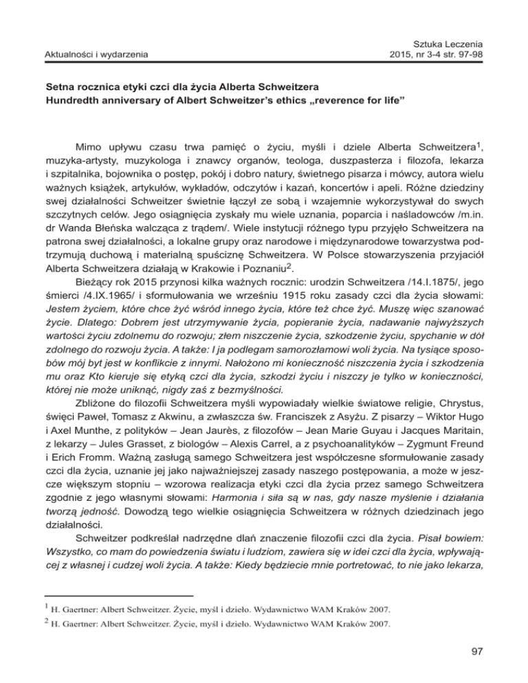 Aktualności i wydarzenia Sztuka Leczenia 2015, nr 3-4 str. 97-98 Setna rocznica etyki czci dla życia Alberta Schweitzera Hundredth anniversary of Albert Schweitzer’s ethics „reverence for life” Mimo upływu czasu trwa pamięć o życiu, myśli i dziele Alberta Schweitzera1, muzyka-artysty, muzykologa i znawcy organów, teologa, duszpasterza i filozofa, lekarza i szpitalnika, bojownika o postęp, pokój i dobro natury, świetnego pisarza i mówcy, autora wielu ważnych książek, artykułów, wykładów, odczytów i kazań, koncertów i apeli. Różne dziedziny swej działalności Schweitzer świetnie łączył ze sobą i wzajemnie wykorzystywał do swych szczytnych celów. Jego osiągnięcia zyskały mu wiele uznania, poparcia i naśladowców /m.in. dr Wanda Błeńska walcząca z trądem/. Wiele instytucji różnego typu przyjęło Schweitzera na patrona swej działalności, a lokalne grupy oraz narodowe i międzynarodowe towarzystwa podtrzymują duchową i materialną spuściznę Schweitzera. W Polsce stowarzyszenia przyjaciół Alberta Schweitzera działają w Krakowie i Poznaniu2. Bieżący rok 2015 przynosi kilka ważnych rocznic: urodzin Schweitzera /14.I.1875/, jego śmierci /4.IX.1965/ i sformułowania we wrześniu 1915 roku zasady czci dla życia słowami: Jestem życiem, które chce żyć wśród innego życia, które też chce żyć. Muszę więc szanować życie. Dlatego: Dobrem jest utrzymywanie życia, popieranie życia, nadawanie najwyższych wartości życiu zdolnemu do rozwoju; złem niszczenie życia, szkodzenie życiu, spychanie w dół zdolnego do rozwoju życia. A także: I ja podlegam samorozłamowi woli życia. Na tysiące sposobów mój byt jest w konflikcie z innymi. Nałożono mi konieczność niszczenia życia i szkodzenia mu oraz Kto kieruje się etyką czci dla życia, szkodzi życiu i niszczy je tylko w konieczności, której nie może uniknąć, nigdy zaś z bezmyślności. Zbliżone do filozofii Schweitzera myśli wypowiadały wielkie światowe religie, Chrystus, święci Paweł, Tomasz z Akwinu, a zwłaszcza św. Franciszek z Asyżu. Z pisarzy – Wiktor Hugo i Axel Munthe, z polityków – Jean Jaurès, z filozofów – Jean Marie Guyau i Jacques Maritain, z lekarzy – Jules Grasset, z biologów – Alexis Carrel, a z psychoanalityków – Zygmunt Freund i Erich Fromm. Ważną zasługą samego Schweitzera jest współczesne sformułowanie zasady czci dla życia, uznanie jej jako najważniejszej zasady naszego postępowania, a może w jeszcze większym stopniu – wzorowa realizacja etyki czci dla życia przez samego Schweitzera zgodnie z jego własnymi słowami: Harmonia i siła są w nas, gdy nasze myślenie i działania tworzą jedność. Dowodzą tego wielkie osiągnięcia Schweitzera w różnych dziedzinach jego działalności. Schweitzer podkreślał nadrzędne dlań znaczenie filozofii czci dla życia. Pisał bowiem: Wszystko, co mam do powiedzenia światu i ludziom, zawiera się w idei czci dla życia, wpływającej z własnej i cudzej woli życia. A także: Kiedy będziecie mnie portretować, to nie jako lekarza, 1 H. Gaertner: Albert Schweitzer. Życie, myśl i dzieło. Wydawnictwo WAM Kraków 2007. 2 H. Gaertner: Albert Schweitzer. Życie, myśl i dzieło. Wydawnictwo WAM Kraków 2007. 97 Aktualności i wydarzenia który pomaga chorym. To moją filozofię czci dla życia uważam za pierwotny wkład dla świata oraz Szpital w Lambarene jest symbolem mego myślenia, jednak trwałym gmachem, taką mam nadzieję, będzie moje dzieło duchowe. Filozofia i etyka Schweitzera, zwłaszcza zasada czci dla życia, mają nadal znaczenie dla nas współczesnych, ponieważ: - nawiązują do najlepszych religijnych, humanistycznych oraz biologicznych i medycznych tradycji poglądów na świat, człowieka i naturę, - mają charakter elementarny i globalny dzięki swej wielokierunkowości i wielopodmiotowości, jak również dzięki ujęciu kosmo-bio-i pancentrycznemu, a nie geo-homo-czy antropocentrycznemu, - odpowiadają obecnej sytuacji świata i człowieka, uwzględniając jej przyszły rozwój zgodnie ze słowami Schweitzera: Etyka czci dla życia powstała w naszym czasie, w nim i jest ukierunkowana na jego potrzeby i wyznania, - stanowią właściwą podstawę i oręż dla idei i praktyki współczesnej ekologii, jako działalności przede wszystkim moralnej. prof. Henryk Gaertner – Kraków 30-048 Kraków Ul. J. Lea 19a/4 98