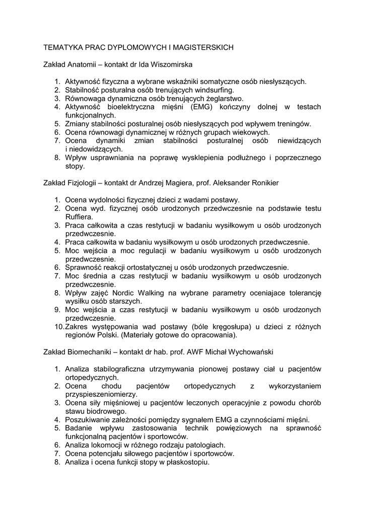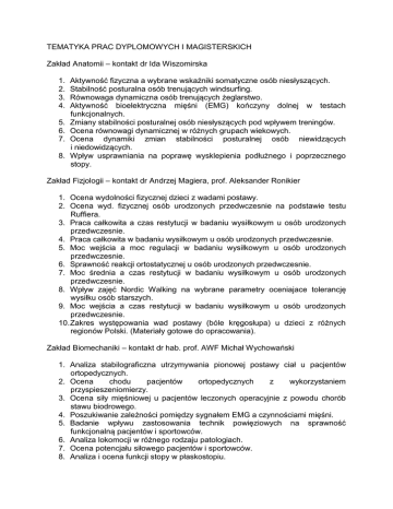 TEMATYKA PRAC DYPLOMOWYCH I MAGISTERSKICH Zakład Anatomii – kontakt dr Ida Wiszomirska 1. 2. 3. 4. 5. 6. 7. 8. Aktywność fizyczna a wybrane wskaźniki somatyczne osób niesłyszących. Stabilność posturalna osób trenujących windsurfing. Równowaga dynamiczna osób trenujących żeglarstwo. Aktywność bioelektryczna mięśni (EMG) kończyny dolnej w testach funkcjonalnych. Zmiany stabilności posturalnej osób niesłyszących pod wpływem treningów. Ocena równowagi dynamicznej w różnych grupach wiekowych. Ocena dynamiki zmian stabilności posturalnej osób niewidzących i niedowidzących. Wpływ usprawniania na poprawę wysklepienia podłużnego i poprzecznego stopy. Zakład Fizjologii – kontakt dr Andrzej Magiera, prof. Aleksander Ronikier 1. Ocena wydolności fizycznej dzieci z wadami postawy. 2. Ocena wyd. fizycznej osób urodzonych przedwczesnie na podstawie testu Ruffiera. 3. Praca całkowita a czas restytucji w badaniu wysiłkowym u osób urodzonych przedwczesnie. 4. Praca całkowita w badaniu wysiłkowym u osób urodzonych przedwczesnie. 5. Moc wejścia a moc regulacji w badaniu wysiłkowym u osób urodzonych przedwczesnie. 6. Sprawność reakcji ortostatycznej u osób urodzonych przedwczesnie. 7. Moc średnia a czas restytucji w badaniu wysiłkowym u osób urodzonych przedwczesnie. 8. Wpływ zajęć Nordic Walking na wybrane parametry oceniajace tolerancję wysiłku osób starszych. 9. Moc wejścia a czas restytucji w badaniu wysiłkowym u osób urodzonych przedwczesnie. 10. Zakres występowania wad postawy (bóle kręgosłupa) u dzieci z różnych regionów Polski. (Materiały gotowe do opracowania). Zakład Biomechaniki – kontakt dr hab. prof. AWF Michał Wychowański 1. Analiza stabilograficzna utrzymywania pionowej postawy ciał u pacjentów ortopedycznych. 2. Ocena chodu pacjentów ortopedycznych z wykorzystaniem przyspieszeniomierzy. 3. Ocena siły mięśniowej u pacjentów leczonych operacyjnie z powodu chorób stawu biodrowego. 4. Poszukiwanie zależności pomiędzy sygnałem EMG a czynnościami mięśni. 5. Badanie wpływu zastosowania technik powięziowych na sprawność funkcjonalną pacjentów i sportowców. 6. Analiza lokomocji w różnego rodzaju patologiach. 7. Ocena potencjału siłowego pacjentów i sportowców. 8. Analiza i ocena funkcji stopy w płaskostopiu.
