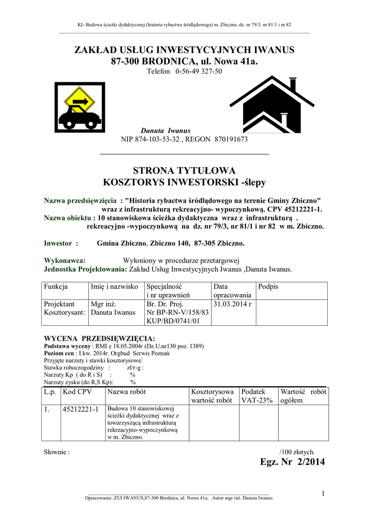 KI- Budowa ścieżki dydaktycznej (historia rybactwa śródlądowego) m. Zbiczno, dz. nr 79/3, nr 81/1 i nr 82 _____________________________________________________________________________________________________ ZAKŁAD USŁUG INWESTYCYJNYCH IWANUS 87-300 BRODNICA, ul. Nowa 41a. Telefon 0-56-49 327-50 Danuta Iwanus NIP 874-103-53-32 , REGON 870191673 __________________________________ STRONA TYTUŁOWA KOSZTORYS INWESTORSKI -ślepy Nazwa przedsięwzięcia : "Historia rybactwa śródlądowego na terenie Gminy Zbiczno" wraz z infrastrukturą rekreacyjno- wypoczynkową. CPV 45212221-1. Nazwa obiektu : 10 stanowiskowa ścieżka dydaktyczna wraz z infrastrukturą . rekreacyjno -wypoczynkową na dz. nr 79/3, nr 81/1 i nr 82 w m. Zbiczno. Inwestor : Gmina Zbiczno, Zbiczno 140, 87-305 Zbiczno. Wykonawca: Wyłoniony w procedurze przetargowej Jednostka Projektowania: Zakład Usług Inwestycyjnych Iwanus ,Danuta Iwanus. Funkcja Imię i nazwisko Projektant Mgr inż. Kosztorysant: Danuta Iwanus Specjalność Data Podpis i nr uprawnień opracowania Br. Dr. Proj. 31.03.2014 r Nr BP-RN-V/158/83 KUP/BD/0741/01 WYCENA PRZEDSIĘWZIĘCIA: Podstawa wyceny : RMI z 18.05.2004r (Dz.U.nr130 poz. 1389) Poziom cen : I kw. 2014r. Orgbud Serwis Poznań Przyjęte narzuty i stawki kosztorysowe: Stawka roboczogodziny : zł/r-g : Narzuty Kp ( do R i S) : % Narzuty zysku (do R,S Kp): % L.p. Kod CPV Nazwa robót 1. Budowa 10 stanowiskowej ścieżki dydaktycznej wraz z towarzyszącą infrastrukturą rekreacyjno-wypoczynkową w m. Zbiczno. 45212221-1 Kosztorysowa wartość robót Podatek VAT-23% Słownie : Wartość robót ogółem /100 złotych. Egz. Nr 2/2014 _________________________________________________________________________ Opracowanie :ZUI IWANUS,87-300 Brodnica, ul. Nowa 41a, .Autor mgr inż. Danuta Iwanus 1 KI- Budowa ścieżki dydaktycznej (historia rybactwa śródlądowego) m. Zbiczno, dz. nr 79/3, nr 81/1 i nr 82 _____________________________________________________________________________________________________ SPIS ZAWARTOŚCI KOSZTORYSU INWESTORSKIEGO Nazwa przedsięwzięcia : "Historia rybactwa śródlądowego na terenie Gminy Zbiczno" wraz z infrastrukturą rekreacyjno- wypoczynkową. CPV 45212221-1. Nazwa obiektu : 10 stanowiskowa ścieżka dydaktyczna wraz z infrastrukturą rekreacyjno -wypoczynkową na dz. nr 79/3, nr 81/1 i nr 82 w m. Zbiczno. L.P 1 2 3 4 5 Spis treści nr karty 1 2 2-8 Strona tytułowa Spis zawartości Charakterystyka robót dla obiektu: Budowa 10 stanowiskowej ścieżki dydaktycznej wraz z towarzyszącą infrastrukturą rekreacyjnowypoczynkową na dz. nr 79/3, nr 81/1i nr 82 w m.Zbiczno. Dane wyjściowe do kosztorysowania 8-9 Kosztorys inwestorski ślepy dla zakresu przedsięwzięcia wraz z księgą 21+21 obmiarów – wg programu Cetus CHARAKTERYSTYKA PROJEKTOWANYCH ROBÓT. Nazwa przedsięwzięcia : "Historia rybactwa śródlądowego na terenie Gminy Zbiczno" wraz z infrastrukturą rekreacyjno- wypoczynkową. Nazwa obiektu : 10 stanowiskowa ścieżka dydaktyczna wraz z infrastrukturą rekreacyjno -wypoczynkową na dz. nr 79/3, nr 81/1 i nr 82 w m. Zbiczno. 1.Podstawa opracowania. Podstawą opracowania projektu budowlanego z projektem zagospodarowania terenu wraz z kosztorysem inwestorskim dla przedsięwzięcia ,przewidzianego do realizacji w Gminie Zbiczno , polegającego na budowie ogólnodostępnej ścieżki dydaktycznej "Historia rybactwa śródlądowego na terenie Gminy Zbiczno -10 stanowiskowa ścieżka wraz z towarzyszącą infrastrukturą rekreacyjno-wypoczynkową na dz. nr 79/3, nr 81/1 i nr 82 w m. Zbiczno obsługującej kompleks Zespołu Szkół w/w miejscowości są: Zlecenie Gminy Zbiczno na opracowanie PB z projektem zagospodarowania i kosztorysu inwestorskiego przedsięwzięcia, dane techniczno funkcjonalne dotyczące wymogów technicznych dla obiektu Rozporządzenie Ministra Infrastruktury z dnia 2 września 2004 r w sprawie szczegółowego zakresu i formy dokumentacji projektowej ,specyfikacji technicznych wykonania i odbioru robót budowlanych oraz programu funkcjonalno-użytkowego (Dz.U. nr 202/2004 ,poz.2072) Rozporządzenie Ministra Infrastruktury z dnia 18.05.2004r w sprawie określenia metod i podstaw sporządzania kosztorysu inwestorskiego, obliczania planowanych kosztów prac projektowych oraz planowanych kosztów robot budowlanych określonych w programie funkcjonalno-użytkowym (Dz. U. nr 130 2004r , poz. 1389), Ustawa z dnia 29.01.2004r Prawo Zamówień publicznych art. 33.1 i art. 33.3 (Dz.U. nr 19 z 2004r., poz. 177) Uzgodnienia technologiczno – wykonawcze ze zleceniodawcą. 2.Zakres i cel opracowania. Opracowanie zawiera projekt budowlany wraz z projektem zagospodarowania terenu obejmującego cz. działek nr 79/3, nr 81/1 i nr 82, dla zakresu budowy 10-stanowiskowej ścieżki dydaktycznej ,z wyeksponowaniem walorów obszaru ,po którym przebiega ,dla celów edukacji przyrodniczo-ekologicznej oraz włączeniem do działalności rekreacyjnowypoczynkowej w połączeniu z już istniejącymi lub budowanymi obiektami rekreacyjno_________________________________________________________________________ Opracowanie :ZUI IWANUS,87-300 Brodnica, ul. Nowa 41a, .Autor mgr inż. Danuta Iwanus 2 KI- Budowa ścieżki dydaktycznej (historia rybactwa śródlądowego) m. Zbiczno, dz. nr 79/3, nr 81/1 i nr 82 _____________________________________________________________________________________________________ sportowymi. Głównym tematem działalności edukacyjnej opartej o ścieżkę jest : "Historia rybactwa śródlądowego na terenie Gminy Zbiczno" 3.Stan istniejący. Działki nr 79/3, 81/1i 82 usytuowane są w centrum wsi Zbiczno , po stronie lewej drogi powiatowej nr odcinek - Brodnica – Ciche. Są własnością Gminy Zbiczno oraz Szkoły Podstawowej i Gimnazjum w Zbicznie. Działka nr 79/3 zabudowana kompleksem szkolnym z usytuowanym wzdłuż drogi powiatowej budynkiem „starej części szkoły – w którym mieści się Szkoła Podstawowa wraz z salą gimn
