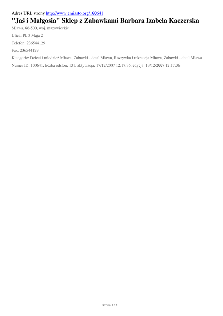 Sklep z Zabawkami Barbara Izabela Kaczerska, Mlawa, Pl. 3 Maja 2