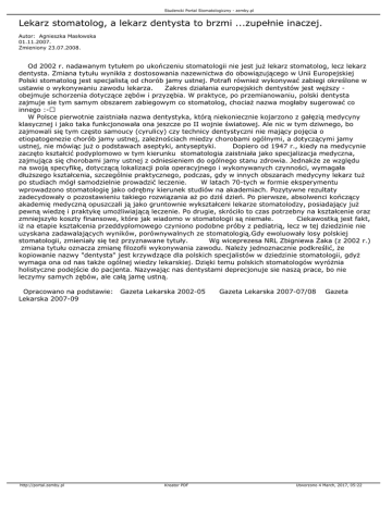 Studencki Portal Stomatologiczny - zemby.pl Lekarz stomatolog, a lekarz dentysta to brzmi ...zupełnie inaczej. Autor: Agnieszka Masłowska 01.11.2007. Zmieniony 23.07.2008. Od 2002 r. nadawanym tytułem po ukończeniu stomatologii nie jest już lekarz stomatolog, lecz lekarz dentysta. Zmiana tytułu wynikła z dostosowania nazewnictwa do obowiązującego w Unii Europejskiej Polski stomatolog jest specjalistą od chorób jamy ustnej. Potrafi również wykonywać zabiegi określone w ustawie o wykonywaniu zawodu lekarza. Zakres działania europejskich dentystów jest węższy obejmuje schorzenia dotyczące zębów i przyzębia. W praktyce, po przemianowaniu, polski dentysta zajmuje sie tym samym obszarem zabiegowym co stomatolog, chociaż nazwa mogłaby sugerować co innego :- W Polsce pierwotnie zaistniała nazwa dentystyka, którą niekoniecznie kojarzono z gałęzią medycyny klasycznej i jako taka funkcjonowała ona jeszcze po II wojnie światowej. Ale nic w tym dziwnego, bo zajmowali się tym często samoucy (cyrulicy) czy technicy dentystyczni nie mający pojęcia o etiopatogenezie chorób jamy ustnej, zależnościach miedzy chorobami ogólnymi, a dotyczącymi jamy ustnej, nie mówiąc już o podstawach aseptyki, antyseptyki. Dopiero od 1947 r., kiedy na medycynie zaczęto kształcić podyplomowo w tym kierunku stomatologia zaistniała jako specjalizacja medyczna, zajmująca się chorobami jamy ustnej z odniesieniem do ogólnego stanu zdrowia. Jednakże ze względu na swoją specyfikę, dotyczącą lokalizacji pola operacyjnego i wykonywanych czynności, wymagała dłuższego kształcenia, szczególnie praktycznego, podczas, gdy w innych obszarach medycyny lekarz tuż po studiach mógł samodzielnie prowadzić leczenie. W latach 70-tych w formie eksperymentu wprowadzono stomatologię jako odrębny kierunek studiów na akademiach. Pozytywne rezultaty zadecydowały o pozostawieniu takiego rozwiązania aż po dziś dzień. Po pierwsze, absolwenci kończący akademię medyczną opuszczali ją jako gruntownie wykształceni lekarze stomatolodzy, posiadający już pewną wiedzę i praktykę umożliwiającą leczenie. Po drugie, skróciło to czas potrzebny na kształcenie oraz zmniejszyło koszty finansowe, które jak wiadomo w stomatologii są niemałe. Ciekawostką jest fakt, iż na etapie kształcenia przeddyplomowego czyniono podobne próby z pediatrią, lecz w tej dziedzinie nie uzyskana zadawalających wyników, porównywalnych ze stomatologią.Gdy ewoluowały losy polskiej stomatologii, zmieniały się też przyznawane tytuły. Wg wiceprezesa NRL Zbigniewa Żaka (z 2002 r.) zmiana tytułu oznacza zmianę filozofii wykonywania zawodu. Należy jednoznacznie podkreślić, że kopiowanie nazwy "dentysta" jest krzywdzące dla polskich specjalistów w dziedzinie stomatologii, gdyż wymaga ona od nas także ogólnej wiedzy lekarskiej. Dzięki temu polskich stomatologów wyróżnia holistyczne podejście do pacjenta. Nazywając nas dentystami deprecjonuje sie naszą prace, bo nie leczymy samych zębów, ale całą jamę ustną. Opracowano na podstawie: Lekarska 2007-09 http://portal.zemby.pl Gazeta Lekarska 2002-05 Kreator PDF Gazeta Lekarska 2007-07/08 Gazeta Utworzono 4 March, 2017, 05:22