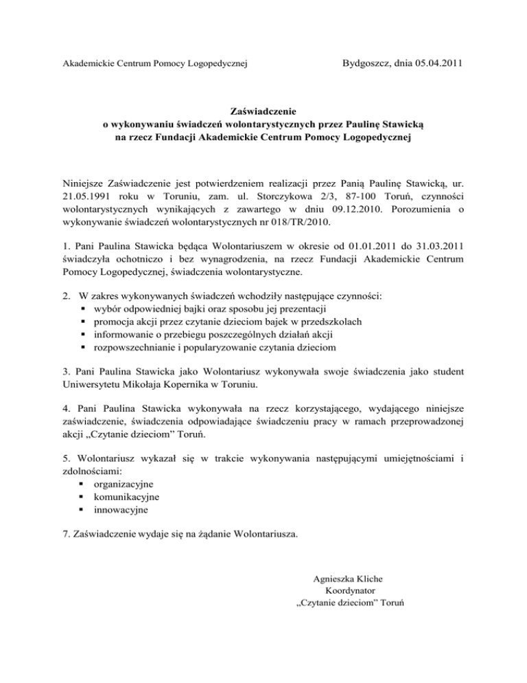 Bydgoszcz, dnia 05.04.2011 Akademickie Centrum Pomocy Logopedycznej Zaświadczenie o wykonywaniu świadczeń wolontarystycznych przez Paulinę Stawicką na rzecz Fundacji Akademickie Centrum Pomocy Logopedycznej Niniejsze Zaświadczenie jest potwierdzeniem realizacji przez Panią Paulinę Stawicką, ur. 21.05.1991 roku w Toruniu, zam. ul. Storczykowa 2/3, 87-100 Toruń, czynności wolontarystycznych wynikających z zawartego w dniu 09.12.2010. Porozumienia o wykonywanie świadczeń wolontarystycznych nr 018/TR/2010. 1. Pani Paulina Stawicka będąca Wolontariuszem w okresie od 01.01.2011 do 31.03.2011 świadczyła ochotniczo i bez wynagrodzenia, na rzecz Fundacji Akademickie Centrum Pomocy Logopedycznej, świadczenia wolontarystyczne. 2. W zakres wykonywanych świadczeń wchodziły następujące czynności: wybór odpowiedniej bajki oraz sposobu jej prezentacji promocja akcji przez czytanie dzieciom bajek w przedszkolach informowanie o przebiegu poszczególnych działań akcji rozpowszechnianie i popularyzowanie czytania dzieciom 3. Pani Paulina Stawicka jako Wolontariusz wykonywała swoje świadczenia jako student Uniwersytetu Mikołaja Kopernika w Toruniu. 4. Pani Paulina Stawicka wykonywała na rzecz korzystającego, wydającego niniejsze zaświadczenie, świadczenia odpowiadające świadczeniu pracy w ramach przeprowadzonej akcji „Czytanie dzieciom” Toruń. 5. Wolontariusz wykazał się w trakcie wykonywania następującymi umiejętnościami i zdolnościami: organizacyjne komunikacyjne innowacyjne 7. Zaświadczenie wydaje się na żądanie Wolontariusza. Agnieszka Kliche Koordynator „Czytanie dzieciom” Toruń