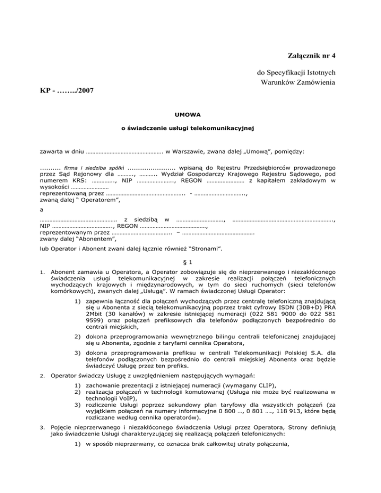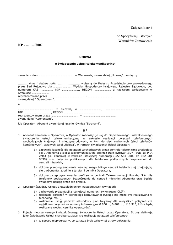 Załącznik nr 4 do Specyfikacji Istotnych Warunków Zamówienia KP - ……../2007 UMOWA o świadczenie usługi telekomunikacyjnej zawarta w dniu …………………………………………. w Warszawie, zwana dalej „Umową”, pomiędzy: .......... firma i siedziba spółki ....................... wpisaną do Rejestru Przedsiębiorców prowadzonego przez Sąd Rejonowy dla ………., ……….. Wydział Gospodarczy Krajowego Rejestru Sądowego, pod numerem KRS: ………….., NIP ………………….., REGON …………………… z kapitałem zakładowym w wysokości …………………… reprezentowaną przez ………………………………………….. - ………………………….., zwaną dalej “ Operatorem”, a …………………………………………. z siedzibą w …………………………, ………………………………………………………., NIP ……………………………….., REGON ……………………………………, reprezentowanym przez ……………………………….. – ………………………………………. zwany dalej “Abonentem”, lub Operator i Abonent zwani dalej łącznie również “Stronami”. §1 1. Abonent zamawia u Operatora, a Operator zobowiązuje się do nieprzerwanego i niezakłóconego świadczenia usługi telekomunikacyjnej w zakresie realizacji połączeń telefonicznych wychodzących krajowych i międzynarodowych, w tym do sieci ruchomych (sieci telefonów komórkowych), zwanych dalej „Usługą”. W ramach świadczonej Usługi Operator: 1) zapewnia łączność dla połączeń wychodzących przez centralę telefoniczną znajdującą się u Abonenta z siecią telekomunikacyjną poprzez trakt cyfrowy ISDN (30B+D) PRA 2Mbit (30 kanałów) w zakresie istniejącej numeracji (022 581 9000 do 022 581 9599) oraz połączeń prefiksowych dla telefonów podłączonych bezpośrednio do centrali miejskich, 2) dokona przeprogramowania wewnętrznego bilingu centrali telefonicznej znajdującej się u Abonenta, zgodnie z taryfami cennika Operatora, 3) dokona przeprogramowania prefiksu w centrali Telekomunikacji Polskiej S.A. dla telefonów podłączonych bezpośrednio do centrali miejskiej Abonenta oraz będzie świadczyć Usługę przez ten prefiks. 2. Operator świadczy Usługę z uwzględnieniem następujących wymagań: 1) zachowanie prezentacji z istniejącej numeracji (wymagany CLIP), 2) realizacja połączeń w technologii komutowanej (Usługa nie może być realizowana w technologii VoIP), 3) rozliczenie Usługi poprzez sekundowy plan taryfowy dla wszystkich połączeń (za wyjątkiem połączeń na numery informacyjne 0 800 …, 0 801 …., 118 913, które będą rozliczane według cennika operatorów). 3. Pojęcie nieprzerwanego i niezakłóconego świadczenia Usługi przez Operatora, Strony definiują jako świadczenie Usługi charakteryzującej się realizacją połączeń telefonicznych: 1) w sposób nieprzerwany, co oznacza brak całkowitej utraty połączenia, 2) w sposób niezakłócony, co oznacza realizację połączeń bez zakłóceń w postaci innych rozmów w tle, dźwięków technicznych w postaci szumów, trzasków i innych tego rodzaju zakłóceń, 3) w sposób szybki, co oznacza uzyskiwanie połączeń bez konieczności nadmiernego oczekiwania na połączenie, 4) w sposób łatwy – bez konieczności wybierania dodatkowych numerów lub funkcji technicznych w celu zrealizowania połączenia (poza wybieraniem numerów przewidzianych w Planie Numeracji Krajowej), 5) o dobrej jakości dźwięku – polegającej na nieutrudnionym rozpoznaniu naturalnego i niezniekształconego głosu rozmówcy. §2 Operator oświadcza, że prowadzi działalność telekomunikacyjną na podstawie wpisu do rejestru przedsiębiorców telekomunikacyjnych prowadzonego przez Prezesa Urzędu Komunikacji Elektronicznej, na potwierdzenie czego przedkłada zaświadczenie o wpisie do wymienionego rejestru. Zaświadczenie stanowi załącznik nr 1 do Umowy. §3 Umowa zawarta jest na czas określony i obowiązuje od dnia podpisania do dnia 31 grudnia 2007 r. Odbiór przedmiotu zamówienia nastąpi nie później niż dwa tygodnie od dnia podpisania umowy. i zostanie potwierdzony protokołem odbiorczym. §4 Na podstawie niniejszej Umowy, Operator będzie świadczył Usługi dla Abonenta w Warszawie przy ul. Elektoralna 2. §5 1. Operator oświadcza, iż połączenie centrali telefonicznej Abonenta z centralą nadrzędną w sieci Operatora będzie realizowane poprzez łącze kablowe lub drogą radiową. Operator oświadcza, iż posiada stosowne zezwolenie na budowę i użytkowanie wyżej wymienionych łączy. 2. Operator zainstaluje urządzenia uzgodnionym z Abonentem. umożliwiające realizację Usługi w miejscu uprzednio §6 1. Rozliczenia za połączenia będą odbywały się zgodnie z cennikiem usług Operatora (załącznik nr 2). W okresie obowiązywania niniejszej Umowy Operator nie może dokonać zmiany cennika skutkującej podwyższeniem opłat. 2. Miesięczne rozliczenia pomiędzy Stronami będą dokonywane w taryfikacji sekundowej (sekundowy plan taryfowy) dla połączeń telefonicznych (krajowych i międzynarodowych, w tym do sieci ruchomych). Połączenia na numery informacyjne 0 800 …, 0 801 …., 118 913 będą rozliczane według cennika operatorów. §7 1. Z tytułu świadczenia Usługi, Operator będzie wystawiał Abonentowi faktury VAT, wraz z bilingiem i szczegółowym rozliczeniem planu taryfowego. Operator przekaże Abonentowi bilingi i szczegółowe rozliczenie planu taryfowego bez dodatkowych opłat. 2. Abonent upoważnia Operatora do wystawiania faktur VAT bez podpisu Abonenta. 3. Za okres rozliczeniowy przyjmuje się okres miesiąca kalendarzowego. §8 Należności za usługę Operatora są płatne z dołu. Abonent będzie uiszczał opłaty w miesiącu następującym po miesiącu, w którym Operator świadczył Usługę na podstawie niniejszej Umowy, w terminie 14 