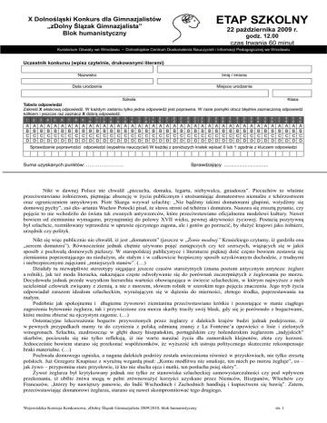 ETAP SZKOLNY X Dolnośląski Konkurs dla Gimnazjalistów „zDolny Ślązak Gimnazjalista” Blok humanistyczny 22 października 2009 r. godz. 12.00 czas trwania 60 minut Kuratorium Oświaty we Wrocławiu • Dolnośląskie Centrum Doskonalenia Nauczycieli i Informacji Pedagogicznej we Wrocławiu Uczestnik konkursu (wpisz czytelnie, drukowanymi literami) Nazwisko Imię / imiona Data urodzenia Miejsce urodzenia Szkoła Klasa Tabela odpowiedzi Zakreśl X właściwą odpowiedź. W kaŜdym zadaniu tylko jedna odpowiedź jest poprawna. W razie pomyłki otocz błędnie zaznaczoną odpowiedź kółkiem i jeszcze raz zaznacz X dobrą odpowiedź. 1 2 3 4 5 6 7 8 9 1 0 1 1 1 2 1 3 1 4 1 5 1 6 1 7 1 8 1 9 2 0 2 1 2 2 2 3 2 4 2 5 2 6 2 7 2 8 2 9 3 0 3 1 3 2 3 3 3 4 3 5 3 6 3 7 3 8 3 9 4 0 A B C D A B C D A B C D A B C D A B C D A B C D A B C D A B C D A B C D A B C D A B C D A B C D A B C D A B C D A B C D A B C D A B C D A B C D A B C D A B C D A B C D A B C D A B C D A B C D A B C D A B C D A B C D A B C D A B C D A B C D A B C D A B C D A B C D A B C D A B C D A B C D A B C D A B C D A B C D A B C D Sprawdzenie poprawności odpowiedzi (wypełnia nauczyciel) W kaŜdej z poniŜszych kratek wpisać 0 lub 1 zgodnie z kluczem odpowiedzi Suma uzyskanych punktów: ………………….. Sprawdzający ................................ Nikt w dawnej Polsce nie chwalił „piecucha, domaka, legarta, niebywalca, gniadosza”. Piecuchów to właśnie przeciwstawiano Ŝołnierzom, piętnując absencję w Ŝyciu publicznym i utoŜsamiając domatorstwo niemalŜe z tchórzostwem oraz ograniczeniem umysłowym. Piotr Skarga wzywał szlachtę: „Nie bądźmy takimi domatorami głupimi, wstydźmy się domowej pychy”, zaś eks–arianin Wacław Potocki pisał, Ŝe sława stroni od tchórza i domatora. Nasuwa się zresztą pytanie, czy pojęcie to nie wchodziło do świata tak zwanych antywzorców, które przeciwstawiano oficjalnemu modelowi kultury. Nawet bowiem od ziemianina wymagano, przynajmniej do polowy XVII wieku, pewnej aktywności Ŝyciowej. Postacią pozytywną był szlachcic, rozmiłowany wprawdzie w uprawie ojczystego zagona, ale i gotów go porzucić, by słuŜyć krajowi jako Ŝołnierz, urzędnik czy polityk. Nikt się więc publicznie nie chwalił, iŜ jest „domatorem” (jeszcze w „śonie modnej” Krasickiego czytamy, iŜ gardziła ona „sercem domatora”). Równocześnie jednak chętnie uŜywano pojęć zastępczych czy teŜ szerszych, wiąŜących się w jakiś sposób z pochwałą domowych pieleszy. W staropolskiej publicystyce i literaturze pięknej dość często bowiem zestawia się ziemianina poprzestającego na nieduŜym, ale stałym i w całkowicie bezpieczny sposób uzyskiwanym dochodzie, z trudnymi i niebezpiecznymi zajęciami „mniejszych stanów”. (…) Działały tu niewątpliwie stereotypy sięgające jeszcze czasów staroŜytnych (znana poetom antycznym antyteza: Ŝeglarz a rolnik), jak teŜ moda literacka, nakazująca częste odwoływanie się do porównań zaczerpniętych z Ŝeglowania po morzu. Decydowała jednak przede wszystkim hierarchia wartości obowiązująca w świecie szlacheckim, w którym najwyŜsze z nich ucieleśniał człowiek związany z ziemią, a nie z morzem, słowem rolnik w szerokim tego pojęcia znaczeniu. Jego tryb Ŝycia odpowiadał zarazem ideałom szlacheckim, wyraŜającym się w dąŜeniu do mierności, złotego środka, poprzestawania na małym. Podobnie jak spokojnemu i długiemu Ŝywotowi ziemianina przeciwstawiano krótkie i pozostające w stanie ciągłego zagroŜenia bytowanie Ŝeglarza, tak i przywiezione zza morza skarby traciły swój blask, gdy się je porównało z bogactwami, które moŜna zbierać na ojczystym zagonie. (…) Ostentacyjne lekcewaŜenie bogactw przywoŜonych przez Ŝeglarzy z dalekich krajów budzi jednak podejrzenie, iŜ w pewnych przypadkach mamy tu do czynienia z polską odmianą znanej z La Fonteine’a opowieści o lisie i zielonych winogronach. Szlachta, zazdroszcząc w głębi duszy hiszpańskim, portugalskim czy holenderskim Ŝeglarzom „indyjskich” skarbów, pocieszała się nie tylko refleksją, iŜ nie warto naraŜać Ŝycia dla zamorskich klejnotów, złota czy korzeni. Jednocześnie bowiem starano się przekonać współziomków, Ŝe wyŜszość ich ustroju politycznego skutecznie rekompensuje braki materialne. (…) Pochwała domowego ogniska, a nagana dalekich podróŜy została uwieczniona równieŜ w przysłowiach, nie tylko zresztą polskich. JuŜ Grzegorz Knapiusz z wyraźną wzgardą pisał: „Komu modlitwa nie smakuje, ten niech po morzu Ŝegluje”, co – jak Ŝywo – przypomina stare przysłowie, iŜ kto nie słucha ojca i matki, ten posłucha psiej skóry”. śywot Ŝeglarza był krytykowany jednak nie tylko ze stanowiska szlacheckiej samowystarczalności czy pod wpływem przekonania, iŜ obfite Ŝniwa mogą w pełni zrównowaŜyć korzyści uzyskane przez Niemców, Hiszpanów, Włochów czy Francuzów, „którzy by nawiętszy panowie, do Indii Wschodnich i Zachodnich handlują i kupiectwem się bawią”. Zatem, przeciwstawiając domatorowi Ŝeglarza, starano się nawet skompromitować tego drugiego. Wojewódzka Komisja Konkursowa, zDolny Ślązak Gimnazjalista 2009/2010, blok humanistyczny str. 1 ETAP SZKOLNY, BLOK HUMANISTYCZNY 28 października 2009 r., czas trwania 60 minut Pod tym względem występowała jednak pewna rozbieŜność opinii. Literatura naukowa i przedstawiciele duchowieństwa katolickiego wielokrotnie podkreślali, iŜ takim Ŝeglarzem jak Kolumb kierowało pragnienie krzewienia „prawdziwej wiary” za oceanem oraz chęć poszerzenia odziedziczonego po staroŜytnych świata, w którym ludziom zaczynało być za ciasno. Pochwały te częściej jednak były kwestionowane, niŜ spotykały się z aprobatą. Tak więc równieŜ i niektórzy katolicy za główną siłę napędową dalekich wypraw Ŝeglarskich uwaŜali nie chęć nawracania pogan czy ciekawość poznawcz