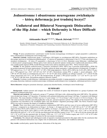 O r t o p e d i a Traumatologia Rehabilitacja © MEDSPORTPRESS, 2011; 2(6); Vol. 13, xx-xx ARTYKUŁ ORYGINALNY / ORIGINAL ARTICLE Jednostronne i obustronne neurogenne zwichnięcie – którą deformację jest trudniej leczyć? Unilateral and Bilateral neurogenic Dislocation of the Hip Joint – which Deformity is More Difficult to Treat? Aleksander Koch(A,B,C,D,E,F), Marek Jóźwiak(A,B,C,D,E,F) Katedra i Klinika Ortopedii i Traumatologii Dziecięcej, Uniwersytet Medyczny im. K. Marcinkowskiego, Poznań Department of Paediatric Orthopaedics and Traumatology, Kazimierz Marcinkowski Medical University, Poznań STRESZCZEnIE Wstęp. W pracy przedstawiono i porównano wyniki leczenia neurogennego zwichnięcia w grupie pacjentów z jednostronnym i obustronnym zwichnięciem stawu biodrowego. Materiał i metody. Analizowano grupę 77 pacjentów (109 bioder) ze zwichnięciem (MP>80%). Pacjentów podzielono na dwie grupy: pierwsza ze zwichnięciem jednostronnym – 47 stawów (47 pacjentów) z obserwacją 2,5 lat (1,2-7,5 lat), oraz druga z obustronnym zwichnięciem – 62 stawy (31 pacjentów) z obserwacją 3,4 lat (1,2-10,2). Dokonano oceny klinicznej i radiologicznej w okresie przed i pooperacyjnym. Relacje głowy kości udowej do panewki opisane zostały przez współczynnik panewkowy (WP), oraz współczynnik migracji (WM), kształt bliższego końca kości udowej określono przez PFA – Pelvic Femoral Angle. Wyniki. W obu grupach zaobserwowano 3 ponowne zwichnięcia (WM >80%) oraz 4 poważne podwichnięcia (WM>50) po przeprowadzonym leczeniu operacyjnym. Wszystkie należą do grupy pacjentów z jednostronnym zwichnięciem. W grupie 1. WP poprawił się z 31,3° (20°-50°) do 22,7° (3°-50°). WM uległ poprawie z 98,8% (85%-100%) do 23,4% (0%-100%). W grupie 2. WP poprawił się z 30,5° (10°-62°) do 19,9° (4°-40°). Stwierdzono zmianę PFA: w grupie 1. przed zabiegiem –10,3° (-40° do 10°) dla strony ze zwichnięciem oraz 6,6° (–16° do 55°) dla strony stabilnej, po zabiegu wyniosło –5,7° (–46 do 45) dla strony operowanej oraz 5,6° (–18° do 45°) dla nieoperowanej. W grupie 2. PFA przed wyniosła –3,1° (-22° do 9°) i po -0,15° (–18° do 25°) dla obu stron. Stwierdzono poprawę zakresów ruchów. Wniosek. Uzyskane wyniki kliniczne i radiologiczne pozwalają stwierdzić, iż grupa pacjentów ze zwichnięciem jednostronnym jest grupą obarczoną większym ryzykiem ponownego zwichnięcia, podwichnięcia oraz wystąpienia „deformacji powiewu wiatru”. Słowa kluczowe: mózgowe porażenie dziecięce, spastyczna choroba biodra, zwichnięcie stawu biodrowego SUMMARY Background. Authors present and compare the results of treatment of spastic hip dislocation in a group of patients with unilateral or bilateral dislocation. Material and methods. We analyzed a group of 77 patients (109 hips) with a dislocated hip joint (MP>80%). The patients were divided into Group 1 (47 hip joints, 47 patients) with unilateral dislocation and Group 2 (62 hips, 31 patients) with bilateral dislocation. The mean duration of follow-up was 2.5 years (range 1.2-7.5) in Group 1 and 3.4 years (1.2-10.2) in Group 2. The hips were evaluated clinically and radiographically in the pre- and post-operative period. The relation of the femoral head to the acetabulum was described as the Acetabular Index (AI) and Reimers’ migration percentage (MP). The Pelvic Femoral Angle (PFA) was used to measure the degree of windblown deformity. Results. There were three cases of post-operative redislocation (MP>80%) and four cases of severe subluxation (MP>50%) in Group 1 compared to no dislocations in Group 2. In Group 1, AI improved from 31.3° (20°-50°) to 22.7° (3°-50°) and MP improved from 98.8% (85%-100%) to 23.4% (0%-100%). In Group 2, AI improved from 30.5° (10°-62°) to 19.9° (4°-40°) and MP improved from 98.8% (82%-100%) to 9.6% (0%-60%). In Group 1, PFA before surgery was –10.3° (–40° to 10°) for the dislocated side and 6.6° (–16° to 55°) for the non-dislocated side and after surgery it was –5.7° (–46 to 45) for the treated side and 5.6° (–18° to 45°) for the untreated side. In Group 2, PFA was –3.1° (–22° to 9°) before surgery and –0.15° (–18° to 25°) after surgery. We found improved ranges of motion for the movements investigated. Conclusion. The clinical and radiological results of operative treatment presented in this paper allow for the conclusion that patients with unilateral dislocations run a higher risk of redislocation, subluxation, and windblown deformity. Key words: cerebral palsy, spastic hip disease, dislocation of the hip joint. Koch A. i wsp., Jednostronne i obustronne neurogenne zwichnięcie stawów biodrowych WSTĘP BACKGROUnD Neurogenne zwichnięcie stawu biodrowego (NZSB) w przebiegu mózgowego porażenia dziecięcego (MPD) jest jednym z najcięższych następstw porażenia spastycznego mięśni okolicy stawów biodrowych. Przewaga grup mięśniowych: przywodzicieli, zginaczy oraz rotatorów wewnętrznych nad ich antagonistami prowadzi do zaburzenia rozkładu sił w okolicy stawu biodrowego. Całość patologicznych procesów okolicy stawu biodrowego u chorych z mózgowym porażeniem dziecięcym, niezależnie od ich zaawansowania, została określona przez F. Millera jako spastyczna choroba biodra. Słomczykowski i wsp. udowodnili, że w zdrowym stawie biodrowym wypadkowa działających sił przypada na przyśrodkowo-górną powierzchnię panewki, natomiast w biodrze spastycznym siły wywierają największy nacisk na tylno-górno-boczną część panewki [1,2]. Wielkości sił działających w spastycznym stawie biodrowym trzykrotnie przewyższają siły oddziaływujące w zdrowym stawie. Jednocześnie należy pamiętać, że przy próbie ustawienia kończyn dolnych ze spastycznym porażeniem w tzw. „normalnym” fizjologicznym ustawieniu wielkości sił działających zwiększają się sześciokrotnie. Dalszymi konsekwencjami zabu