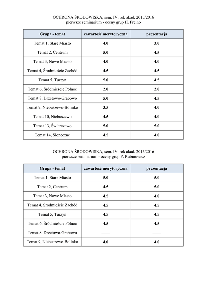OCHRONA ŚRODOWISKA, sem. IV, rok akad. 2015/2016 pierwsze seminarium - oceny grup H. Freino Grupa - temat zawartość merytoryczna prezentacja Temat 1, Stare Miasto 4.0 3.0 Temat 2, Centrum 5.0 4.5 Temat 3, Nowe Miasto 4.0 4.0 Temat 4, Śródmieście Zachód 4.5 4.5 Temat 5, Turzyn 5.0 4.5 Temat 6, Śródmieście Północ 2.0 2.0 Temat 8, Drzetowo-Grabowo 5.0 4.5 Temat 9, Niebuszewo-Bolinko 3.5 4.0 Temat 10, Niebuszewo 4.5 4.0 Temat 13, Świerczewo 5.0 5.0 Temat 14, Słoneczne 4.5 4.0 OCHRONA ŚRODOWISKA, sem. IV, rok akad. 2015/2016 pierwsze seminarium - oceny grup P. Rubinowicz Grupa - temat zawartość merytoryczna prezentacja Temat 1, Stare Miasto 5.0 5.0 Temat 2, Centrum 4.5 5.0 Temat 3, Nowe Miasto 4.5 4.0 Temat 4, Śródmieście Zachód 4.5 4.5 Temat 5, Turzyn 4.5 4.5 Temat 6, Śródmieście Północ 4.5 4.5 Temat 8, Drzetowo-Grabowo –––– –––– Temat 9, Niebuszewo-Bolinko 4,0 4,0
