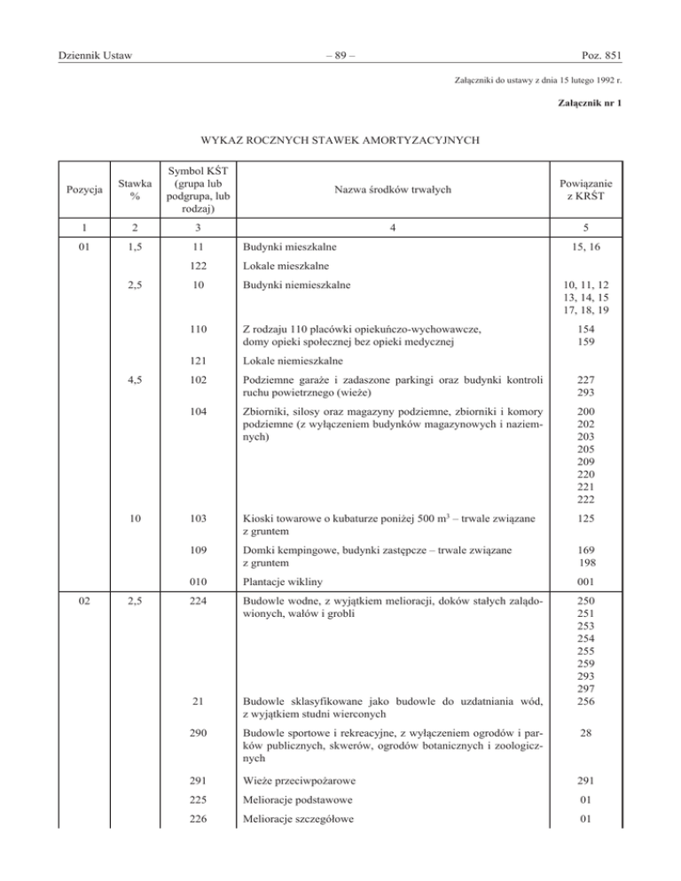 Dziennik Ustaw – 89 – Poz. 851 Załączniki do ustawy z dnia 15 lutego 1992 r. Załącznik nr 1 WYKAZ ROCZNYCH STAWEK AMORTYZACYJNYCH Pozycja Stawka % Symbol KŚT (grupa lub podgrupa, lub rodzaj) Nazwa środków trwałych Powiązanie z KRŚT 1 2 3 4 5 01 1,5 11 Budynki mieszkalne 122 Lokale mieszkalne 10 Budynki niemieszkalne 110 Z rodzaju 110 placówki opiekuńczo-wychowawcze, domy opieki społecznej bez opieki medycznej 121 Lokale niemieszkalne 102 Podziemne garaże i zadaszone parkingi oraz budynki kontroli ruchu powietrznego (wieże) 227 293 104 Zbiorniki, silosy oraz magazyny podziemne, zbiorniki i komory podziemne (z wyłączeniem budynków magazynowych i naziemnych) 200 202 203 205 209 220 221 222 103 Kioski towarowe o kubaturze poniżej 500 m3 – trwale związane z gruntem 125 109 Domki kempingowe, budynki zastępcze – trwale związane z gruntem 169 198 010 Plantacje wikliny 001 224 Budowle wodne, z wyjątkiem melioracji, doków stałych zalądowionych, wałów i grobli 21 Budowle sklasyfikowane jako budowle do uzdatniania wód, z wyjątkiem studni wierconych 250 251 253 254 255 259 293 297 256 290 Budowle sportowe i rekreacyjne, z wyłączeniem ogrodów i parków publicznych, skwerów, ogrodów botanicznych i zoologicznych 28 291 Wieże przeciwpożarowe 291 225 Melioracje podstawowe 01 226 Melioracje szczegółowe 01 2,5 4,5 10 02 2,5 15, 16 10, 11, 12 13, 14, 15 17, 18, 19 154 159 Dziennik Ustaw 1 03 04 – 90 – Poz. 851 2 3 4 5 4,5 2 Obiekty inżynierii lądowej i wodnej, z wyłączeniem ogrodów i parków publicznych, skwerów, ogrodów botanicznych i zoologicznych 2 10 211 Przewody sieci technologicznych wewnątrzzakładowych 651 221 Urządzenia zabezpieczające ruch pociągów 680 14 202 Z rodzaju 202 wieże ekstrakcyjne 507 20 200 Z rodzaju 200 wieże wiertnicze, wieżomaszty 510 7 3 14 323 Silniki spalinowe na paliwo lekkie 323 324 Silniki spalinowe na paliwo ciężkie 324 325 Silniki spalinowe na paliwo gazowe 325 326 Silniki powietrzne 326 343 Z rodzaju 343 zespoły elektroenergetyczne przenośne z silnikami spalinowymi na paliwo lekkie 343 344 Zespoły elektroenergetyczne z silnikami spalinowymi na paliwo ciężkie 344 349 Reaktory jądrowe 349 431 431-0 filtry (prasy) błotniarki 431-4 cedzidła mechaniczne 431 450 Piece do przerobu surowców (z wyjątkiem 450-50 piece do przerobu surowca wielokomorowe) 450 451 Piece do przetwarzania paliw (z wyjątkiem 451-0 piece koksownicze) 451 454 Piece do wypalania tunelowe 454 475 Aparaty bębnowe 475 477 Suszarki komorowe: 477-0 do 4 oraz 477-6 do 8 477 7 Kotły i maszyny energetyczne 3 10 4 Maszyny, urządzenia i aparaty ogólnego zastosowania 14 41 Obrabiarki do metali 44 Maszyny i urządzenia do przetłaczania i sprężania cieczy i gazów 44 46 Aparaty do wymiany ciepła (z wyjątkiem rodzaju 465 i 469-0) 46 47 Maszyny, urządzenia i aparaty do operacji i procesów materiałowych (z wyjątkiem rodzaju 474, 475, 477-0 do 4 i 6-8 oraz 479-0) 47 449 Z rodzaju 449-90 urządzenia dystrybucyjne do benzyny i olejów elektryczne i przepływomierze składowe do cieczy i paliw płynnych 449 465 Z rodzaju 465 wymienniki płynów obiegowych przy produkcji sody 465 469 469-0 chłodnice odmulin i prób kołowych rozkładni gazu 469 474 Kolumny nitracyjne i denitracyjne 474 479 479-0 odbieralnice hydrauliczne rozkładni gazu 479 481 Aparaty i urządzenia do powierzchniowej obróbki metali sposobem chemicznym i elektrogalwanicznym 481 18 4 40, 41 Dziennik Ustaw 1 2 Poz. 851 3 4 5 482 Aparaty i urządzenia do powierzchniowej obróbki metali sposobem cieplnym 482 484 484-0 urządzenia do spawania i napawania łukowego w ochronie gazów oraz do spawania i napawania plazmowego Z rodzaju 484-1 wytwornice acetylenowe przenośne wysokiego ciśnienia, 484-3 zgrzewarki oporowe i tarcicowe Z rodzaju 484-6 urządzenia do metalizacji natryskowej i do natryskiwania tworzywami sztucznymi 484 490 Maszyny i urządzenia do przygotowywania maszynowych nośników danych oraz maszyny analityczne 490 492 Samodzielne urządzenia do automatycznej regulacji i sterowania procesami 492 493 Z rodzaju 493 roboty przemysłowe 493 434 434-01 maszyny do zamykania słoi Z rodzaju 434-02 maszyny do zamykania puszek 434 465 Wymienniki przeponowe rurowe sklasyfikowane jako chłodnice kwasu siarkowego 465 30 491 Zespoły komputerowe 491 7 506 506-1 i 506-2 aparaty do rektyfikacji powietrza 506 507 507-2 i 507-3 krystalizatory 507-4 komory potne 507 548 548-0 maszyny, urządzenia i aparaty do produkcji materiału zecerskiego 548 583 583-0 koparki i zwałowarki w kopalniach odkrywkowych węgla 583-1 koparki w piaskowniach przemysłu węglowego 583 512 Maszyny i urządzenia do eksploatacji otworów wiertniczych 512 513 Maszyny i urządzenia do przeróbki mechanicznej rud i węgla 513 514 514-0 maszyny i urządzenia aglomerowni 514-1 maszyny i urządzenia wielkopiecowe 514-2 maszyny i urządzenia hutnicze stalowni Z rodzaju 514-3 do 6 nożyce hutnicze do cięcia na gorąco, tabor hutniczy, walcowniczy 514-9 inne maszyny, urządzenia i aparaty hutnicze 514 520 Z rodzaju 520 maszyny i urządzenia przemysłu kamieniarskiego: 520-0 i 520-1 traki ramowe i tarczowe 520-2 cyrkulaki 520-3 szlifierki 520-4 tokarki i wiertarki do kamienia 520-5 kombajny do robót przygotowawczych 520 523 Maszyny i urządzenia przemysłu cementowego 523 525 525-31 autoklawy 525 529 Z rodzaju 529 maszyny i urządzenia do produkcji materiałów budowlanych: 529-81 do produkcji elementów z lastryko 529-82 do produkcji sztucznego kamienia 529 20 05 – 91 – 10 Dziennik Ustaw 1 2 14 18 20 – 92 – 3 Poz. 851 4 5 56 Maszyny, urządzenia i aparaty przemysłów rolnych 56 582 Z rodzaju 582-1 pojemniki do bitumu stalowe powyżej 20 000 l pojemności oraz z rodzaju 582-2 odśnieżarki o mocy silników powyżej 120 KM 582 50 Maszyny, urządzenia i aparaty przemysłu chemicznego 50 517 Maszyny i urządzenia torfiarskie 517 52 Maszyny dla przemysłu surowców mineralnych 52 53 Maszyny do produkcji wyrob