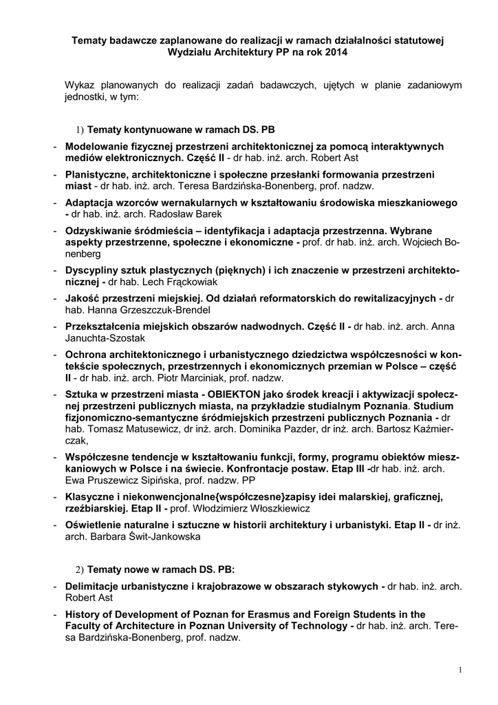 Faculty of Architecture in Poznan University of Technology - dr hab. inŜ. arch. Teresa Bardzińska-Bonenberg, prof. nadzw.