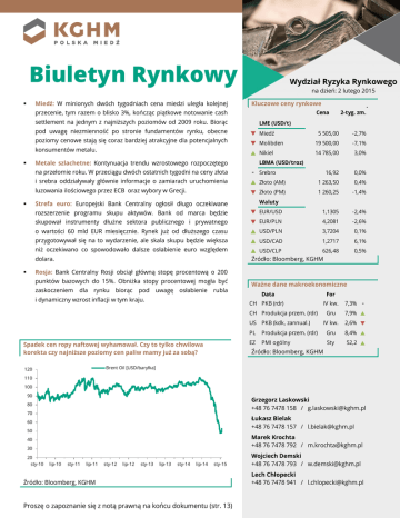 Biuletyn Rynkowy Miedź: W minionych dwóch tygodniach cena miedzi uległa kolejnej Wydział Ryzyka Rynkowego na dzień: 2 lutego 2015 Kluczowe ceny rynkowe przecenie, tym razem o blisko 3%, kończąc piątkowe notowanie cash Cena settlement na jednym z najniższych poziomów od 2009 roku. Biorąc pod uwagę niezmienność po stronie fundamentów rynku, obecne poziomy cenowe stają się coraz bardziej atrakcyjne dla potencjalnych konsumentów metalu. LME (USD/t) q Miedź 5 505,00 -2,7% q Molibden 19 500,00 -7,1% p Nikiel 14 785,00 3,0% 16,92 0,0% Metale szlachetne: Kontynuacja trendu wzrostowego rozpoczętego LBMA (USD/troz) na przełomie roku. W przeciągu dwóch ostatnich tygodni na ceny złota Srebro i srebra oddziaływały głównie informacje o zamiarach uruchomienia p Złoto (AM) 1 263,50 0,4% luzowania ilościowego przez ECB oraz wybory w Grecji. q Złoto (PM) 1 260,25 -1,4% rozszerzenie programu skupu aktywów. Bank od marca będzie q EUR/USD 1,1305 -2,4% skupował instrumenty dłużne sektora publicznego i prywatnego q EUR/PLN 4,2081 -2,6% o wartości 60 mld EUR miesięcznie. Rynek już od dłuższego czasu p USD/PLN 3,7204 0,1% przygotowywał się na to wydarzenie, ale skala skupu będzie większa p USD/CAD 1,2717 6,1% niż oczekiwano co spowodowało dalsze osłabienie euro względem 626,48 p USD/CLP Źródło: Bloomberg, KGHM 0,5% Waluty Strefa euro: Europejski Bank Centralny ogłosił długo oczekiwane 2-tyg. zm. dolara. Rosja: Bank Centralny Rosji obciął główną stopę procentową o 200 punktów bazowych do 15%. Obniżka stopy procentowej mogła być zaskoczeniem dla rynku biorąc pod uwagę osłabienie rubla i dynamiczny wzrost inflacji w tym kraju. Ważne dane makroekonomiczne Data For CH PKB (rdr) IV kw. 7,3% Gru 7,9% p IV kw. 2,6% q CH Produkcja przem. (rdr) US PKB (kdk, zannual.) Spadek cen ropy naftowej wyhamował. Czy to tylko chwilowa korekta czy najniższe poziomy cen paliw mamy już za sobą? PL Produkcja przem. (rdr) Gru 8,4% p EZ PMI ogólny Sty 52,2 p Źródło: Bloomberg, KGHM Brent Oil [USD/baryłka] 120 110 100 90 Grzegorz Laskowski +48 76 7478 158 / [email protected] 80 70 Łukasz Bielak +48 76 7478 157 / [email protected] 60 50 Marek Krochta +48 76 7478 792 / [email protected] 40 30 20 sty-10 lip-10 sty-11 lip-11 sty-12 lip-12 sty-13 lip-13 sty-14 lip-14 sty-15 Wysokość: 6 cm; Szerokość 11,5 cm Źródło: Bloomberg, KGHM Proszę o zapoznanie się z notą prawną na końcu dokumentu (str. 13) Wojciech Demski +48 76 7478 793 / [email protected] Lech Chłopecki +48 76 7478 941 / [email protected] Biuletyn Rynkowy | 2 lutego 2015 Metale bazowe i szlachetne Miedź W minionych dwóch tygodniach cena miedzi uległa kolejnej przecenie, tym razem o blisko 3%, kończąc piątkowe notowanie cash settlement na jednym z najniższych poziomów od 2009 roku. Biorąc pod uwagę niezmienność po stronie fundamentów rynku, obecne poziomy cenowe stają się coraz bardziej atrakcyjne dla potencjalnych konsumentów metalu. Dla przykładu, na rynku pojawiają się nieoficjalne informacje o potencjalnych zakupach z strony Chińskiej Agencji Rezerw Materiałowych (SRB), która jest zainteresowana odbudowaniem zapasów strategicznych miedzi. Równocześnie, niska cena metalu zaczyna uderzać w producentów oraz projekty miedziowe, szczególne te potencjalne, których opłacalność przy obecnych cenach jest nieakceptowalna dla akcjonariuszy. SRB sonduje rynek w celu zakupu miedzi SRB planuje zakupić minimalnie 200 tys. ton miedzi w 2015 roku Z nieoficjalnych informacji agencji Bloomberg wynika, że Chińska Agencja Rezerw Materiałowych (SRB – State Reserve Bureau) poszukuje dostaw miedzi rafinowanej, w celu powiększenia zapasów strategicznych. SRB planuje zakupić po ok. 20 tys. ton od różnych dostawców, jednakże żaden z producentów miedzi oficjalnie nie potwierdził takiego zapytania. Nieoficjalnie mówi się o zakupach rzędu co najmniej 200-250 tys. ton miedzi, przy ok. 500 tys. ton zakupionych w roku ubiegłym. Według niektórych instytucji finansowych, ilość zakupiona w 2014 odpowiada zakładanej nadwyżce podaży nad popytem. W przypadku spadku cen do jeszcze niższych poziomów, SRB może zwiększyć zakupy. Według informacji pochodzących z agencji informacyjnej Reuters, budżet SRB z początku roku był szacowany na zakup rzędu 200-500 tys. ton, jednakże po spadku cen, chińska instytucja będzie mogła pozwolić sobie na znacznie większe zakupy, co powinno mieć niemały wpływ na rynek miedzi. Stosunkowo stabilny kurs renminbi sprzyja potencjalnym zakupom na rynku miedzi Oprócz najniższych poziomów cenowych miedzi od lipca 2009 roku, zakupom czerwonego metalu w Państwie Środka pomaga stabilny w porównaniu do innych walut krajów emerging markets kurs USDCNY. Na przestrzeni ostatnich miesięcy juan uległ jedynie niewielkiej deprecjacji, wobec czego obecne poziomy cen miedzi wyrażone w chińskiej walucie są bardzo atrakcyjne dla SRB. W ostatnich latach uczestnicy rynku metali bazowych dość uważnie obserwują ruchy ze strony SRB, ze względu na duży potencjał oddziaływania na ceny towarów. Chile obniża prognozę ceny Cu na 2015 rok do 2,85 USD/lb Cochilco obniża prognozę średniej ceny miedzi na 2015 rok Chilijska Komisja do spraw miedzi, Cochilco, obniżyła prognozy średniej 2015 roku do 2,85USD/lb, czyli ok. 6 238 USD/t. Wśród głównych przyczyn wymienia się spadki na rynkach towarowych, umacniającego się amerykańskiego dolara 2 / 13 Biuletyn Rynkowy | 2 lutego 2015 oraz obawy o trwałość popytu z Chin. W 2016 roku Cochilco prognozuje średnia cenę na poziomie 2,80 USD/lb (6 173 USD/t). Zdaniem chilijskiej instytucji zajmującej się rynkiem miedzi główny wpływ na prognozę ma mieć wzrost popytu w drugiej połowie roku, co stanie się za sprawą zmniejszenia niepewności odnośnie chińskiego stanu gospodarki oraz zwrócenia się inwestorów w stronę bardziej ryzykownych klas aktywów. Przewidywania Cochilco