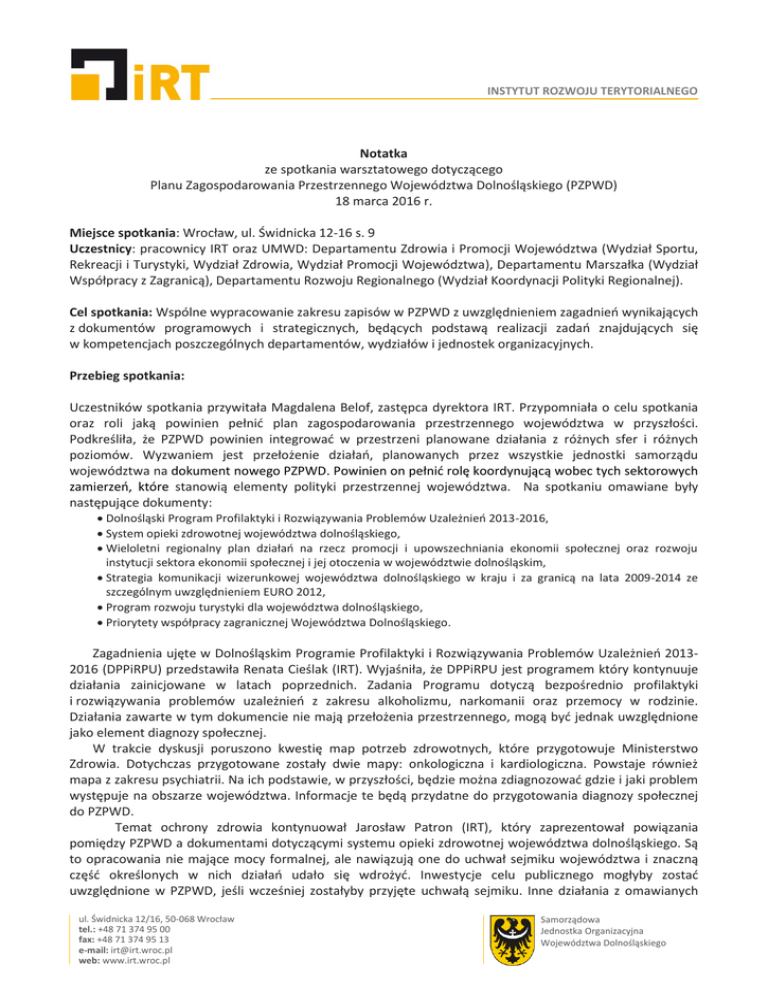 INSTYTUT ROZWOJU TERYTORIALNEGO Notatka ze spotkania warsztatowego dotyczącego Planu Zagospodarowania Przestrzennego Województwa Dolnośląskiego (PZPWD) 18 marca 2016 r. Miejsce spotkania: Wrocław, ul. Świdnicka 12-16 s. 9 Uczestnicy: pracownicy IRT oraz UMWD: Departamentu Zdrowia i Promocji Województwa (Wydział Sportu, Rekreacji i Turystyki, Wydział Zdrowia, Wydział Promocji Województwa), Departamentu Marszałka (Wydział Współpracy z Zagranicą), Departamentu Rozwoju Regionalnego (Wydział Koordynacji Polityki Regionalnej). Cel spotkania: Wspólne wypracowanie zakresu zapisów w PZPWD z uwzględnieniem zagadnień wynikających z dokumentów programowych i strategicznych, będących podstawą realizacji zadań znajdujących się w kompetencjach poszczególnych departamentów, wydziałów i jednostek organizacyjnych. Przebieg spotkania: Uczestników spotkania przywitała Magdalena Belof, zastępca dyrektora IRT. Przypomniała o celu spotkania oraz roli jaką powinien pełnić plan zagospodarowania przestrzennego województwa w przyszłości. Podkreśliła, że PZPWD powinien integrować w przestrzeni planowane działania z różnych sfer i różnych poziomów. Wyzwaniem jest przełożenie działań, planowanych przez wszystkie jednostki samorządu województwa na dokument nowego PZPWD. Powinien on pełnić rolę koordynującą wobec tych sektorowych zamierzeń, które stanowią elementy polityki przestrzennej województwa. Na spotkaniu omawiane były następujące dokumenty: Dolnośląski Program Profilaktyki i Rozwiązywania Problemów Uzależnień 2013-2016, System opieki zdrowotnej województwa dolnośląskiego, Wieloletni regionalny plan działań na rzecz promocji i upowszechniania ekonomii społecznej oraz rozwoju instytucji sektora ekonomii społecznej i jej otoczenia w województwie dolnośląskim, Strategia komunikacji wizerunkowej województwa dolnośląskiego w kraju i za granicą na lata 2009-2014 ze szczególnym uwzględnieniem EURO 2012, Program rozwoju turystyki dla województwa dolnośląskiego, Priorytety współpracy zagranicznej Województwa Dolnośląskiego. Zagadnienia ujęte w Dolnośląskim Programie Profilaktyki i Rozwiązywania Problemów Uzależnień 20132016 (DPPiRPU) przedstawiła Renata Cieślak (IRT). Wyjaśniła, że DPPiRPU jest programem który kontynuuje działania zainicjowane w latach poprzednich. Zadania Programu dotyczą bezpośrednio profilaktyki i rozwiązywania problemów uzależnień z zakresu alkoholizmu, narkomanii oraz przemocy w rodzinie. Działania zawarte w tym dokumencie nie mają przełożenia przestrzennego, mogą być jednak uwzględnione jako element diagnozy społecznej. W trakcie dyskusji poruszono kwestię map potrzeb zdrowotnych, które przygotowuje Ministerstwo Zdrowia. Dotychczas przygotowane zostały dwie mapy: onkologiczna i kardiologiczna. Powstaje również mapa z zakresu psychiatrii. Na ich podstawie, w przyszłości, będzie można zdiagnozować gdzie i jaki problem występuje na obszarze województwa. Informacje te będą przydatne do przygotowania diagnozy społecznej do PZPWD. Temat ochrony zdrowia kontynuował Jarosław Patron (IRT), który zaprezentował powiązania pomiędzy PZPWD a dokumentami dotyczącymi systemu opieki zdrowotnej województwa dolnośląskiego. Są to opracowania nie mające mocy formalnej, ale nawiązują one do uchwał sejmiku województwa i znaczną część określonych w nich działań udało się wdrożyć. Inwestycje celu publicznego mogłyby zostać uwzględnione w PZPWD, jeśli wcześniej zostałyby przyjęte uchwałą sejmiku. Inne działania z omawianych ul. Świdnicka 12/16, 50-068 Wrocław tel.: +48 71 374 95 00 fax: +48 71 374 95 13 e-mail: [email protected] web: www.irt.wroc.pl Samorządowa Jednostka Organizacyjna Województwa Dolnośląskiego programów mogą być uwzględnione jedynie jako zapisy miękkie, będące wyrazem polityki województwa. W kwestii rozmieszczenia oddziałów szpitalnych duże znaczenie będą miały mapy potrzeb zdrowotnych. Założenia Wieloletniego regionalnego planu działań na rzecz promocji i upowszechniania ekonomii społecznej oraz rozwoju instytucji sektora ekonomii społecznej i jej otoczenia w województwie dolnośląskim (WRPDES), przybliżyła Anna Bocian (IRT). Dokument ma charakter uzupełniający istniejące i realizowane kierunki działań polityki rozwoju na Dolnym Śląsku. Zbiera on i programuje rozwiązania dotyczące aktywizacji gospodarczej oraz społeczno-zawodowej mieszkańców, poprzez działania związane z rozwojem ekonomii społecznej. Większość działań zawartych w dokumencie ma charakter lokalny, regulowany na szczeblu wojewódzkim. Diagnoza WRPDE stanowi źródło informacji przydatnych w tworzeniu wizji rozwoju Dolnego Śląska w odniesieniu sfery społecznej. Kolejnym omawianym dokumentem, który zaprezentowała Ewelina Czuksanow (IRT), była Strategia komunikacji wizerunkowej województwa dolnośląskiego w kraju i za granicą na lata 2009-2014 ze szczególnym uwzględnieniem EURO 2012. Ponieważ dokument ten jest już nieaktualny, dyskutowano nad zasadnością jego wykorzystania w nowo tworzonym PZPWD. Pani Julia Wach – dyrektor Wydziału Promocji UMWD poinformowała uczestników spotkania, że w najbliższym czasie zostanie opracowana nowa strategia komunikacji wizerunkowej regionu. Marzena Pasak (IRT) zaprezentowała Program rozwoju turystyki dla województwa dolnośląskiego. Dokument został opracowany w 2009 roku, i w znacznej części utracił aktualność. Wprowadził on nowatorski podział województwa dolnośląskiego na subregiony turystyczne. W programie, w części dotyczącej całego województwa, zostały zawarte działania o charakterze przestrzennym w podziale na wydzielone na obszarze województwa subregiony. Dotyczą one m.in. wytyczenia regionalnych i ponadregionalnych szlaków turystycznych, rozwoju wiodących form turystyki w subregionach w tym m.in. turystyki uzdrowiskowej. Pomimo utr