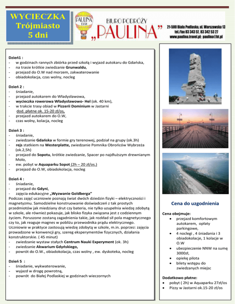 WYCIECZKA WYCIECZKA DO PARYŻA Trójmiasto 56dni dni Dzień1 : - w godzinach rannych zbiórka przed szkołą i wyjazd autokaru do Gdańska, - na trasie krótkie zwiedzanie Grunwaldu, - przejazd do O.W nad morzem, zakwaterowanie - obiadokolacja, czas wolny, nocleg Dzień 2 : - śniadanie, - przejazd autokarem do Władysławowa, - wycieczka rowerowa Władysławowo- Hel (ok. 40 km), - w trakcie trasy obiad w Pizzerii Dominium w Jastarni dod. płatne ok. 15-20 zł/os, - przejazd autokarem do O.W, - czas wolny, kolacja, nocleg Dzień 3 : - śniadanie, - zwiedzanie Gdańska w formie gry terenowej, podział na grupy (ok.3h) - rejs statkiem na Westerplatte, zwiedzanie Pomnika Obrońców Wybrzeża (ok.2,5h) - przejazd do Sopotu, krótkie zwiedzanie, Spacer po najdłuższym drewnianym Molo, - ew. pobyt w Aquaparku Sopot (2h – 20 zł/os.) - przejazd do O.W, obiadokolacja, nocleg Dzień 4 : - śniadanie, - przejazd do Gdyni, - zajęcia edukacyjne „Wyzwanie Goldberga” Podczas zajęć uczniowie poznają świat dwóch dziedzin fizyki – elektryczności i magnetyzmu. Samodzielne konstruowanie doświadczeń z tak prostych przedmiotów jak miedziany drut czy bateria, nie tylko uzupełnia wiedzę zdobytą w szkole, ale również pokazuje, jak blisko fizyka związana jest z codziennym życiem. Poruszone zostaną zagadnienia takie, jak rozkład sił pola magnetycznego czy to, jak reaguje magnes w pobliżu przewodnika prądu elektrycznego. Uczniowie w praktyce zastosują wiedzę zdobytą w szkole, m.in. poprzez: zajęcia prowadzone w konwencji gry, szereg eksperymentów fizycznych, działania konstruktorskie. ( 45 minut) - zwiedzanie wystaw stałych Centrum Nauki Experyment (ok. 3h) - zwiedzanie Akwarium Gdyńskiego, - powrót do O.W., obiadokolacja, czas wolny , ew. dyskoteka, nocleg Dzień 5 : - śniadanie, wykwaterowanie, - wyjazd w drogę powrotną, - powrót do Białej Podlaskiej w godzinach wieczornych Cena do uzgodnienia Cena obejmuje: • przejazd komfortowym autokarem, opłaty parkingowe, • 4 noclegi , 4 śniadania i 3 obiadokolacje, 1 kolacje w O.W • ubezpieczenie NNW na sumę 3000zł, • opiekę pilota • bilety wstępu do zwiedzanych miejsc Dodatkowo płatne: • pobyt ( 2h) w Aquaparku 27zł/os • Pizzy w Jastarni ok.15-20 zł/os