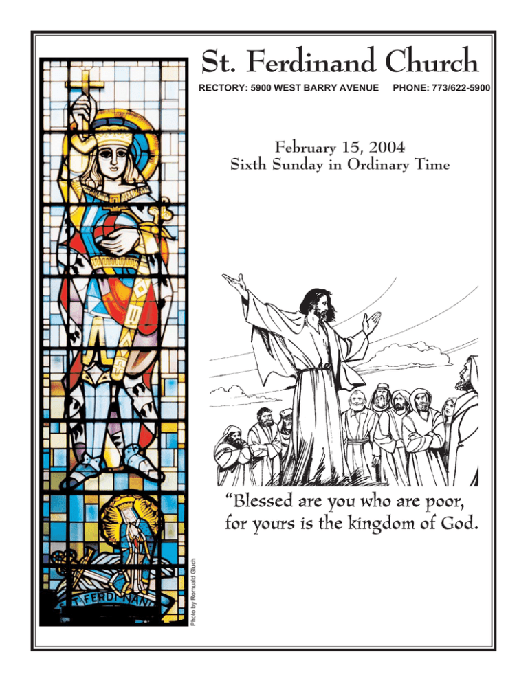 St. Ferdinand Church RECTORY: 5900 WEST BARRY AVENUE PHONE: 773/622-5900 Photo by Romuald Gluch February 15, 2004 Sixth Sunday in Ordinary Time Page Two Sixth Sunday in Ordinary Time MONDAY, Weekday 7:00 AM—Joseph Jakoby, Jr. rq. Mary Jo Lundin 8:00 AM—Casilde Cesaroni rq. Daughter TUESDAY, Weekday / Seven Servite Founders 7:00 AM—Soledad Arevalo rq. Castillo Family 8:00 AM—Claudio Clemente rq. John Demonte WEDNESDAY, Weekday 7:00 AM—Sharon Pirzyk rq. Family & Friends 7:00 AM—(Chapel)Mass in Polish 8:00 AM—Albina Minelga rq. Dawn Whalen THURSDAY, Weekday 7:00 AM—Deceased Members of the Janz Family rq. Margery Janz 8:00 AM—Edward & Monica Slattery rq. Daughter & Sister FRIDAY, Weekday 7:00 AM—Ernesto M. Lopez rq. Family 8:00 AM—Frank Losciuto (32nd Anniv.) rq. Wife SATURDAY, Weekday / Peter Damian, bishop, doctor 7:00 AM—^za dusze w czyœæcu cierpi¹ce 8:00 AM—Robert Sierminski rq. Wife 1:00 PM—Wedding Liturgy Dariusz Kwiatkowski and Katarzyna Kowalik 3:00 PM—Wedding Liturgy Piotr Sobala and Magdelena Reczek Sunday Anticipated Mass 5:00 PM—Clemente Family rq. Michael Clemente SUNDAY, Seventh Sunday in Ordinary Time 7:30 AM—Adeline Lewandowski rq. Family 7:30 AM—(Chapel) o zdrowie i b³og. Bo¿e oraz opiekê Bo¿¹ dla ca³ej rodziny Józefa i Marii w 35 rocz.œlubu; -o dary Ducha Œwiêtego dla Bogdana z ok urodzin; ^Stefan Bro¿ek 9:00 AM—Stanley Kowalczyk rq. Antos Family 10:30 AM—(Chapel)Louis Rostan, Sr. rq. Carol & Lou 10:45 AM—-^Józef Sak 6 m-c po œm.; ^Kazimierz Szef, Anna G³¹biñska; -o b³og. Bo¿e, potrzebne ³aski i zdrowie dla Miros³awa Bis z ok urodzin 12:15 PM—(Chapel) Mass in Italian 12:30 PM—Alberto Arango rq. Diego 3:00 PM—^Janina Pokora/ zamówi³a rodzina Burkot 5:00 PM—People of St. Ferdinand 6:30 PM—o zdrowie, b³og. Bo¿e i potrzebne ³aski dla Zdzis³awa i jego rodziny The sanctuary lamps this week are lit for: ^Clemente & Mallardi Families ^Carmella Mele HANDMAIDS M. Netzel February 15, 2004 Our Blessed Lord has called home our parishioners Sophy Gofron and Sygmunt Golnik for whom we promise our prayers. May they and all our other deceased parishioners enjoy peace and happiness in God’s Sacred Presence. 3rd publication Dariusz Kwiatkowski and Katarzyna Kowalik Piotr Sobala and Magdelena Reczek 2nd publication None 1st publication None WE WELCOME IN BAPTISM John Steven, son of John and Laura (Shimizu) Muncy; Samuel Demas, son of Jason and Mary (Messina) Staniszewski. Save the dates! Lenten Mission March 18-22, 2004 Abbot Marcel Rooney, O.S.B. Mission Director READINGS FOR THE WEEK Monday: Tuesday: Wednesday: Thursday: Friday: Saturday: Sunday: Jas 1:1-11; Mk 8:11-13 Jas 1:12-18; Mk 8:14-21 Jas 1:19-27; Mk 8:22-26 Jas 2:1-9; Mk 8:27-33 Jas 2:14-24, 26; Mk 8:34 — 9:1 Jas 3:1-10; Mk 9:2-13 1 Sm 26:2, 7-9, 12-13, 22-23; Ps 103; 1 Cor 15:45-49; Lk 6:27-38 February 15, 2004 Sixth Sunday in Ordinary Time Alumni News Honor Roll It is with great pride that we share with you the names of the St. Ferdinand parishioners who earned a place on their high school’s honor roll. We join their parents and teachers in congratulating them. Resurrection High School Diana Saavedra, ‘04 First Honors Maria Stadnicka, ‘04 First Honors Natalie Wellhausen,’ 04 First Honors Juliana Pike, ‘05 First Honors Meggan Kupinski, ‘07 First Honors Samantha Studzinski, ‘07 First Honors Courtney Clark, ‘06 Second Honors Mallory Clark, ‘06 Second Honors Amanda Sammarco, ‘06 Second Honors Emily Muszczynski, ‘07 Second Honors Fenwick High School Maciej Kasperowicz, ‘04 First Honors Christopher Zaccaro, ‘04 Second Honors Loyola Academy Timothy P. Leahy, ‘06 Academic First Honors Melissa Santiago, ‘05 Loyola Second Honors Robert Waz, ‘07 Academic First Honors Congratulations, everyone. Your parish family is very proud of you. EUCHARISTIC HEART OF JESUS SISTERS 8430 SOUTH CALUMET AVENUE, CHICAGO, IL 60619 773-874-9634 773-874-1022 [email protected] .............................................................. St. Ferdinand Rev. David J. Cortesi 5900 West Barry Avenue Chicago, IL 60634 January 07, 2004 Dear Fr. Cortesi, This is to acknowledge with thanks the reception of the sum of $5,636.54 from your church on our Mission appeal drive. Our prayers and thanks to all members of your parish for their generosity and support. Thank you for your generosity, May God continue to bless your mission. Sincerely yours in Christ, Sr. Theresa Ocloo EHJ Page Three As members of the parish faith community, it is our responsibility to remember both in concrete and spiritual ways those who cannot celebrate with us each week because they are ill. Those who are sick in turn, remember all of us daily in their prayers and in their sufferings. We experience many blessings because of their remembering us. And so ... please remember in your prayers: Joseph Balicki June Landers Timothy Benson James Lamberti Albin Bilinski Sam LoDolce Stephanie Bosco Netta Lohrmann Alba Jennie Burroughs Eleanor Loscuito Mary Butler Marie Lucas Benito Cabanin Genevieve Lukes Sharon Carr Elizabeth Ann Maher Josephine Chiero Susan Maher Bishop Edwin Conway Francesco Mangialardo Anna Diks Gianni Marconi Honor Draftz Mary Martin PaulDuda Emilia Moreno Lillian Dziedzic Deborah L. Pawlak Alice Flannagan Timothy Rajski Fred Forte Roseann Regan Joseph Gagliano Sophie Regner Marilyn Gibbons James Rowe, Sr. Fatima Gomez Alicia Schippits George Greco Jack Schneider Rocco Greco Sr. Roberta Sweitzer, BVM Ben Guttiula Infant Cameron Scott Mary Hain Charles Simonek Margaret Heft Lenore Simzyk Mary Ann Johansen Raymundo Soriano, Sr. Catherine Keeler Tony Spano Stanley Kochniarczyk Estelle Stybur Helen Kosirog Ann Sullivan Tad Koziol Minerva Watson Bill Kummer Alex Wegrzyn Marie Kummer Jerome Wells EXPEDIENCY IS NO JUSTIFICATION No one is justified in doing evil on the ground of expediency. —Theodore Roosevelt Our Financial Support of St. Ferdinand Parish Sunday, February 7/8, 
