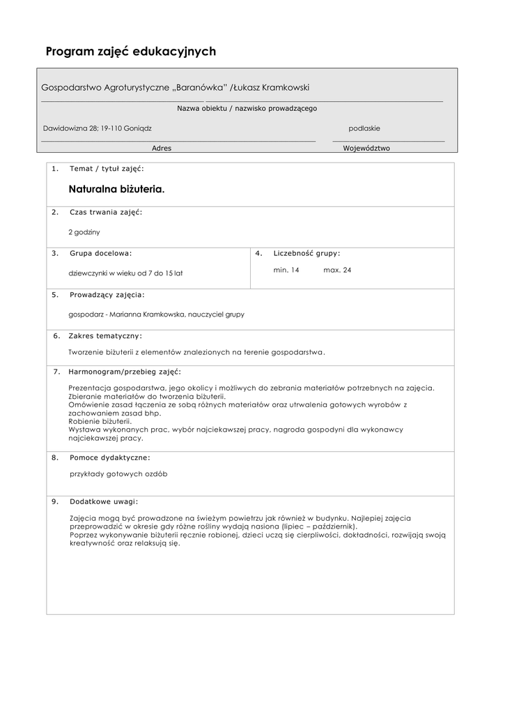 Program zajęć edukacyjnych Gospodarstwo Agroturystyczne „Baranówka” /Łukasz Kramkowski ________________________________________________ ______________________________________________________________________ Nazwa obiektu / nazwisko prowadzącego Dawidowizna 28; 19-110 Goniądz _________________________________________________________________________________ Adres 1. podlaskie _________________________________ Województwo Temat / tytuł zajęć: Naturalna biżuteria. 2. Czas trwania zajęć: 2 godziny 3. Grupa docelowa: dziewczynki w wieku od 7 do 15 lat 5. 4. Liczebność grupy: min. 14 max. 24 Prowadzący zajęcia: gospodarz - Marianna Kramkowska, nauczyciel grupy 6. Zakres tematyczny: Tworzenie biżuterii z elementów znalezionych na terenie gospodarstwa . 7. Harmonogram/przebieg zajęć: Prezentacja gospodarstwa, jego okolicy i możliwych do zebrania materiałów potrzebnych na zajęcia. Zbieranie materiałów do tworzenia biżuterii. Omówienie zasad łączenia ze sobą różnych materiałów oraz utrwalenia gotowych wyrobów z zachowaniem zasad bhp. Robienie biżuterii. Wystawa wykonanych prac, wybór najciekawszej pracy, nagroda gospodyni dla wykonawcy najciekawszej pracy. 8. Pomoce dydaktyczne: przykłady gotowych ozdób 9. Dodatkowe uwagi: Zajęcia mogą być prowadzone na świeżym powietrzu jak również w budynku. Najlepiej zajęcia przeprowadzić w okresie gdy różne rośliny wydają nasiona (lipiec – październik). Poprzez wykonywanie biżuterii ręcznie robionej, dzieci uczą się cierpliwości, dokładności, rozwijają swoją kreatywność oraz relaksują się.