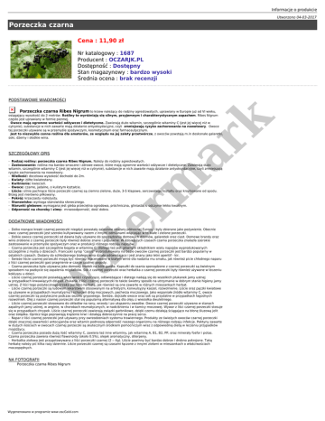 Informacje o produkcie Utworzono 04-03-2017 Porzeczka czarna Cena : 11,90 zł Nr katalogowy : 1687 Producent : OCZARJK.PL Dostępność : Dostępny Stan magazynowy : bardzo wysoki Średnia ocena : brak recenzji PODSTAWOWE WIADOMOŚCI SZCZEGÓŁOWY OPIS er m ar k Porzeczka czarna Ribes Nigrum to krzew należący do rodziny agrestowatych, uprawiany w Europie już od VI wieku, osiągający wysokość do 2 metrów. Rośliny te wyróżniają się silnym, przyjemnym i charakterystycznym zapachem. Ribes Nigrum często jest uprawiany w formie piennej. Owoce mają ogromne wartości odżywcze i dietetyczne. Zawierają dużo witamin, szczególnie witaminy C (jest jej więcej niż w cytrynie), substancje w nich zawarte mają działanie antyoksydacyjne, czyli zmniejszają ryzyko zachorowania na nowotwory. Owoce tej porzeczki używane są w przemyśle spożywczym, kosmetycznym oraz farmaceutycznym. Jest to niezwykle cenna roślina dla amatorów, ze względu na jej zalety przetwórcze, z owoców powstają m.in doskonałe galaretki, soki, dżemy i słodkie wina. - Rodzaj rośliny: porzeczka czarna Ribes Nigrum. Należy do rodziny agrestowatych. - Zastosowanie: roślina ma bardzo smaczne i zdrowe owoce, które mają ogromne wartości odżywcze i dietetyczne. Zawierają dużo witamin, szczególnie witaminy C (jest jej więcej niż w cytrynie), substancje w nich zawarte mają działanie antyoksydacyjne, czyli zmniejszają ryzyko zachorowania na nowotwory. - Wielkość: docelowa wysokość dochodzi do 2m. - Kwiaty: żółte kwiatostany. - Kwitnienie: kwiecień. - Owoce: czarne, jadalne, o kulistym kształcie. - Liście: silnie pachnące liście porzeczki czarnej są ciemno zielone, duże, 3-5 klapowe, sercowatego kształtu oraz kropkowane od spodu. Brzeg jest nierówno piłkowany. - Pokrój: krzaczasty rozłożysty. - Stanowisko: wymaga stanowiska słonecznego. - Warunki glebowe: wymagana jest gleba przeciętna ogrodowa, próchniczna, gliniasta, o odczynie lekko kwaśnym. - Odporność na choroby i zimę: mrozoodporność, dość dobra. DODATKOWE WIADOMOŚCI w at - Dziko rosnące krzaki czarnej porzeczki niegdyś porastały zalesione obszary północnej Europy i były zbierane jako pożywienie. Obecnie owoc czarnej porzeczki jest szeroko kultywowany razem z innymi odmianami włączając w to białe i zielone porzeczki. - Dzikie owoce czarnej porzeczki od dawna były używane do sporządzania domowych dżemów, galaretek oraz ciast. Domowe brandy oraz wino zrobione z czarnej porzeczki były również dobrze znane i popularne. W dzisiejszych czasach czarna porzeczka znalazła szerokie zastosowanie w przemyśle spożywczym oraz w produkcji różnego rodzaju napojów. - Czarna porzeczka jest szczególnie bogata w witaminę C, dlatego też jest głównym składnikiem wielu napojów wyprodukowanych szczególnie z myślą o dzieciach. Francuski syrop “cassis” wyprodukowany na bazie owoców czarnej porzeczki jest bardzo popularny w ostatnich czasach. Dodany do schłodzonego białego wina działa odświeżająco i jest znany jako letni aperitif - kir. - Świeże liście czarnej porzeczki mogą być również macerowane w białym winie dla nadania mu smaku, jak również picie chłodnego naparu z liści czarnej porzeczki gasi pragnienie w czasie upalnej pogody. - Czarna porzeczka była używana jako domowy środek na bóle gardła. Kapsułki do ssania sporządzone z czarnej porzeczki są świetnym sposobem na pozbycie się zapalenia migdałków. Sok z czarnej porzeczki oraz herbatka z czarnej porzeczki były również używane w leczeniu kokluszu u dzieci. - Liście czarnej porzeczki posiadają właściwości czyszczące, odświeżające i dlatego nadają się do wszelkich płukanek jamy ustnej w przypadkach krwawiących dziąseł. Płukanki z liści czarnej porzeczki to także świetny sposób na utrzymanie w dobrym stanie higieny jamy ustnej. Z liści tego pożytecznego krzaka parzono herbatę, jak również są one zawarte w różnych mieszankach herbat. - Liście czarnej porzeczki są ludowym lekarstwem stosowanym na artretyzm, konwulsyjny kaszel, rozwolnienie. Liście oraz pączki kwiatowe są używane w przypadkach reumatyzmu i schorzeń dróg moczowych, pęcherza moczowego. Jako wspaniałe źródło witaminy C, owoce czarnej porzeczki są pożyteczne podczas sezonu grypowego. Świeże, dojrzałe owoce oraz sok są przydatne w przypadkach łagodnych rozwolnień. Olej z nasion czarnej porzeczki stał się popularną alternatywą dla oleju z wiesiołka dwuletniego. - Liście czarnej porzeczki stosowano do okładów na rany, wrzody i po ukąszeniu owadów. Owoce czarnej porzeczki używano w stanach zapalnych jamy ustnej, w anginie, w chorobach reumatycznych, w nadciśnieniu i w kamicy moczowej. Wywar z liści czarnej porzeczki stosuje się w przypadkach chrypek. Liście czarnej porzeczki zawierają związki garbnikowe, dzięki czemu działają ściągająco na błonę śluzową jelit oraz żołądka. Oprócz tego poprawiają krążenie krwi i działają dobroczynnie na pracę serca. - Napar z liści czarnej porzeczki jest używany przy owrzodzeniach systemu trawiennego. Produkty ze świeżych owoców czarnej porzeczki dzięki znacznej zawartości antocyjanów oraz witamin podnoszą odporność naszego organizmu na różnego rodzaju infekcje. Pektyny zawarte w dużych ilościach w owocach czarnej porzeczki są skutecznym środkiem pomocniczym wraz z odpowiednią dietą w leczeniu przypadków miażdżycy. - Czarna porzeczka posiada dużą ilość witaminy C, zawiera też inne witaminy, jak witaminę A, B1, B2, PP, oraz minerały fosfor i potas. Czarna porzeczka zawiera również flawonoidy (około 0.5%), olejek aromatyczny, diterpeny. - Herbatka ziołowa jest przygotowywana z liści porzeczki czarnej (2 – 4g). Liście powinny być bardzo dobrze i drobno pokrojone. Taką herbatę należy pić kilka razy dziennie. Liście porzeczki czarnej są czasami łączone z innymi ziołami w mieszankach o właściwościach