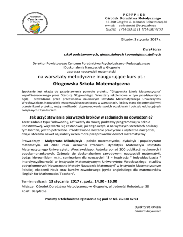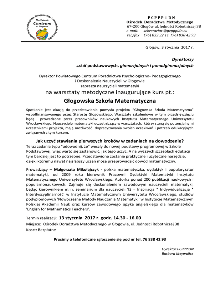PCPPP i DN Ośrodek Doradztwa Metodycznego 67-200 Głogów ul. Jedności Robotniczej 38 e-mail: sekretariat @pcpppidn.eu tel./fax (76) 833 32 11 (76) 838 42 93 ‘ Głogów, 3 stycznia 2017 r. Dyrektorzy szkół podstawowych, gimnazjalnych i ponadgimnazjalnych Dyrektor Powiatowego Centrum Poradnictwa Psychologiczno- Pedagogicznego i Doskonalenia Nauczycieli w Głogowie zaprasza nauczycieli matematyki na warsztaty metodyczne inaugurujące kurs pt.: Głogowska Szkoła Matematyczna Spotkanie jest okazją do przedstawienia pomysłu projektu ”Głogowska Szkoła Matematyczna” współfinansowanego przez Starostę Głogowskiego. Warsztaty szkoleniowe w tym przedsięwzięciu będą prowadzone przez pracowników naukowych Instytutu Matematycznego Uniwersytetu Wrocławskiego. Nauczyciele matematyki uczestniczący w warsztatach, którzy staną się potencjalnymi uczestnikami projektu, mają możliwość doprecyzowania swoich oczekiwań i potrzeb edukacyjnych związanych z tym kursem. Jak uczyć stawiania pierwszych kroków w zadaniach na dowodzenie? Teraz zadania typu "udowodnij, że" weszły do nowej podstawy programowej w Szkole Podstawowej, więc warto się zastanowić, jak tego uczyć. A na wyższych szczeblach edukacji tym bardziej jest to potrzebne. Przedstawione zostanie praktyczne i użyteczne narzędzie, dzięki któremu nawet najsłabszy uczeń może przeprowadzić dowód matematyczny. Prowadzący – Małgorzata Mikołajczyk - polska matematyczka, dydaktyk i popularyzator matematyki, od 2009 roku kierownik Pracowni Dydaktyki Matematyki Instytutu Matematycznego Uniwersytetu Wrocławskiego. Autorka ponad 200 publikacji naukowych i popularnonaukowych. Zajmuje się doskonaleniem zawodowym nauczycieli matematyki, będąc kierownikiem m.in. seminarium dla nauczycieli 'I3 = Inspiracja * Indywidualizacja * Interdyscyplinarność' w Instytucie Matematycznym Uniwersytetu Wrocławskiego, studiów podyplomowych 'Nowoczesne Metody Nauczania Matematyki' w Instytucie Matematycznym Polskiej Akademii Nauk oraz kursów zawodowego języka angielskiego dla matematyków 'English for Mathematics Teachers'. Termin realizacji: 13 stycznia 2017 r. godz. 14.30 - 16.00 Miejsce: Ośrodek Doradztwa Metodycznego w Głogowie, ul. Jedności Robotniczej 38 Koszt: Bezpłatne Prosimy o telefoniczne zgłoszenie się pod nr tel. 76 838 42 93 Dyrektor PCPPPiDN Barbara Krzywulicz