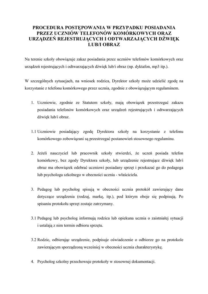 PROCEDURA POSTĘPOWANIA W PRZYPADKU POSIADANIA PRZEZ UCZNIÓW TELEFONÓW KOMÓRKOWYCH ORAZ URZĄDZEŃ REJESTRUJĄCYCH I ODTWARZAJĄCYCH DŹWIĘK LUB/I OBRAZ Na terenie szkoły obowiązuje zakaz posiadania przez uczniów telefonów komórkowych oraz urządzeń rejestrujących i odtwarzających dźwięk lub/i obraz (np. dyktafon, mp3 itp.). W szczególnych sytuacjach, na wniosek rodzica, Dyrektor szkoły moŜe udzielić zgodę na korzystanie z telefonu komórkowego przez ucznia, zgodnie z obowiązującym regulaminem. 1. Uczniowie, zgodnie ze Statutem szkoły, mają obowiązek przestrzegać zakazu posiadania telefonów komórkowych oraz urządzeń rejestrujących i odtwarzających dźwięk lub/i obraz. 1.1 Uczniowie posiadający zgodę Dyrektora szkoły na korzystanie z telefonu komórkowego zobowiązani są przestrzegać postanowień stosownego regulaminu. 2. JeŜeli nauczyciel lub pracownik szkoły stwierdzi, Ŝe uczeń posiada telefon komórkowy, bez zgody Dyrektora szkoły, lub urządzenie rejestrujące dźwięk lub/i obraz ma obowiązek odebrać uczniowi posiadany sprzęt i przekazać go do pedagoga lub psychologa szkolnego w obecności ucznia - właściciela. 3. Pedagog lub psycholog spisują w obecności ucznia protokół zawierający dane dotyczące urządzenia (rodzaj, markę, itp.), pod którym oboje się podpisują. Po spisaniu protokołu sprzęt zostaje zatrzymany. 3.1 Pedagog lub psycholog informują rodzica lub opiekuna ucznia o zaistniałej sytuacji i ustalają z nim termin odbioru sprzętu. 3.2 Rodzic, odbierając urządzenie, podpisuje oświadczenie o odbiorze go na protokole zawierającym sporządzoną wcześniej w obecności ucznia charakterystykę. 4. Psycholog szkolny przechowuje protokoły w stosownej dokumentacji. PROTOKÓŁ ZATRZYMANIA URZĄDZENIA ZGODNIE Z PROCEDURĄ POSTĘPOWANIA W PRZYPADKU POSIADANIA PRZEZ UCZNIÓW TELEFONÓW KOMÓRKOWYCH ORAZ URZĄDZEŃ REJESTRUJĄCYCH I ODTWARZAJĄCYCH DŹWIĘK LUB/I OBRAZ DATA ………………………………….. GODZINA ………………………………. IMIĘ I NAZWISKO UCZNIA ………………………………………………………………… KLASA ………………… Nauczyciel odbierający sprzęt ………………………………………………………………… Stwierdza się, Ŝe w/w uczeń nie przestrzegał zakazu posiadania na terenie szkoły telefonów komórkowych oraz urządzeń rejestrujących i odtwarzających dźwięk lub/i obraz. W związku z powyŜszym, zgodnie ze stosowną procedurą postępowania, urządzenie zostaje zatrzymane i zostanie przekazane rodzicowi lub opiekunowi dziecka. CHARAKTERYSTYKA SPRZĘTU: RODZAJ ……………………………………………………………………………………...... MARKA ………………………………………………………………………………………... MODEL ………………………………………………………………………………………... OPIS URZĄDZENIA ………………………………………………………………………...... ………………………………………………………………………………………………….. ………………………………………………………………………………………………….. ………………………………………………………………………………………………….. Podpis ucznia Podpis pedagoga lub psychologa OŚWIADCZENIE Oświadczam, Ŝe otrzymałam/em zatrzymany mojemu dziecku sprzęt i potwierdzam, Ŝe jest zgodny z powyŜszym opisem. Data i podpis rodzica lub opiekuna Podpis pedagoga lub psychologa