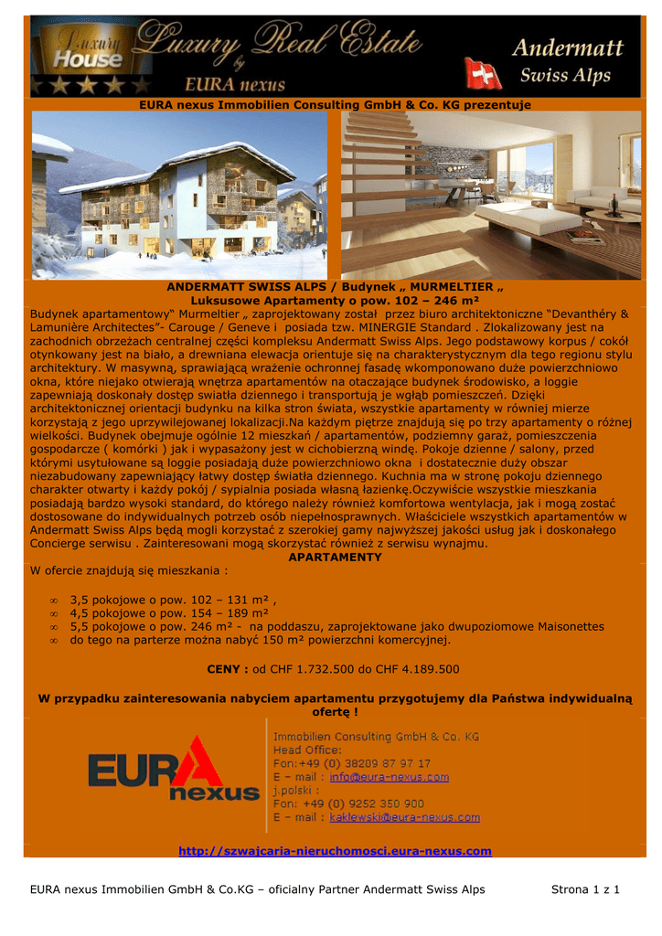EURA nexus Immobilien Consulting GmbH & Co. KG prezentuje ANDERMATT SWISS ALPS / Budynek „ MURMELTIER „ Luksusowe Apartamenty o pow. 102 – 246 m² Budynek apartamentowy“ Murmeltier „ zaprojektowany został przez biuro architektoniczne “Devanthéry & Lamunière Architectes”- Carouge / Geneve i posiada tzw. MINERGIE Standard . Zlokalizowany jest na zachodnich obrzeŜach centralnej części kompleksu Andermatt Swiss Alps. Jego podstawowy korpus / cokół otynkowany jest na biało, a drewniana elewacja orientuje się na charakterystycznym dla tego regionu stylu architektury. W masywną, sprawiającą wraŜenie ochronnej fasadę wkomponowano duŜe powierzchniowo okna, które niejako otwierają wnętrza apartamentów na otaczające budynek środowisko, a loggie zapewniają doskonały dostęp swiatła dziennego i transportują je wgłąb pomieszczeń. Dzięki architektonicznej orientacji budynku na kilka stron świata, wszystkie apartamenty w równiej mierze korzystają z jego uprzywilejowanej lokalizacji.Na kaŜdym piętrze znajdują się po trzy apartamenty o róŜnej wielkości. Budynek obejmuje ogólnie 12 mieszkań / apartamentów, podziemny garaŜ, pomieszczenia gospodarcze ( komórki ) jak i wypasaŜony jest w cichobierzną windę. Pokoje dzienne / salony, przed którymi usytułowane są loggie posiadają duŜe powierzchniowo okna i dostatecznie duŜy obszar niezabudowany zapewniający łatwy dostęp światła dziennego. Kuchnia ma w stronę pokoju dziennego charakter otwarty i kaŜdy pokój / sypialnia posiada własną łazienkę.Oczywiście wszystkie mieszkania posiadają bardzo wysoki standard, do którego naleŜy równieŜ komfortowa wentylacja, jak i mogą zostać dostosowane do indywidualnych potrzeb osób niepełnosprawnych. Właściciele wszystkich apartamentów w Andermatt Swiss Alps będą mogli korzystać z szerokiej gamy najwyŜszej jakości usług jak i doskonałego Concierge serwisu . Zainteresowani mogą skorzystać równieŜ z serwisu wynajmu. APARTAMENTY W ofercie znajdują się mieszkania : • • • • 3,5 pokojowe o pow. 102 – 131 m² , 4,5 pokojowe o pow. 154 – 189 m² 5,5 pokojowe o pow. 246 m² - na poddaszu, zaprojektowane jako dwupoziomowe Maisonettes do tego na parterze moŜna nabyć 150 m² powierzchni komercyjnej. CENY : od CHF 1.732.500 do CHF 4.189.500 W przypadku zainteresowania nabyciem apartamentu przygotujemy dla Państwa indywidualną ofertę ! http://szwajcaria-nieruchomosci.eura-nexus.com EURA nexus Immobilien GmbH & Co.KG – oficialny Partner Andermatt Swiss Alps Strona 1 z 1