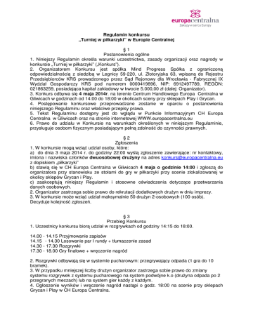 Regulamin konkursu „Turniej w piłkarzyki” w Europie Centralnej §1 Postanowienia ogólne 1. Niniejszy Regulamin określa warunki uczestnictwa, zasady organizacji oraz nagrody w konkursie „Turniej w piłkarzyki” („Konkurs”). 2. Organizatorem Konkursu jest spółka Mind Progress Spółka z ograniczoną odpowiedzialnością z siedzibą w Legnicy 59-220, ul. Złotoryjska 63, wpisaną do Rejestru Przedsiębiorców KRS prowadzonego przez Sąd Rejonowy dla Wrocławia - Fabrycznej IX Wydział Gospodarczy KRS pod numerem 0000419896, NIP: 6912497789, REGON: 021863259, posiadająca kapitał zakładowy w kwocie 5.000,00 zł (dalej: Organizator). 3. Konkurs odbywa się 4 maja 2014r. na terenie Centrum Handlowego Europa Centralna w Gliwicach w godzinach od 14:00 do 18:00 w okolicach sceny przy sklepach Play i Grycan. 4. Postępowanie konkursowe przeprowadzane zostanie w oparciu o postanowienia niniejszego Regulaminu oraz właściwe przepisy prawa. 5. Tekst Regulaminu dostępny jest do wglądu w Punkcie Informacyjnym CH Europa Centralna w Gliwicach oraz na stronie internetowej WWW.europacentralna.eu 6. Prawo do udziału w Konkursie na warunkach określonych w niniejszym Regulaminie, przysługuje osobom fizycznym posiadającym pełną zdolność do czynności prawnych. §2 Zgłoszenia 1. W konkursie mogą wziąć udział osoby, które: a) do dnia 3 maja 2014 r. do godziny 22:00 wyślą zgłoszenie zawierające: nr kontaktowy, imiona i nazwiska członków dwuosobowej drużyny na adres [email protected] z dopiskiem „piłkarzyki” b) stawią się w CH Europa Centralna w Gliwicach 4 maja o godzinie 14:00 i zgłoszą do organizatora przy stanowisku ze stołami do gry w piłkarzyki przy scenie zlokalizowanej w okolicy sklepów Grycan i Play. c) zaakceptują niniejszy Regulamin i stosowne oświadczenia dotyczące przetwarzania danych osobowych. 2. Organizator zastrzega sobie prawo do rekrutacji dodatkowych drużyn w dniu imprezy. 3. W konkursie może wziąć udział maksymalnie 50 drużyn 2-osobowych (100 osób). Decyduje kolejność zgłoszeń. §3 Przebieg Konkursu 1. Uczestnicy konkursu biorą udział w rozgrywkach od godziny 14:15 do 18:00. 14.00 - 14.15 Przyjmowanie zapisów 14.15 - 14.30 Losowanie par I rundy + tłumaczenie zasad 14.30 - 17.30 Rozgrywki 17.30 - 18.00 Gry finałowe + wręczenie nagród 2. Rozgrywki odbywają się w systemie pucharowym: przegrywający odpada (1 gra do 10 bramek). 3. W przypadku mniejszej liczby drużyn organizator zastrzega sobie prawo do zmiany systemu rozgrywek z systemu pucharowego na system podwójne k.o (drużyna odpada po 2 przegranych meczach) lub na system gier każdy z każdym. 4. Ogłoszenie wyników i wręczenie nagród nastąpi o godz. 18:00 na scenie przy sklepach Grycan i Play w CH Europa Centralna. §4 Nagrody 1. Nagrodami w konkursie są: • 1 miejsce - tablet Samsung Galaxy Tab 3 - o wartości 591 zł x 2 szt. • 2 miejsce - multitool Leatherman Wave - o wartości 339 zł x 2 szt. • 3 miejsce - głośnik bluetooth JBL Micro II - o wartości 149 zł x 2 szt. 2. Warunkiem odbioru nagrody jest osobiste stawiennictwo i okazanie stosownego dokumentu potwierdzającego tożsamość Zwycięzcy. W przypadku nieodebrania nagrody w ww. dniu nagroda przechodzi na własność Organizatora. 3. Zwycięzcy nie mogą domagać się wymiany nagrody na inną nagrodę rzeczową lub pieniężną. Zwycięzcy nie mogą przenosić swojego prawa do nagrody na osoby trzecie. Zwycięzca może zrzec się prawa do nagrody. 4. Nagrody w ramach niniejszego Konkursu, zostaną przekazane Zwycięzcom zgodnie z przepisami ustawy z dnia 26 lipca 1991 r. o podatku dochodowym od osób fizycznych (j. t.: Dz.U. z 1993r. Nr 90, poz. 416 z późn. zm.). §5 Postępowanie reklamacyjne 1. Każdemu Uczestnikowi Konkursu przysługuje prawo wniesienia pisemnej reklamacji dotyczącej sposobu przeprowadzenia Konkursu, nie później jednak niż do dnia 23.05.2014 roku. Reklamacje wniesione po upływie powyższego terminu nie będą rozpatrywane. 2. Reklamacje mogą być zgłaszane tylko i wyłącznie na piśmie do siedziby Organizatora mieszczącej się pod adresem: /mindprogress/group, ul. Tęczowa 7, 53-601 Wrocław, z dopiskiem „Turniej piłkarzyki”, bądź też listem poleconym (w takim przypadku decyduje data stempla pocztowego). 3. Reklamacje zgłoszone drogą ustną, pocztą elektroniczną itp. nie będą rozpatrywane. 4. Reklamacja winna zawierać dokładne dane reklamującego, przyczynę reklamacji oraz żądanie jakiego domaga się reklamujący. 5. Osoba wnosząca reklamację zostanie powiadomiona o wyniku postępowania reklamacyjnego za pomocą listu poleconego najpóźniej w terminie 21 dni od daty otrzymania reklamacji. 6. Decyzja w sprawie reklamacji jest ostateczna i nie przysługuje od niej odwołanie. §6 Dane osobowe, prawa autorskie i wizerunek 1. Każdy Uczestnik biorący udział w konkursie wyraża zgodę na przetwarzanie jego danych osobowych na zasadach określonych poniżej. 2. Zgłoszone w trakcie Konkursu dane osobowe Uczestników przetwarzane mogą być przez Organizatora wyłącznie na potrzeby niniejszego Konkursu. 3. Uczestnik Konkursu ma prawo dostępu do treści swoich danych, poprawiania lub usunięcia. 4. Administratorem danych osobowych jest Organizator. 5. Udział w Konkursie jest równoznaczny ze zgodą Uczestnika na publikację wizerunku Uczestnika na stronie internetowej Centrum Handlowego Europa Centralna w Gliwicach: www.europacentralna.eu oraz na portalu facebook www.facebook.com/europa.centralna.eu 6. Uczestnik wyraża zgodę na wykorzystanie Jego wizerunku zgodnie z ustawą z dnia 29 sierpnia 1997 roku o ochronie danych osobowych (tekst jedn. Dz. U. z 2002, Nr 101, poz. 926 z późn. zm.), na podstawie stosownych oświadczeń. Oświadczenia stanowią załącznik nr 1 do Regulaminu. 7. Uczestnik udziela Organizatorowi nieodpłatnego i nieodwołalnego zezwolenia na korzystanie z wizerunku w szczególności do dysponowania materiałami z wyko