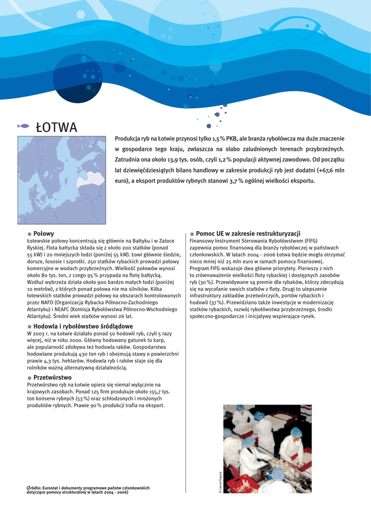 ŁOTWA Produkcja ryb na Łotwie przynosi tylko 1,5% PKB, ale branża rybołówcza ma duże znaczenie w gospodarce tego kraju, zwłaszcza na słabo zaludnionych terenach przybrzeżnych. Zatrudnia ona około 13,9 tys. osób, czyli 1,2% populacji aktywnej zawodowo. Od początku lat dziewięćdziesiątych bilans handlowy w zakresie produkcji ryb jest dodatni (+67,6 mln euro), a eksport produktów rybnych stanowi 3,7 % ogólnej wielkości eksportu. Połowy Łotewskie połowy koncentrują się głównie na Bałtyku i w Zatoce Ryskiej. Flota bałtycka składa się z około 200 statków (ponad 55 kW) i 20 mniejszych łodzi (poniżej 55 kW). Łowi głównie śledzie, dorsze, łososie i szprotki. 250 statków rybackich prowadzi połowy komercyjne w wodach przybrzeżnych. Wielkość połowów wynosi około 80 tys. ton, z czego 95 % przypada na flotę bałtycką. Wzdłuż wybrzeża działa około 900 bardzo małych łodzi (poniżej 10 metrów), z których ponad połowa nie ma silników. Kilka łotewskich statków prowadzi połowy na obszarach kontrolowanych przez NAFO (Organizacja Rybacka Północno-Zachodniego Atlantyku) i NEAFC (Komisja Rybołówstwa Północno-Wschodniego Atlantyku). Średni wiek statków wynosi 26 lat. Pomoc UE w zakresie restrukturyzacji Finansowy Instrument Sterowania Rybołówstwem (FIFG) zapewnia pomoc finansową dla branży rybołówczej w państwach członkowskich. W latach 2004 - 2006 Łotwa będzie mogła otrzymać nieco mniej niż 25 mln euro w ramach pomocy finansowej. Program FIFG wskazuje dwa główne priorytety. Pierwszy z nich to zrównoważenie wielkości floty rybackiej i dostępnych zasobów ryb (30 %). Przewidywane są premie dla rybaków, którzy zdecydują się na wycofanie swoich statków z floty. Drugi to ulepszenie infrastruktury zakładów przetwórczych, portów rybackich i hodowli (37 %). Przewidziano także inwestycje w modernizację statków rybackich, rozwój rybołówstwa przybrzeżnego, środki społeczno-gospodarcze i inicjatywy wspierające rynek. Hodowla i rybołówstwo śródlądowe W 2003 r. na Łotwie działało ponad 50 hodowli ryb, czyli 5 razy więcej, niż w roku 2000. Główny hodowany gatunek to karp, ale popularność zdobywa też hodowla raków. Gospodarstwa hodowlane produkują 430 ton ryb i obejmują stawy o powierzchni prawie 4,3 tys. hektarów. Hodowla ryb i raków staje się dla rolników ważną alternatywną działalnością. Przetwórstwo (Źródło: Eurostat i dokumenty programowe państw członkowskich dotyczące pomocy strukturalnej w latach 2004 - 2006) © Lionel Flageul Przetwórstwo ryb na Łotwie opiera się niemal wyłącznie na krajowych zasobach. Ponad 125 firm produkuje około 155,7 tys. ton konserw rybnych (53 %) oraz schłodzonych i mrożonych produktów rybnych. Prawie 90 % produkcji trafia na eksport.