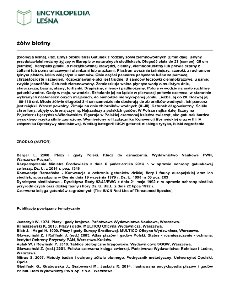 żółw błotny (zoologia leśna), (łac. Emys orbicularis) Gatunek z rodziny żółwi ziemnowodnych (Emididae), jedyny przedstawiciel rodziny żyjący w Europie w naturalnych siedliskach. Długość ciała do 23 (samce) -25 cm (samice). Karapaks gładki, o nieząbkowanej krawędzi, ciemny, ciemnobrunatny lub prawie czarny z żółtymi lub pomarańczowymi plamkami lub prążkami. Plastron wyraźnie jaśniejszy, szeroki, z ruchomym tylnym płatem, lekko wklęsłym u samców. Obie części pancerza połączone luźno za pomocą chrzęstozrostu i ścięgien. Rozpoznawanie płci jest trudne. U samców tęczówki ciemnobrązowe, u samic zwykle jasnożółte. Gatunek ziemnowodny. Zamieszkuje wolno płynące wody o mulistym dnie, starorzecza, bagna, stawy, torfianki. Drapieżny, mięso- i padlinożerny. Poluje w wodzie na mało ruchliwe gatunki wodne. Gody w maju, w wodzie. Składanie jaj na lądzie w pierwszej połowie czerwca, w starannie wybranych nasłonecznionych miejscach, do samodzielnie wykopanej jamki. Liczba jaj do 20. Rozwój jaj 100-110 dni. Młode żółwie długości 3-4 cm samodzielnie docierają do zbiorników wodnych. Ich pancerz jest miękki. Wzrost powolny. Zimuje na dnie zbiorników wodnych (XI-III). Gatunek długowieczny. Ściśle chroniony, objęty ochroną czynną. Najrzadszy z polskich gadów. W Polsce najbardziej liczny na Pojezierzu Łęczyńsko-Włodawskim. Figuruje w Polskiej czerwonej księdze zwierząt jako gatunek bardzo wysokiego ryzyka silnie zagrożony. Wymieniony w II załączniku Konwencji Berneńskiej oraz w II i IV załączniku Dyrektywy siedliskowej. Według kategorii IUCN gatunek niskiego ryzyka, bliski zagrożenia. ŹRÓDŁO (AUTOR) Berger L. 2000. Płazy i gady Polski. Klucz do oznaczania. Wydawnictwo Naukowe PWN, Warszawa-Poznań. Rozporządzenie Ministra Środowiska z dnia 6 października 2014 r. w sprawie ochrony gatunkowej zwierząt. Dz. U. z 2014 r. poz. 1348 Konwencja Berneńska - Konwencja o ochronie gatunków dzikiej flory i fauny europejskiej oraz ich siedlisk, sporządzona w Bernie dnia 19 września 1979 r. Dz. U. 1996 nr 58 poz. 263 Dyrektywa siedliskowa - Dyrektywa Rady 92/43/EWG z dnia 21 maja 1992 r. w sprawie ochrony siedlisk przyrodniczych oraz dzikiej fauny i flory Dz. U. UE.L. z dnia 22 lipca 1992 r. Czerwona księga gatunków zagrożonych (The IUCN Red List of Threatened Species) Publikacje powiązane tematycznie Juszczyk W. 1974. Płazy i gady krajowe. Państwowe Wydawnictwo Naukowe, Warszawa. Klimaszewski K. 2013. Płazy i gady. MULTICO Oficyna Wydawnicza, Warszawa. Blab J. i Vogel H. 1999. Płazy i gady Europy Środkowej. MULTICO Oficyna Wydawnicza, Warszawa. Głowaciński Z. i Rafiński J. (red.) 2003. Atlas płazów i gadów Polski. Status - rozmieszczenie - ochrona. Instytut Ochrony Przyrody PAN, Warszawa-Kraków. Aulak W. i Rowiński P. 2010. Tablice biologiczne kręgowców. Wydawnictwo SGGW, Warszawa. Głowaciński Z. (red.) 2001. Polska czerwona księga zwierząt. Państwowe Wydawnictwo Rolnicze i Leśne, Warszawa. Mitrus S. 2007. Metody badań i ochrony żółwia błotnego. Podręcznik metodyczny. Uniwersytet Opolski, Opole. Gierliński G., Grabowska J., Grabowski M., Jaskuła R. 2014. Ilustrowana encyklopedia płazów i gadów Polski. Dom Wydawniczy PWN Sp. z o.o., Warszawa.