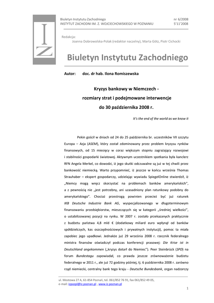 Biuletyn Instytutu Zachodniego INSTYTUT ZACHODNI IM. Z. WOJCIECHOWSKIEGO W POZNANIU nr 6/2008 5’11’2008 Redakcja: Joanna Dobrowolska-Polak (redaktor naczelny), Marta Götz, Piotr Cichocki Biuletyn Instytutu Zachodniego Autor: doc. dr hab. Ilona Romiszewska Kryzys bankowy w Niemczech rozmiary strat i podejmowane interwencje do 30 października 2008 r. It’s the end of the world as we know it Pekin gościł w dniach od 24 do 25 października br. uczestników VII szczytu Europa – Azja (ASEM), który został zdominowany przez problem kryzysu rynków finansowych, od 15 miesięcy w coraz większym stopniu zagrażający rozwojowi i stabilności gospodarki światowej. Aktywnym uczestnikiem spotkania była kanclerz RFN Angela Merkel, co dowodzi, iż jego skutki odczuwalne są już w tej chwili przez bankowośd niemiecką. Warto przypomnied, iż jeszcze w koocu września Thomas Strauhaber – ekspert gospodarczy, udzielając wywiadu SpiegelOnline stwierdził, iż „Niemcy mogą wręcz skorzystad na problemach banków amerykaoskich”, a z pewnością nie „jest potrzebny, ani uzasadniony plan ratunkowy podobny do amerykaoskiego”. Chociaż przestrogą powinien przecież byd już ratunek IKB Deutsche Industrie Bank AG, wyspecjalizowanego w długoterminowym finansowaniu przedsiębiorstw, mieszczących się w kategorii „średniej wielkości”, o ustabilizowanej pozycji na rynku. W 2007 r. zostało przekazanych praktycznie z budżetu paostwa 4,8 mld € (dodatkowy miliard euro wpłynął od banków spółdzielczych, kas oszczędnościowych i prywatnych instytucji), pomoc ta miała zapobiec jego upadkowi. Jednakże już 29 września 2008 r. rzecznik federalnego ministra finansów oświadczył podczas konferencji prasowej: Die Krise ist in Deutschland angekommen („kryzys dotarł do Niemiec”). Peer Steinbrück (SPD) na forum Bundestagu zapowiadał, co prawda jeszcze zrównoważenie budżetu federalnego w 2011 r., ale już 72 godziny później, tj. 6 października 2008 r. zarówno rząd niemiecki, centralny bank tego kraju - Deutsche Bundesbank, organ nadzorczy ul. Mostowa 27 A, 61-854 Poznao, tel. 061/852 76 91, fax 061/852 49 05, e-mail: [email protected] , www.iz.poznan.pl 1 Biuletyn Instytutu Zachodniego INSTYTUT ZACHODNI IM. Z. WOJCIECHOWSKIEGO W POZNANIU nr 6/2008 5’11’2008 sprawujący nadzór nad instytucjami finansowymi - Bundesanstalt Finanzaufsicht wraz z niemieckimi bankami oraz firmami ubezpieczeniowymi zostały zmuszone do uruchomienia w trybie nadzwyczajnym linii kredytowej i przyznania gwarancji z powodu utraty płynności szacowanej na 35 mld € jednej z 30 niemieckich spółek uwzględnianych w niemieckim indeksie akcji (Dax) – Hypo Real Estate Group. Problemy koncernu utożsamiano z kłopotami przejętej parę miesięcy wcześniej irlandzkiej spółki - DEPFA Bank pcl. Jest ona największym bankiem na świecie, specjalizującym się w finansowaniu paostw, nieruchomości przemysłowych i projektów infrastrukturalnych i jednym z największych emitentów listów zastawnych, w tym także tzw. Jumbo. Są to instrumenty finansowe obdarzane do tej pory olbrzymim zaufaniem przez inwestorów, a wykorzystywane były jako zabezpieczenie dla realizowanych przez nich transakcji. Dlatego też jej upadek oznaczałby z kolei koniecznośd dokonania odpisów w wielu innych instytucjach. Gdy 8 października Deutsche Bundesbank obniżył wraz z największymi bankami centralnymi Europy i Stanów Zjednoczonych cenę kredytu dla banków komercyjnych to okazało się, iż interwencja ta nie była już w stanie uspokoid rynków finansowych. Dramatyczne dla wielu instytucji kredytowych wydarzenia, które miały miejsce w następnych dniach naruszyły niemiecki system bankowy, a także zaufanie jakim obdarzali go uczestnicy rynku oraz obowiązujące na nim regulacje prawne. Wśród nich szczególne znaczenie miał upadek jednej z amerykaoskich ikon gospodarki - banku inwestycyjnego Lehman Brothers, partnera handlowego wielu, w tym największych niemieckich banków. Ich konsekwencje i to zarówno dla systemu bankowego, jak i realnej gospodarki są w dniu dzisiejszym trudne do oszacowania, zwłaszcza iż nadal informacje pochodząc ze świata finansów są niezwykle powściągliwie formułowane. Zrozumiałe są również starania podejmowane przez władze mające przyczynid się do uspokojenia nastrojów w kraju. Należy podkreślid, iż proces „infekowania” rynków narodowych kolejnych paostw dowodzi daleko idących powiązao instytucji finansowych, możliwych dzięki liberalizacji przepływów kapitałowych, globalizacji i fascynacji nowymi instrumentami finansowymi. Banki niemieckie stosunkowo późno, gdyż dopiero w latach siedemdziesiątych ubiegłego wieku, rozpoczęły aktywnie rozbudowywad międzynarodową działalnośd i to zarówno dzięki spółkom „córkom”, jak i oddziałom, a od czasów utworzenia jednolitego rynku UE w coraz większym zakresie także transgranicznie. Brytyjski bank centralny oszacował straty z tytułu kryzysu finansowego w całej gospodarce światowej na 3 biliony $. Jaka częśd z tej kwoty ul. Mostowa 27 A, 61-854 Poznao, tel. 061/852 76 91, fax 061/852 49 05, e-mail: [email protected] , www.iz.poznan.pl 2 Biuletyn Instytutu Zachodniego INSTYTUT ZACHODNI IM. Z. WOJCIECHOWSKIEGO W POZNANIU nr 6/2008 5’11’2008 przypadnie na RFN nie jest do tej pory wiadomo, można jednak powoład się na cząstkowe dane, i tak np. Deutsche Bank i to tylko do kooca października zmuszony jest uporad się ze stratami poniesionymi z tytułu kryzysu finansowego z obciążeniem bilansu w wysokości 7 mld €. Szacuje się, iż około 20 niemieckich banków inwestowało w strukturyzowane produkty. Warto zaznaczyd, iż przyczyny powstania tak znaczących strat nie odbiegają od identyfikowanych w innych paostwach. U podstaw leżało dążenie do uzyskiwania przez banki wysokiej rentowności, wyższej niż uzyskiwanej dzięki realizacji klasycznych operacji bankowych (gr
