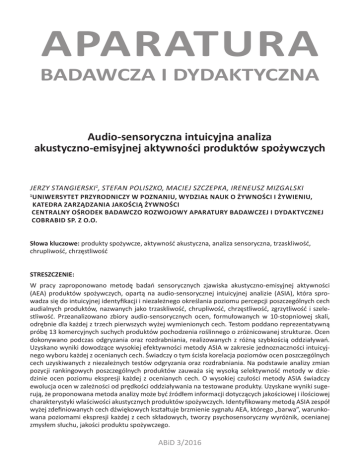 APARATURA BADAWCZA I DYDAKTYCZNA Audio-sensoryczna intuicyjna analiza akustyczno-emisyjnej aktywności produktów spożywczych JERZY STANGIERSKI1, STEFAN POLISZKO, MACIEJ SZCZEPKA, IRENEUSZ MIZGALSKI UNIWERSYTET PRZYRODNICZY W POZNANIU, WYDZIAŁ NAUK O ŻYWNOŚCI I ŻYWIENIU, KATEDRA ZARZĄDZANIA JAKOŚCIĄ ŻYWNOŚCI CENTRALNY OŚRODEK BADAWCZO ROZWOJOWY APARATURY BADAWCZEJ I DYDAKTYCZNEJ COBRABID SP. Z O.O. 1 Słowa kluczowe: produkty spożywcze, aktywność akustyczna, analiza sensoryczna, trzaskliwość, chrupliwość, chrzęstliwość STRESZCZENIE: W pracy zaproponowano metodę badań sensorycznych zjawiska akustyczno-emisyjnej aktywności (AEA) produktów spożywczych, opartą na audio-sensorycznej intuicyjnej analizie (ASIA), która sprowadza się do intuicyjnej identyfikacji i niezależnego określania poziomu percepcji poszczególnych cech audialnych produktów, nazwanych jako trzaskliwość, chrupliwość, chrzęstliwość, zgrzytliwość i szelestliwość. Przeanalizowano zbiory audio-sensorycznych ocen, formułowanych w 10-stopniowej skali, odrębnie dla każdej z trzech pierwszych wyżej wymienionych cech. Testom poddano reprezentatywną próbę 13 komercyjnych suchych produktów pochodzenia roślinnego o zróżnicowanej strukturze. Ocen dokonywano podczas odgryzania oraz rozdrabniania, realizowanych z różną szybkością oddziaływań. Uzyskano wyniki dowodzące wysokiej efektywności metody ASIA w zakresie jednoznaczności intuicyjnego wyboru każdej z ocenianych cech. Świadczy o tym ścisła korelacja poziomów ocen poszczególnych cech uzyskiwanych z niezależnych testów odgryzania oraz rozdrabniania. Na podstawie analizy zmian pozycji rankingowych poszczególnych produktów zauważa się wysoką selektywność metody w dziedzinie ocen poziomu ekspresji każdej z ocenianych cech. O wysokiej czułości metody ASIA świadczy ewolucja ocen w zależności od prędkości oddziaływania na testowane produkty. Uzyskane wyniki sugerują, że proponowana metoda analizy może być źródłem informacji dotyczących jakościowej i ilościowej charakterystyki właściwości akustycznych produktów spożywczych. Identyfikowany metodą ASIA zespół wyżej zdefiniowanych cech dźwiękowych kształtuje brzmienie sygnału AEA, którego „barwa”, warunkowana poziomami ekspresji każdej z cech składowych, tworzy psychosensoryczny wyróżnik, ocenianej zmysłem słuchu, jakości produktu spożywczego. ABiD 3/2016 147 An audio-sensory intuitive analysis of the acoustic emission activity of food products Keywords: food products, acoustic activity, sensory analysis, crackliness, crispness, crunchiness ABSTRACT: The study proposes a method of sensory testing of the acoustic emission activity (AEA) of food products based on an audio-sensory intuitive analysis (ASIA). It consists in intuitive identification and independent determination of the degree of perception of individual audial traits of products, which are defined as crackliness, crispness, crunchiness, grinding and rustling effect. We analysed sets of audio-sensory ratings formulated in a 10-point scale, individually for each of the first three traits mentioned above. We tested a representative sample of 13 commercially available dry products of plant origin with a diversified structure. The products were assessed during biting and crushing at different rates. The results proved high effectiveness of the ASIA method in terms of unambiguity of the intuitive choice of each of the traits rated. This fact was confirmed by close correlation between the ratings of individual traits in independent biting and crushing tests. The analysis of variation in the ranking positions of individual products shows high selectiveness of the method in assessing the rate of expression of each of the traits under study. High sensitivity of the ASIA method is proved by the evolution of assessments depending on rate of exerting effect on the products tested. The research findings suggest that the proposed method of analysis could be a source of information concerning qualitative and quantitative characterisation of acoustic properties of food products. The set of acoustic traits defined above and identified by means of the ASIA method makes the sound of the AEA signal. Its ‘tone’ depends on the degree of expression of each of the constituent traits and makes a psychosensory determinant of a food product quality assessed with the sense of hearing. 1. WPROWADZENIE Produkty spożywcze o zauważalnej akustyczno-emisyjnej aktywności (AEA), potocznie określane jako „chrupiące”, na ogół kojarzą się konsumentom bardzo pozytywnie ze zdrowym, świeżym jedzeniem, zaś brak tej cechy sugeruje złą jakość i często oznacza utratę konsumenckiej akceptacji [19, 23]. Te atawistyczne upodobania i reakcje wykorzystują na szeroką skalę producenci różnych przekąsek i półproduktów (chipsy, krakersy, herbatniki, grzanki, musli itp.), których podstawowymi atrybutami jakości wydają się być odpowiednie wskaźniki AEA. Trwające od ponad 30 lat prace, zmierzające do sformułowania uniwersalnych w skali światowej nazw i definicji wskaźników sensorycznych AEA produktów spożywczych, nie dały w pełni zadowalających wyników [2, 7, 18], głównie ze względu na międzynarodowe zróżnicowania kulturowe i językowe [21, 22]. Najbardziej zaawansowane prace nad systemem sensorycznej oceny właściwości akustyczno-emisyjnych produktów spożywczych zauważa się w anglojęzycznej literaturze przedmiotu, gdzie 147 148 powszechnie stosuje się określenia crispness, crunchiness oraz crackliness, które traktuje się jako pożądane przez konsumentów atrybuty jakościowe nie tylko „suchych”, ale i „mokrych” (owoce, warzywa) artykułów żywnościowych [5, 7, 9, 10]. W związku z powyższym, głównie z uwagi na potrzeby szkoleniowe w zakresie sensorycznych testów jakości żywności, powstało wiele opracowań zmierzających do opisowego