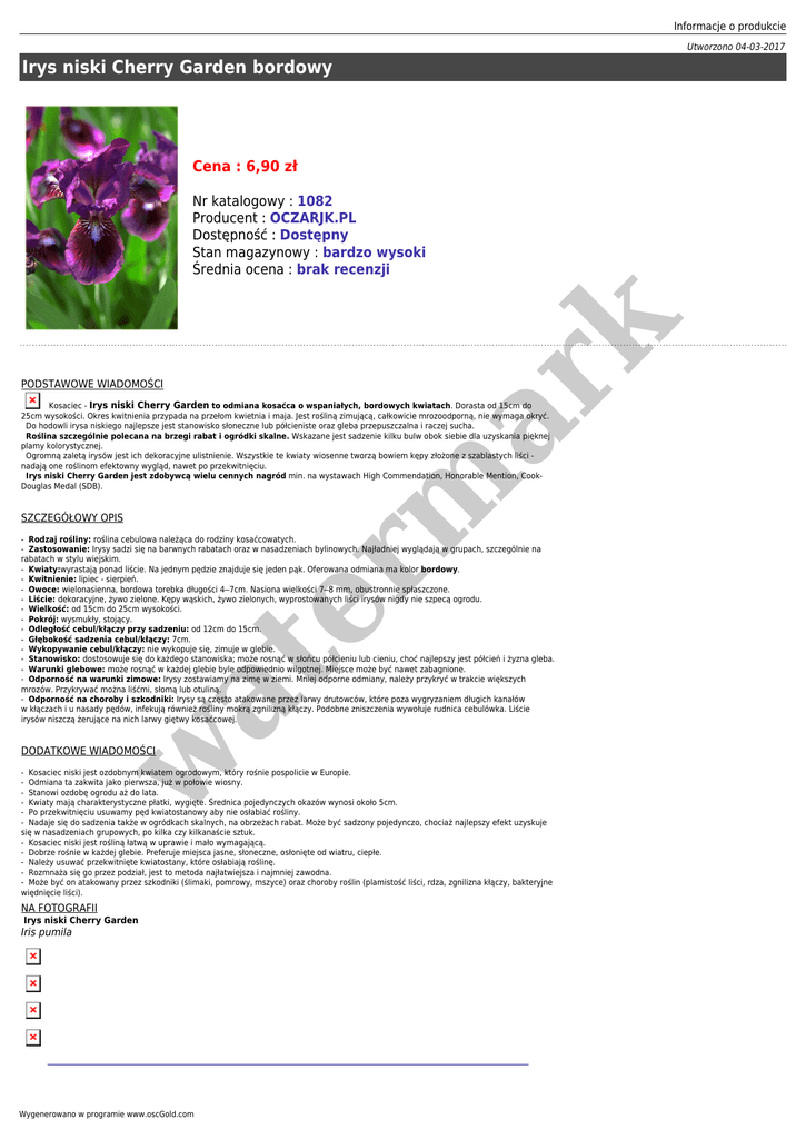 Informacje o produkcie Utworzono 04-03-2017 Irys niski Cherry Garden bordowy Cena : 6,90 zł PODSTAWOWE WIADOMOŚCI er m ar k Nr katalogowy : 1082 Producent : OCZARJK.PL Dostępność : Dostępny Stan magazynowy : bardzo wysoki Średnia ocena : brak recenzji Kosaciec - Irys niski Cherry Garden to odmiana kosaćca o wspaniałych, bordowych kwiatach. Dorasta od 15cm do 25cm wysokości. Okres kwitnienia przypada na przełom kwietnia i maja. Jest rośliną zimującą, całkowicie mrozoodporną, nie wymaga okryć. Do hodowli irysa niskiego najlepsze jest stanowisko słoneczne lub półcieniste oraz gleba przepuszczalna i raczej sucha. Roślina szczególnie polecana na brzegi rabat i ogródki skalne. Wskazane jest sadzenie kilku bulw obok siebie dla uzyskania pięknej plamy kolorystycznej. Ogromną zaletą irysów jest ich dekoracyjne ulistnienie. Wszystkie te kwiaty wiosenne tworzą bowiem kępy złożone z szablastych liści nadają one roślinom efektowny wygląd, nawet po przekwitnięciu. Irys niski Cherry Garden jest zdobywcą wielu cennych nagród min. na wystawach High Commendation, Honorable Mention, CookDouglas Medal (SDB). SZCZEGÓŁOWY OPIS at - Rodzaj rośliny: roślina cebulowa należąca do rodziny kosaćcowatych. - Zastosowanie: Irysy sadzi się na barwnych rabatach oraz w nasadzeniach bylinowych. Najładniej wyglądają w grupach, szczególnie na rabatach w stylu wiejskim. - Kwiaty:wyrastają ponad liście. Na jednym pędzie znajduje się jeden pąk. Oferowana odmiana ma kolor bordowy. - Kwitnienie: lipiec - sierpień. - Owoce: wielonasienna, bordowa torebka długości 4–7cm. Nasiona wielkości 7–8 mm, obustronnie spłaszczone. - Liście: dekoracyjne, żywo zielone. Kępy wąskich, żywo zielonych, wyprostowanych liści irysów nigdy nie szpecą ogrodu. - Wielkość: od 15cm do 25cm wysokości. - Pokrój: wysmukły, stojący. - Odległość cebul/kłączy przy sadzeniu: od 12cm do 15cm. - Głębokość sadzenia cebul/kłączy: 7cm. - Wykopywanie cebul/kłączy: nie wykopuje się, zimuje w glebie. - Stanowisko: dostosowuje się do każdego stanowiska; może rosnąć w słońcu półcieniu lub cieniu, choć najlepszy jest półcień i żyzna gleba. - Warunki glebowe: może rosnąć w każdej glebie byle odpowiednio wilgotnej. Miejsce może być nawet zabagnione. - Odporność na warunki zimowe: Irysy zostawiamy na zimę w ziemi. Mniej odporne odmiany, należy przykryć w trakcie większych mrozów. Przykrywać można liśćmi, słomą lub otuliną. - Odporność na choroby i szkodniki: Irysy są często atakowane przez larwy drutowców, które poza wygryzaniem długich kanałów w kłączach i u nasady pędów, infekują również rośliny mokrą zgnilizną kłączy. Podobne zniszczenia wywołuje rudnica cebulówka. Liście irysów niszczą żerujące na nich larwy giętwy kosaćcowej. w DODATKOWE WIADOMOŚCI - Kosaciec niski jest ozdobnym kwiatem ogrodowym, który rośnie pospolicie w Europie. - Odmiana ta zakwita jako pierwsza, już w połowie wiosny. - Stanowi ozdobę ogrodu aż do lata. - Kwiaty mają charakterystyczne płatki, wygięte. Średnica pojedynczych okazów wynosi około 5cm. - Po przekwitnięciu usuwamy pęd kwiatostanowy aby nie osłabiać rośliny. - Nadaje się do sadzenia także w ogródkach skalnych, na obrzeżach rabat. Może być sadzony pojedynczo, chociaż najlepszy efekt uzyskuje się w nasadzeniach grupowych, po kilka czy kilkanaście sztuk. - Kosaciec niski jest rośliną łatwą w uprawie i mało wymagającą. - Dobrze rośnie w każdej glebie. Preferuje miejsca jasne, słoneczne, osłonięte od wiatru, ciepłe. - Należy usuwać przekwitnięte kwiatostany, które osłabiają roślinę. - Rozmnaża się go przez podział, jest to metoda najłatwiejsza i najmniej zawodna. - Może być on atakowany przez szkodniki (ślimaki, pomrowy, mszyce) oraz choroby roślin (plamistość liści, rdza, zgnilizna kłączy, bakteryjne więdnięcie liści). NA FOTOGRAFII Irys niski Cherry Garden Iris pumila Wygenerowano w programie www.oscGold.com DLACZEGO WARTO KUPIĆ ROŚLINY U NAS - Wszystkie cebule i kłącza staramy się dostarczać w bardzo dobrym stanie, zdrowe i zadbane. Dokładamy wszelkich starań, aby wygląd materiału sadzeniowego spełniał Państwa oczekiwania. Poza tym na większości stron naszych ofert na ostatnim zdjęciu poniżej przedstawiamy wygląd przykładowych rzeczywistych cebul oraz kłączy, aby każdy mógł zobaczyć co kupuje. - W okresie zimowym, wczesnowiosennym lub późnojesiennym możliwe są braki poszczególnych gatunków, co naturalnie związane jest z sezonem wegetacyjnym roślin. - Cebule, kłącza w ilościach jednostkowych przeważnie wysyłane są w kopertach bąbelkowych lub pudełkach kartonowych jako listy dla zminimalizowania kosztu wysyłki. W większych ilościach wysłane są jako paczki. - Kłącza irysów sprzedawane są po 1 szt. w at er m ar k KONIECZNIE ZOBACZ