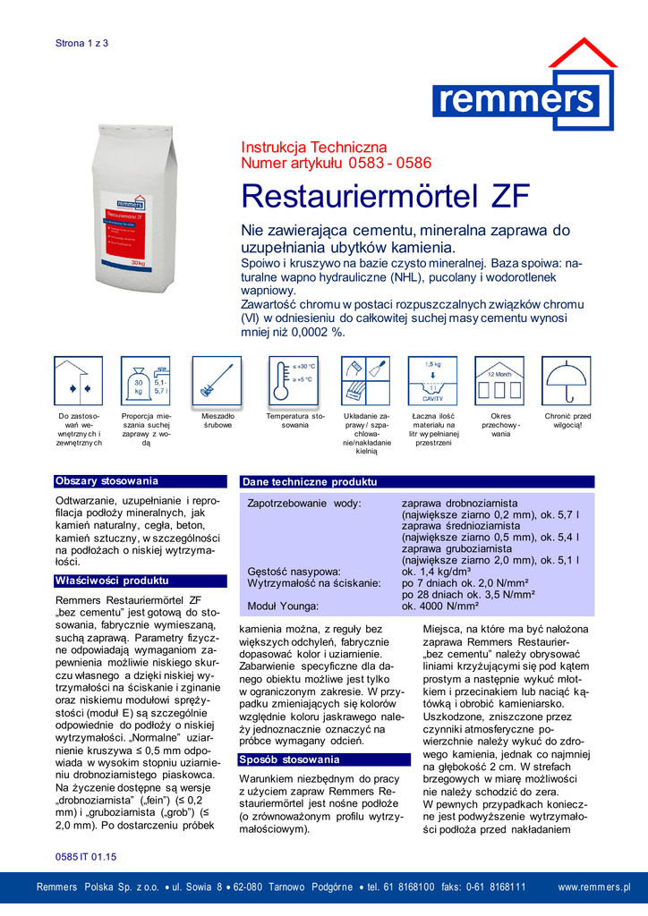 Strona 1 z 3 Instrukcja Techniczna Numer artykułu 0583 - 0586 Restauriermörtel ZF Nie zawierająca cementu, mineralna zaprawa do uzupełniania ubytków kamienia. Spoiwo i kruszywo na bazie czysto mineralnej. Baza spoiwa: naturalne wapno hydrauliczne (NHL), pucolany i wodorotlenek wapniowy. Zawartość chromu w postaci rozpuszczalnych związków chromu (VI) w odniesieniu do całkowitej suchej masy cementu wynosi mniej niż 0,0002 %. Do zastosowań wewnętrzny ch i zewnętrzny ch Proporcja mieszania suchej zaprawy z wodą Mieszadło śrubowe Obszary stosowania Odtwarzanie, uzupełnianie i reprofilacja podłoży mineralnych, jak kamień naturalny, cegła, beton, kamień sztuczny, w szczególności na podłożach o niskiej wytrzymałości. Właściwości produktu Remmers Restauriermörtel ZF „bez cementu” jest gotową do stosowania, fabrycznie wymieszaną, suchą zaprawą. Parametry fizyczne odpowiadają wymaganiom zapewnienia możliwie niskiego skurczu własnego a dzięki niskiej wytrzymałości na ściskanie i zginanie oraz niskiemu modułowi sprężystości (moduł E) są szczególnie odpowiednie do podłoży o niskiej wytrzymałości. „Normalne” uziarnienie kruszywa ≤ 0,5 mm odpowiada w wysokim stopniu uziarnieniu drobnoziarnistego piaskowca. Na życzenie dostępne są wersje „drobnoziarnista” („fein”) (≤ 0,2 mm) i „gruboziarnista („grob”) (≤ 2,0 mm). Po dostarczeniu próbek Temperatura stosowania Układanie zaprawy / szpachlowanie/nakładanie kielnią Łaczna ilość materiału na litr wy pełnianej przestrzeni Okres przechowy wania Chronić przed wilgocią! Dane techniczne produktu Zapotrzebowanie wody: Gęstość nasypowa: Wytrzymałość na ściskanie: Moduł Younga: zaprawa drobnoziarnista (największe ziarno 0,2 mm), ok. 5,7 l zaprawa średnioziarnista (największe ziarno 0,5 mm), ok. 5,4 l zaprawa gruboziarnista (największe ziarno 2,0 mm), ok. 5,1 l ok. 1,4 kg/dm³ po 7 dniach ok. 2,0 N/mm² po 28 dniach ok. 3,5 N/mm² ok. 4000 N/mm² kamienia można, z reguły bez większych odchyleń, fabrycznie dopasować kolor i uziarnienie. Zabarwienie specyficzne dla danego obiektu możliwe jest tylko w ograniczonym zakresie. W przypadku zmieniających się kolorów względnie koloru jaskrawego należy jednoznacznie oznaczyć na próbce wymagany odcień. Sposób stosowania Warunkiem niezbędnym do pracy z użyciem zapraw Remmers Restauriermörtel jest nośne podłoże (o zrównoważonym profilu wytrzymałościowym). Miejsca, na które ma być nałożona zaprawa Remmers Restaurier„bez cementu” należy obrysować liniami krzyżującymi się pod kątem prostym a następnie wykuć młotkiem i przecinakiem lub naciąć kątówką i obrobić kamieniarsko. Uszkodzone, zniszczone przez czynniki atmosferyczne powierzchnie należy wykuć do zdrowego kamienia, jednak co najmniej na głębokość 2 cm. W strefach brzegowych w miarę możliwości nie należy schodzić do zera. W pewnych przypadkach konieczne jest podwyższenie wytrzymałości podłoża przed nakładaniem 0585 IT 01.15 Remmers Remmers Polska Sp. Sp. z o.o. o.o. ul. ul. Sowia Sowia 88 62-080 62-080 Tarnowo Tarnowo Podgór Podgórne ne tel. tel. 61 0-618168100 8168100faks: fax:0-61 0-618168111 8168111 www.remm s.pl.pl www.remmerers Strona 2 z 3 zaprawy renowacyjnej. Można to osiągnąć przez wykonanie fachowego i odpowiednio określonego wzmocnienia podłoża z zastosowaniem preparatów wzmacniających kamień opartych na estrach kwasu krzemowego z grupy Remmers Steinfestiger względnie Remmers KSE. W razie potrzeby należy przewidzieć wstępną impregnację preparatem Remmers Antihygro (art. 0616). Konserwatorskie przygotowanie kamieniarskie: W przypadku ozdób architektonicznych lub rzeźb o dużej wartości artystycznej lub historycznej, należy możliwie ograniczyć wykuwanie miejsc uszkodzonych w celu zachowania oryginału. Należy w tym przypadku zakonserwować istniejący stan przez staranne wzmocnienie. Późniejsze przygotowanie podłoża polega jedynie na usunięciu „luźnych” fragmentów. Jedynie w przypadku bardzo wystających elementów budowlanych, jak gzymsy itp. powinno się zastosować zbrojenie w formie gwiazdowych dybli lub prętów ze stali nierdzewnej. Zbrojenie można zakotwić dyblami z tworzywa sztucznego lub zagęszczoną żywicą Epoxy BH 100 (art. 0905). Nakładanie zaprawy renowacyjnej: W przypadku głębokich ubytków, wymagane jest wykonanie wielowarstwowego rdzenia z zaprawy podkładowej Remmers Grundiermörtel „miękka” („weich” – art. 0638). Miejsca przeznaczone do wykonania prac należy przedmuchać sprężonym powietrzem, dobrze wstępnie zmoczyć i pokryć zaprawą Remmers Restauriermörtel ZF„bez cementu” w konsystencji szlamu; na świeżą warstwę szlamu nakłada się natychmiast zaprawę Remmers Restauriermörtel ZF „bez cementu” w konsystencji plastycznej (zależnie od wielkości ziarna 17 - 19% wody zarobowej w stosunku do ilości suchej zaprawy), tak aby warstwa zaprawy wystawała 2-5 mm powyżej otaczającego kamienia. Należy koniecznie zachować układ spoin muru! Lekko związaną zaprawę Remmers Restauriermörtel ZF „bez cementu” przeciera się na- stępnie pacą pokrytą porowatą gumą a po wystarczającym związaniu (gdy ziarno wyskakuje przy przeciągnięciu cykliną) poddaje obróbce kamieniarskiej w celu dopasowania do oryginalnej powierzchni kamienia. Doświadczenie pokazuje, że nigdy nie powinno się nakładać grubszych warstw zaprawy renowacyjnej (maks. 3 cm). Zaleca się pozostawiać wymieszaną zaprawę na kilka minut (czas dojrzewania), a potem jeszcze raz wymieszać. Wskazówki Stężałej zaprawy nie wolno ponownie zarabiać dodając wody lub świeżej zaprawy. Nie stosować przy temperaturach podłoża, powietrza i materiału poniżej 5° i powyżej 30°C. Podane parametry produktu zostały oznaczone w warunkach laboratoryjnych, w temp. 20°C i przy wilgotności względnej powietrza 65%. Niższe temperatury wydłu